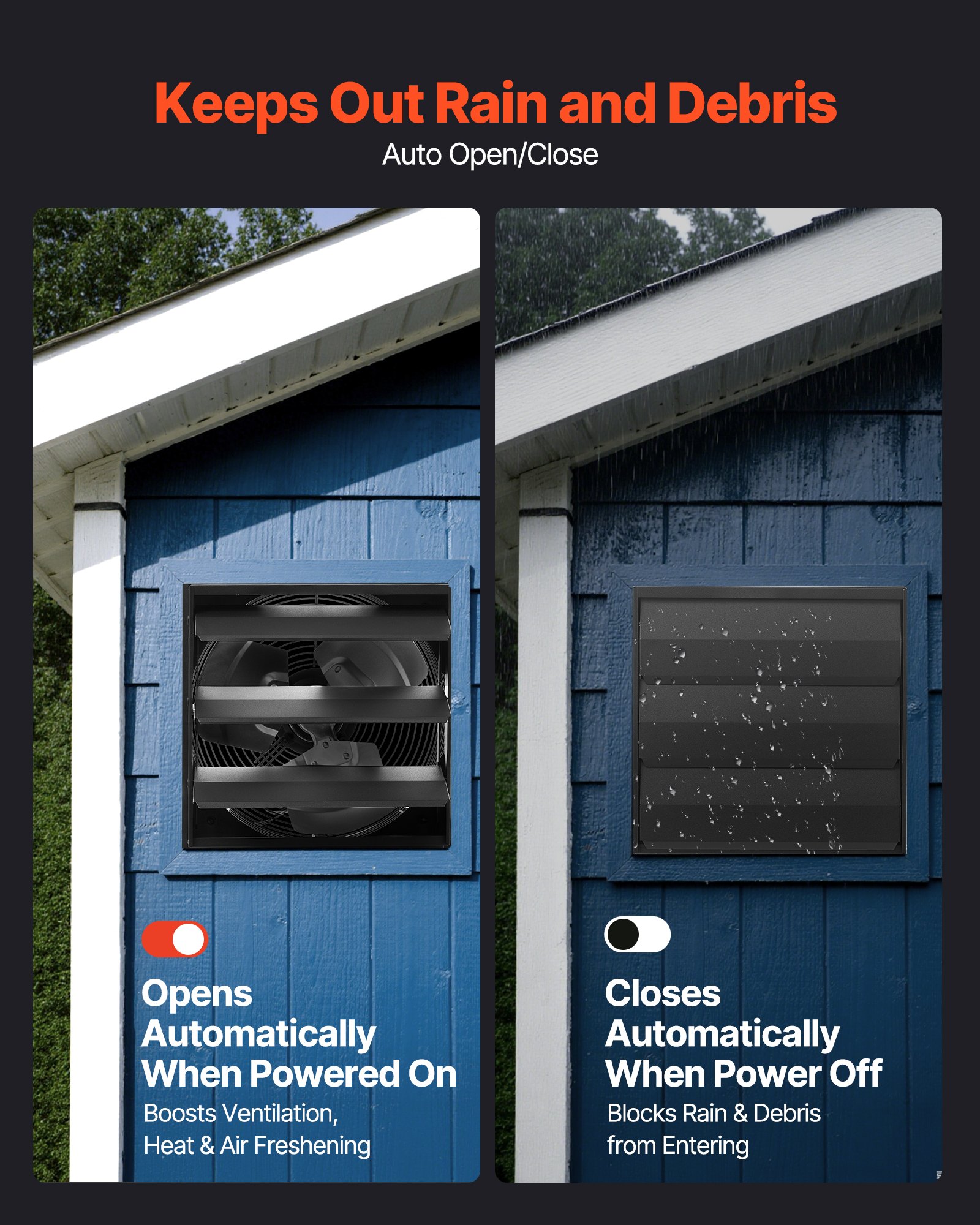 Rapid Venting: This shutter exhaust fan delivers 2000 CFM to quickly expel stale air, floating dirt, heat, and smells, keeping indoor air fresh. Also works as a high-airflow exhaust fan for sheds and workshops