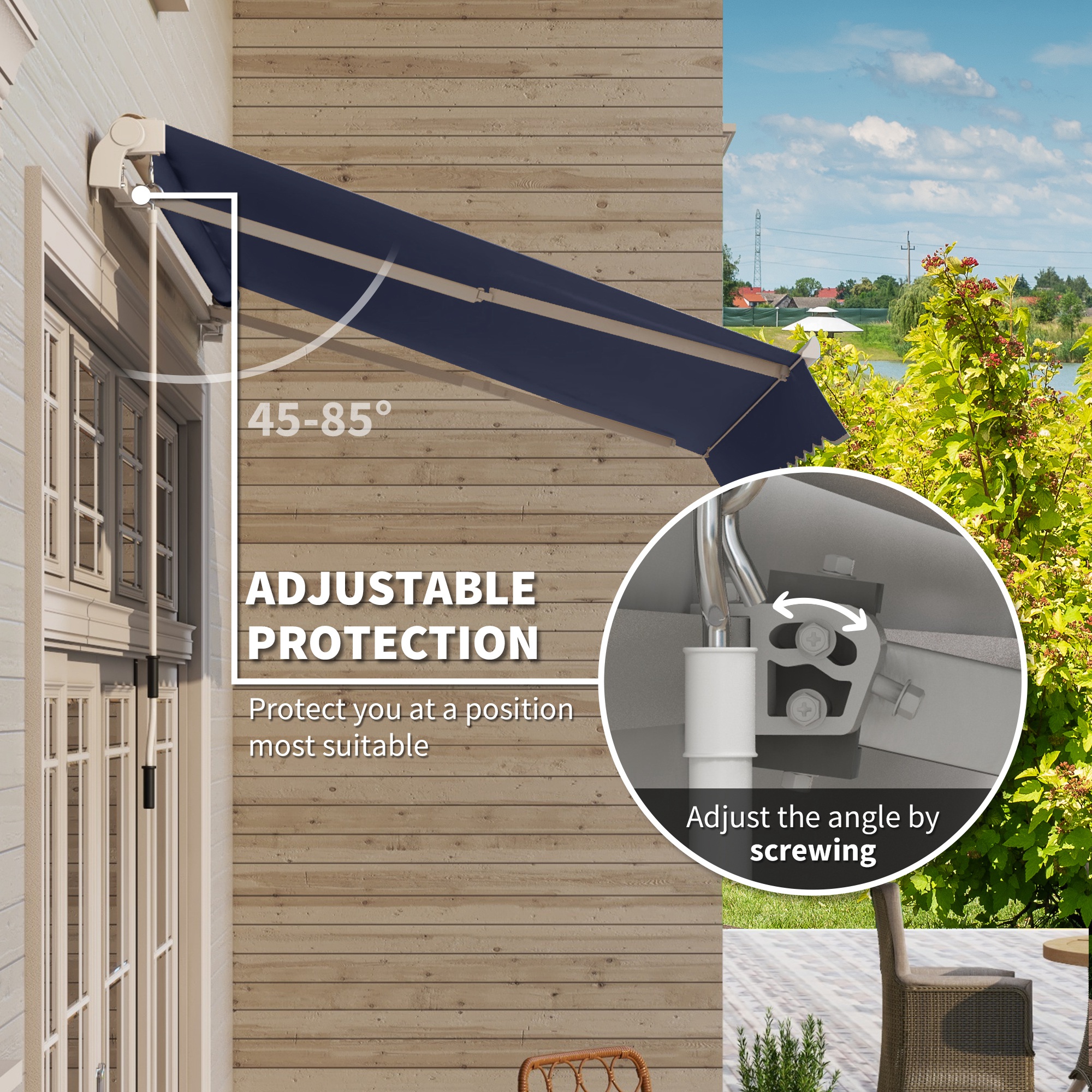 - Adjustable Protection: You can adjust the height of the extension arm on the telescopic rod by loosening the locking screw, which can provide you with better shade and the height of the retractable awning ends can also be adjusted.