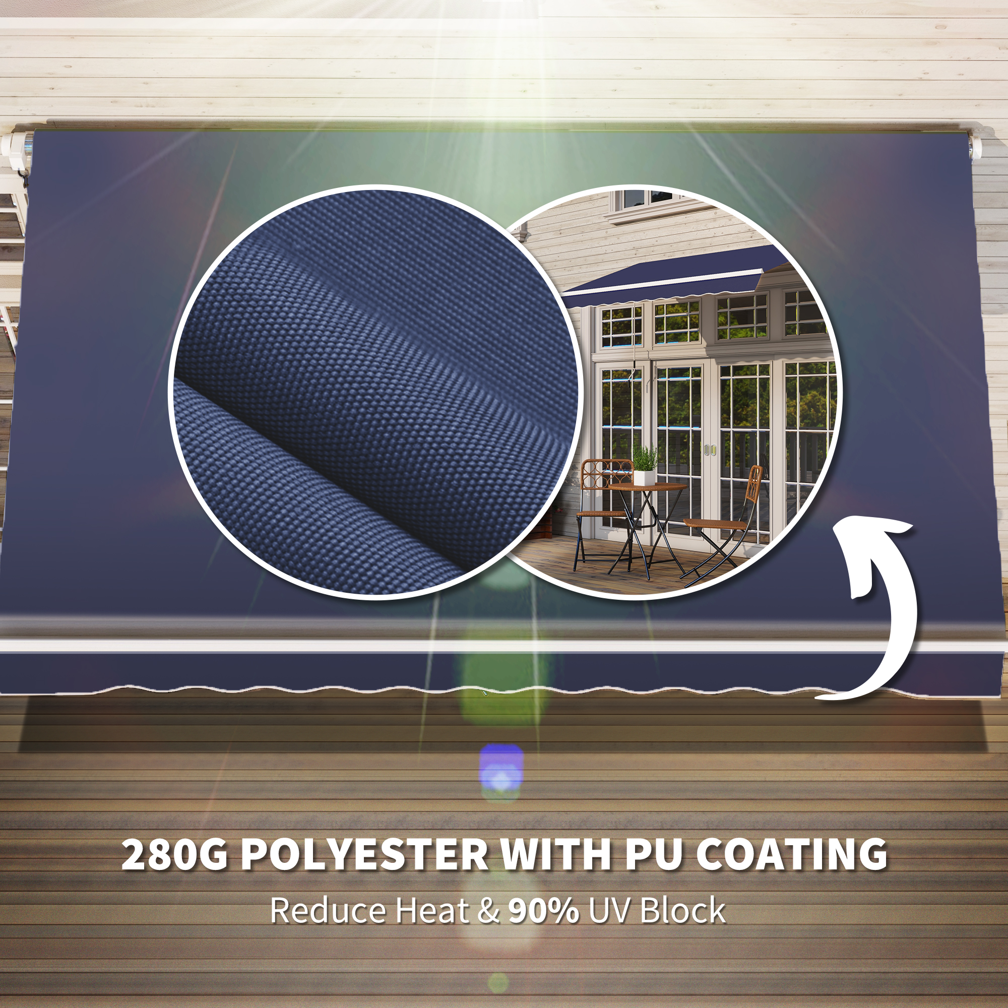 - Heat Reducing Awning: Protect your home from the sun's damaging UV rays with our deck awning. NOTE: Our awning is designed for sun protection and light rain; large amounts of rain can pool on the fabric and cause damage.)