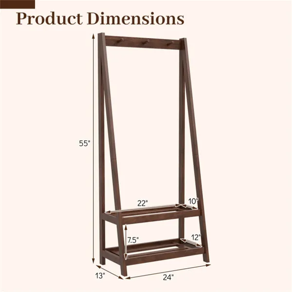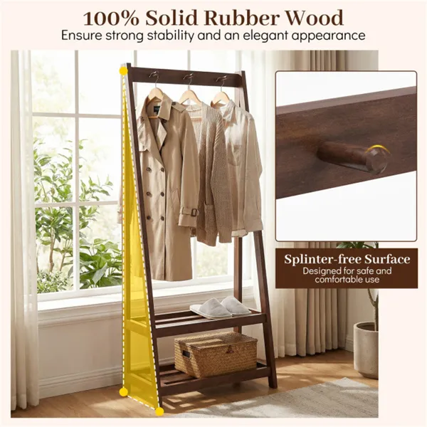 100% Solid Rubber Wood Freestanding Coat Rack, A-Frame Stable Garment Hanger With 3 Hooks & 2 Shelves