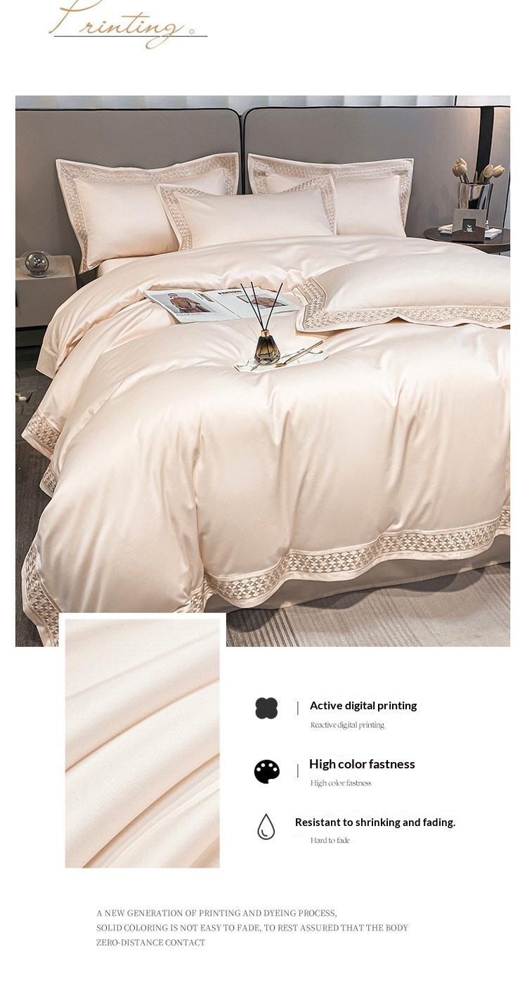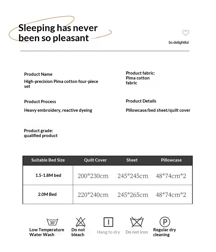 Size specification: 1.8m bed: quilt cover 200X230 bed sheet four-piece set, 2.0 m bed: quilt cover 220X240 bed sheet four-piece set, 1.8m bed sheet: quilt cover 200X230 four-piece set, 1.8m fitted bed sheet: quilt cover 220X240 four-piece set