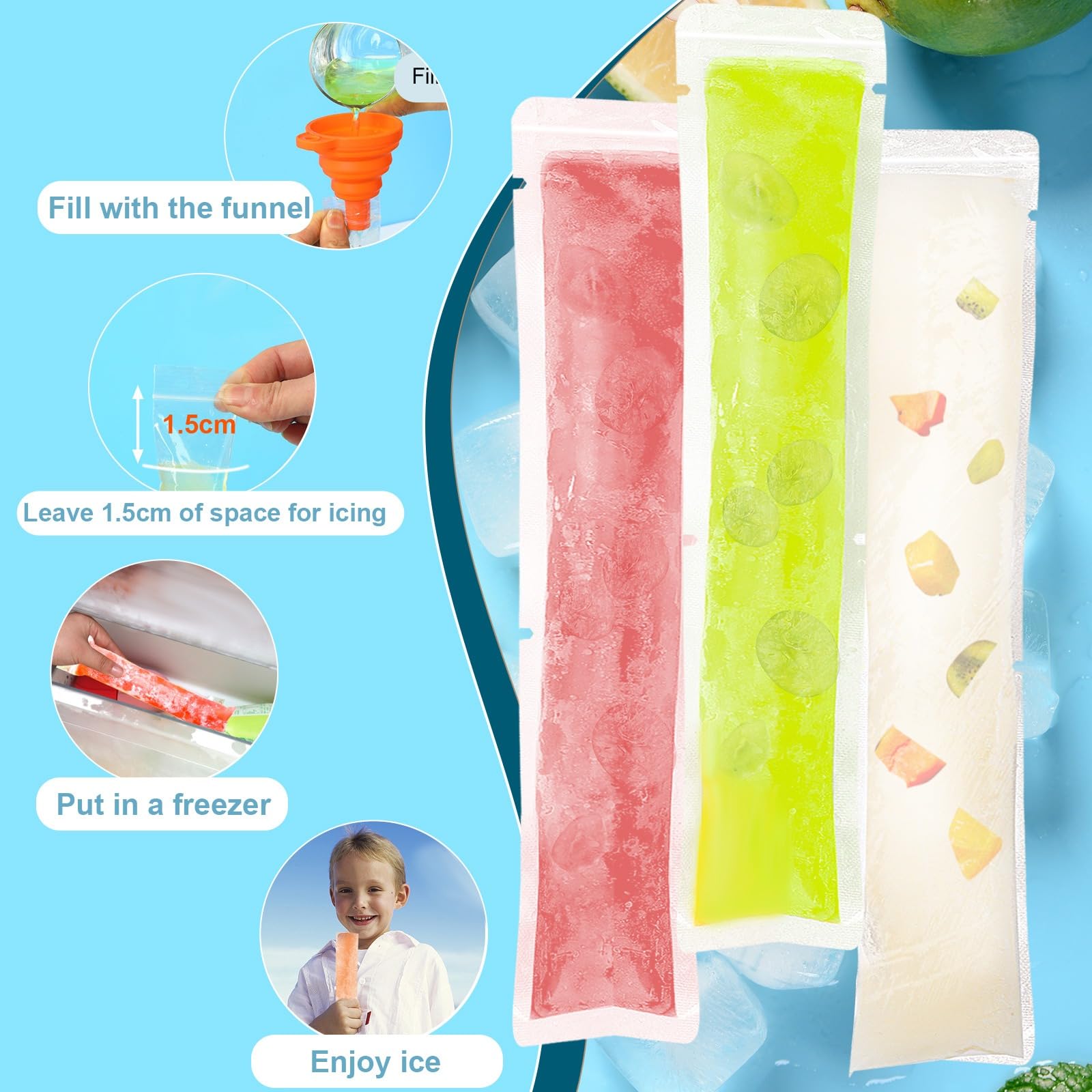 Freezer pop bags come with zipper seal, which provide you with convenient sealing method, and good sealing will keep your refrigerator clean and tidy. You just need to tear ice pop bags from the opening to eat, and you don't need to open the sealed zipper