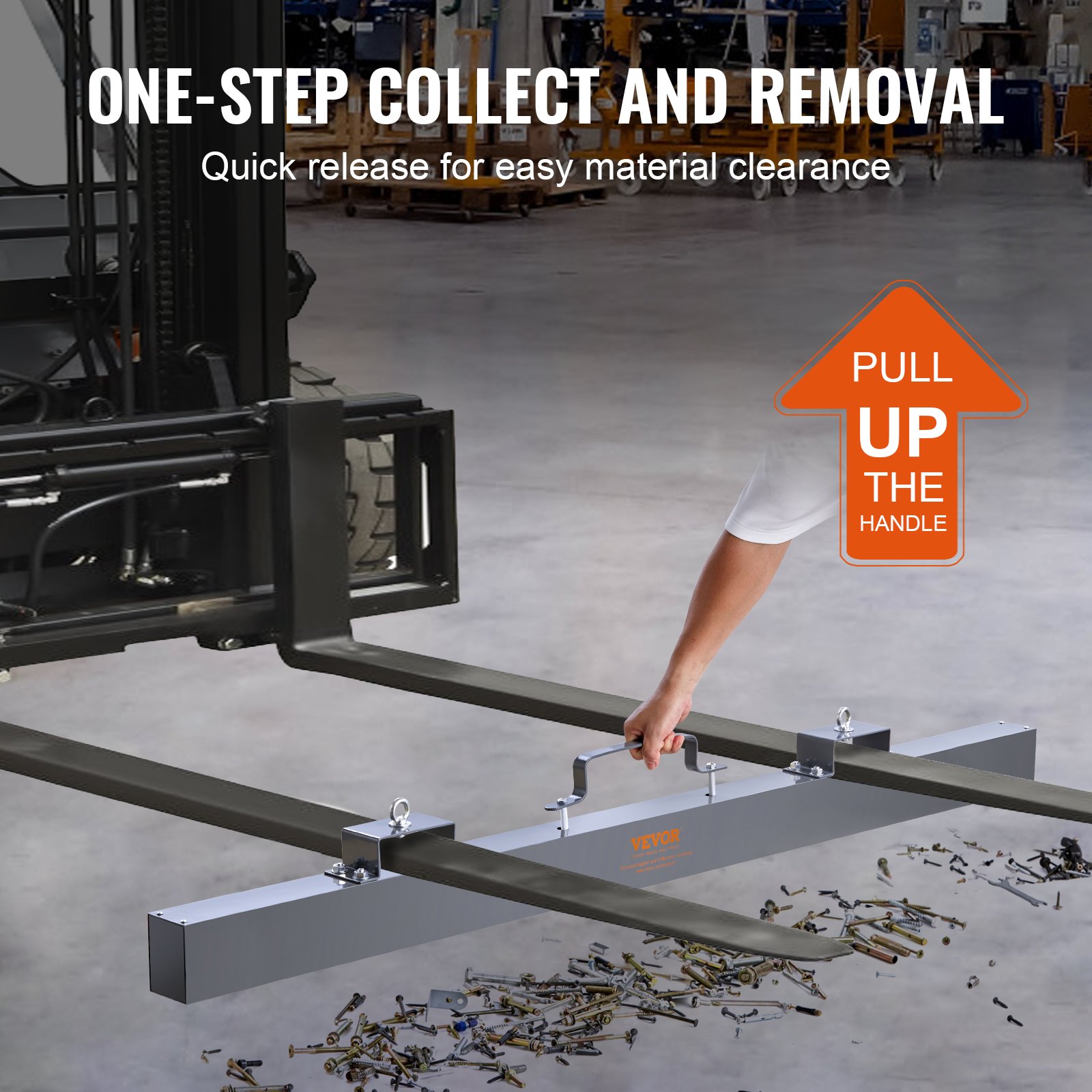 Effortless Operation: Attaching the magnetic sweeper to a forklift using the sturdy handles and eye bolts enables effortless clearing of pathways and areas. By efficiently picking up nails and other sharp metals, it significantly reduces the time and effort required for manual cleaning. The sweeper glides smoothly over surfaces, swiftly collecting debris and ensuring a clean and hazard-free environment.