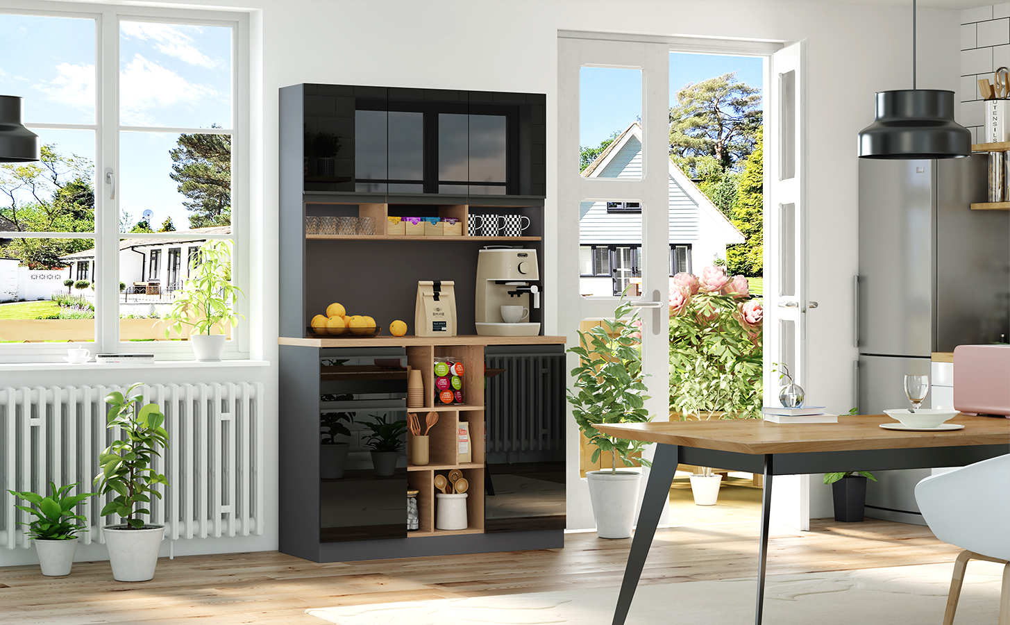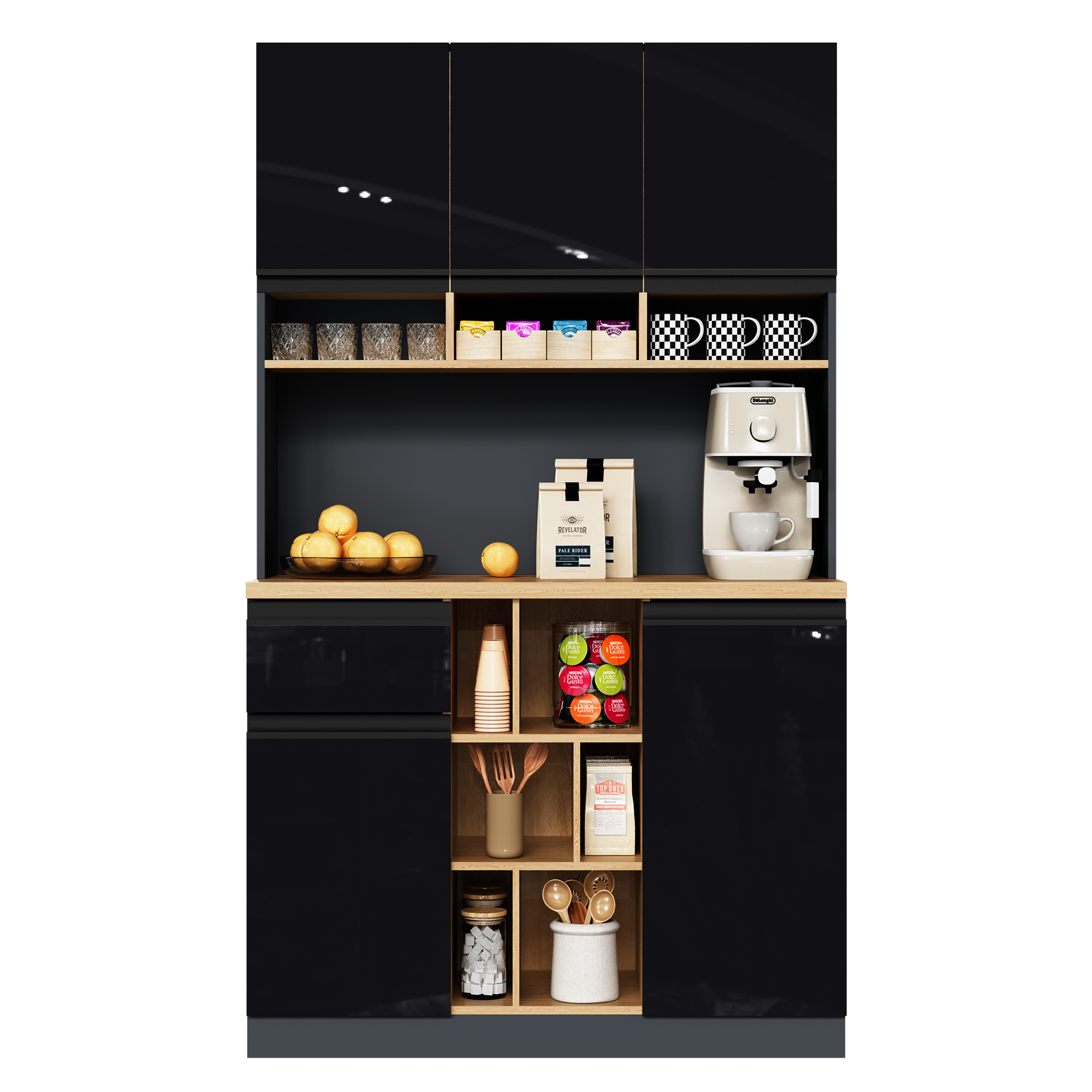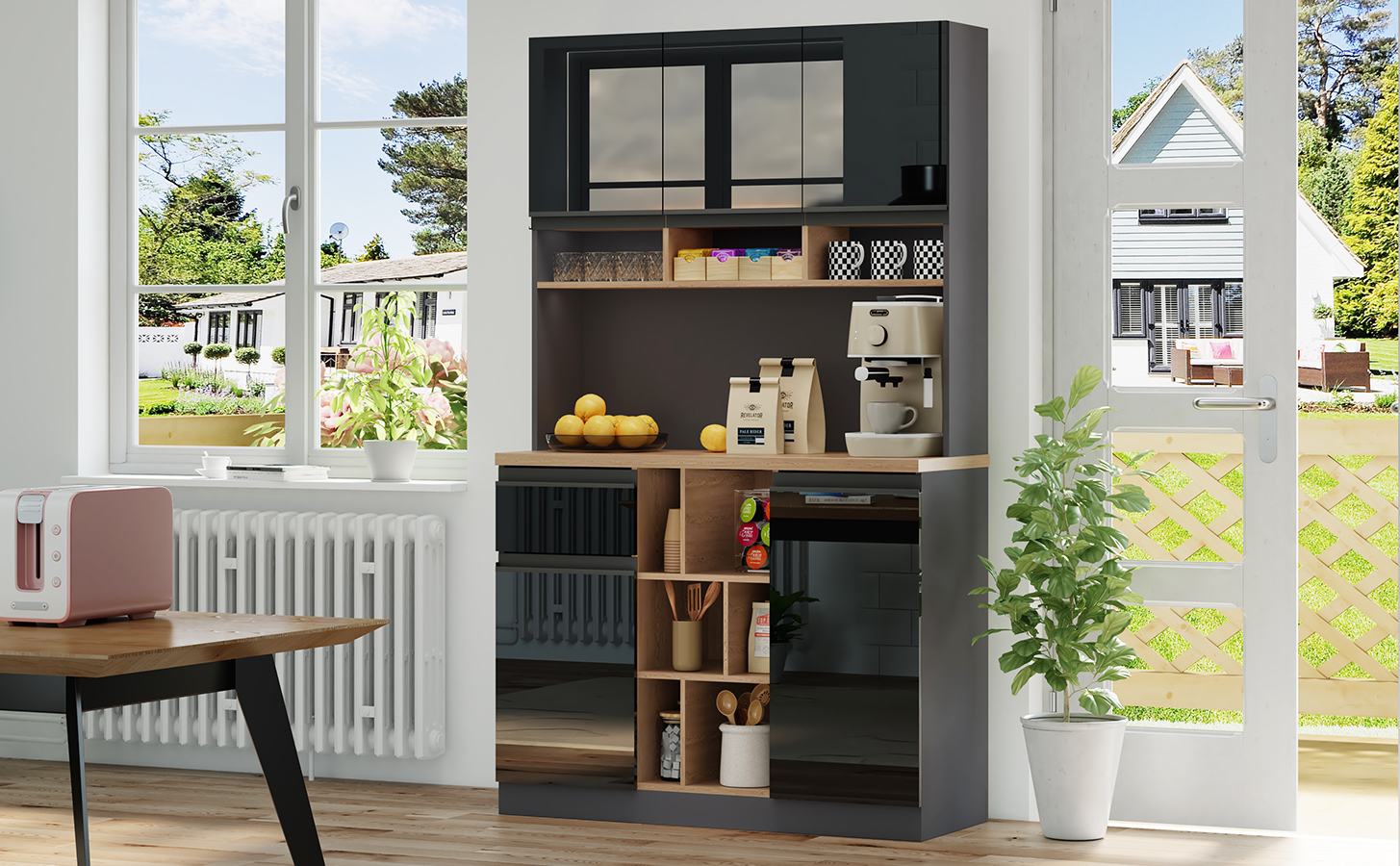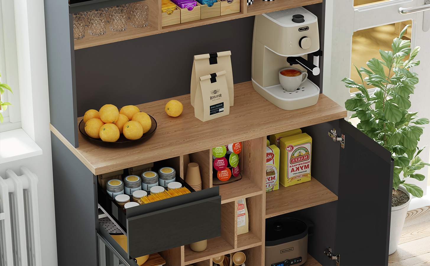 - Sliding doors and 3 drawers: The 120 cm tabletop is perfect for household appliances such as coffee makers and microwaves. The sliding doors and drawers provide plenty of hidden storage for kitchen essentials like cutlery, plates, and cups.