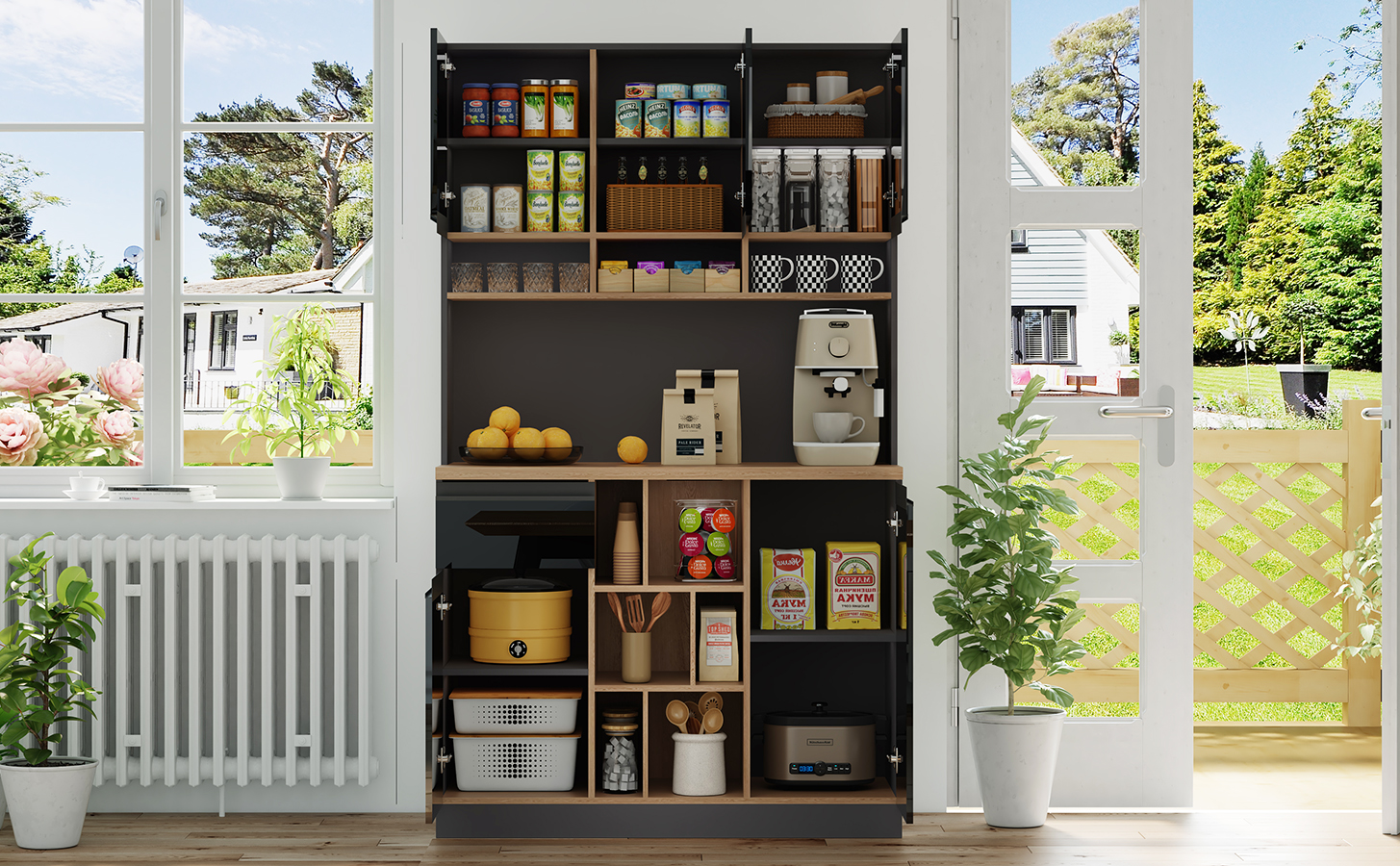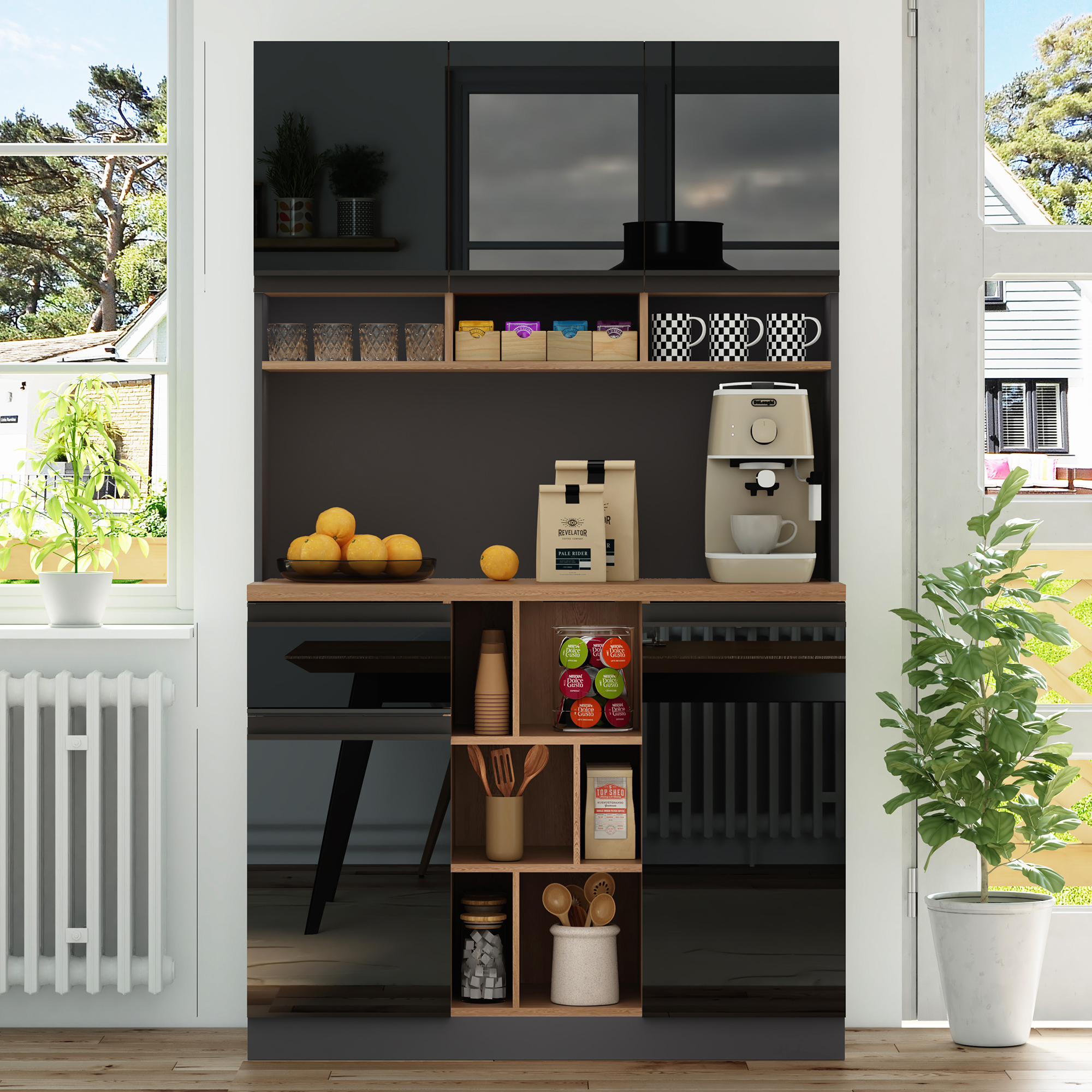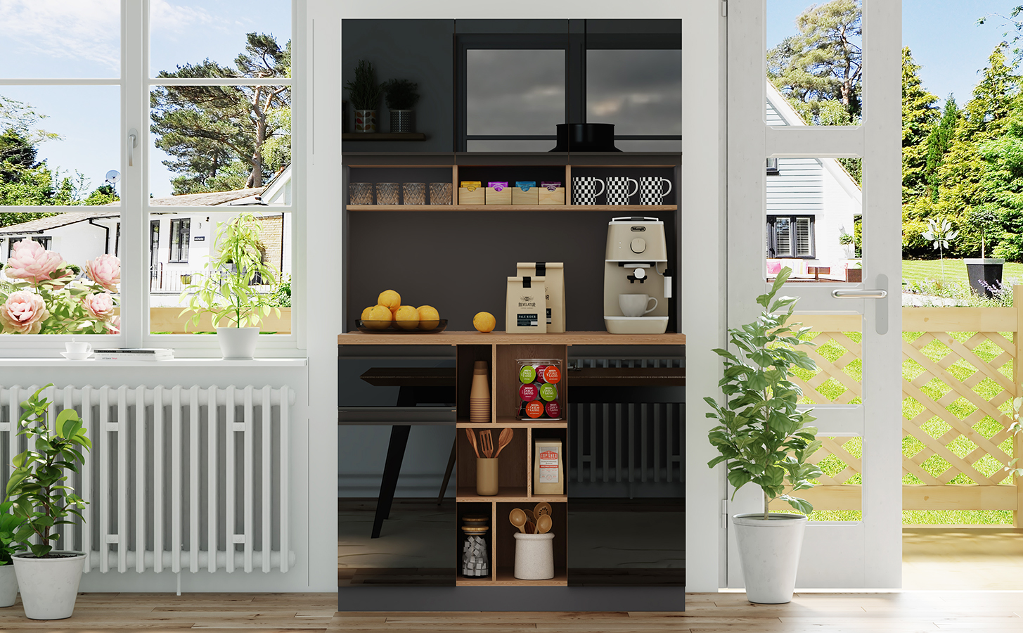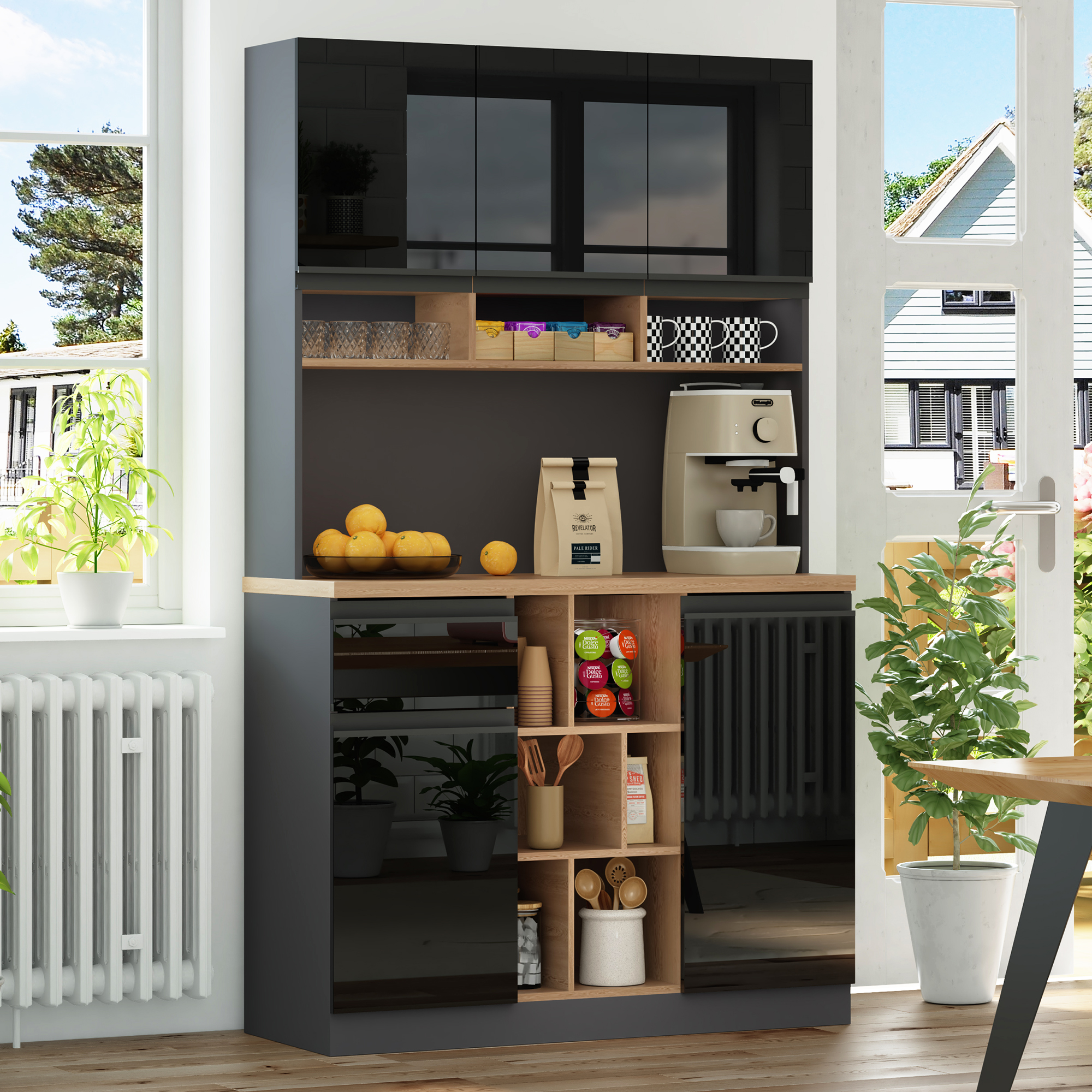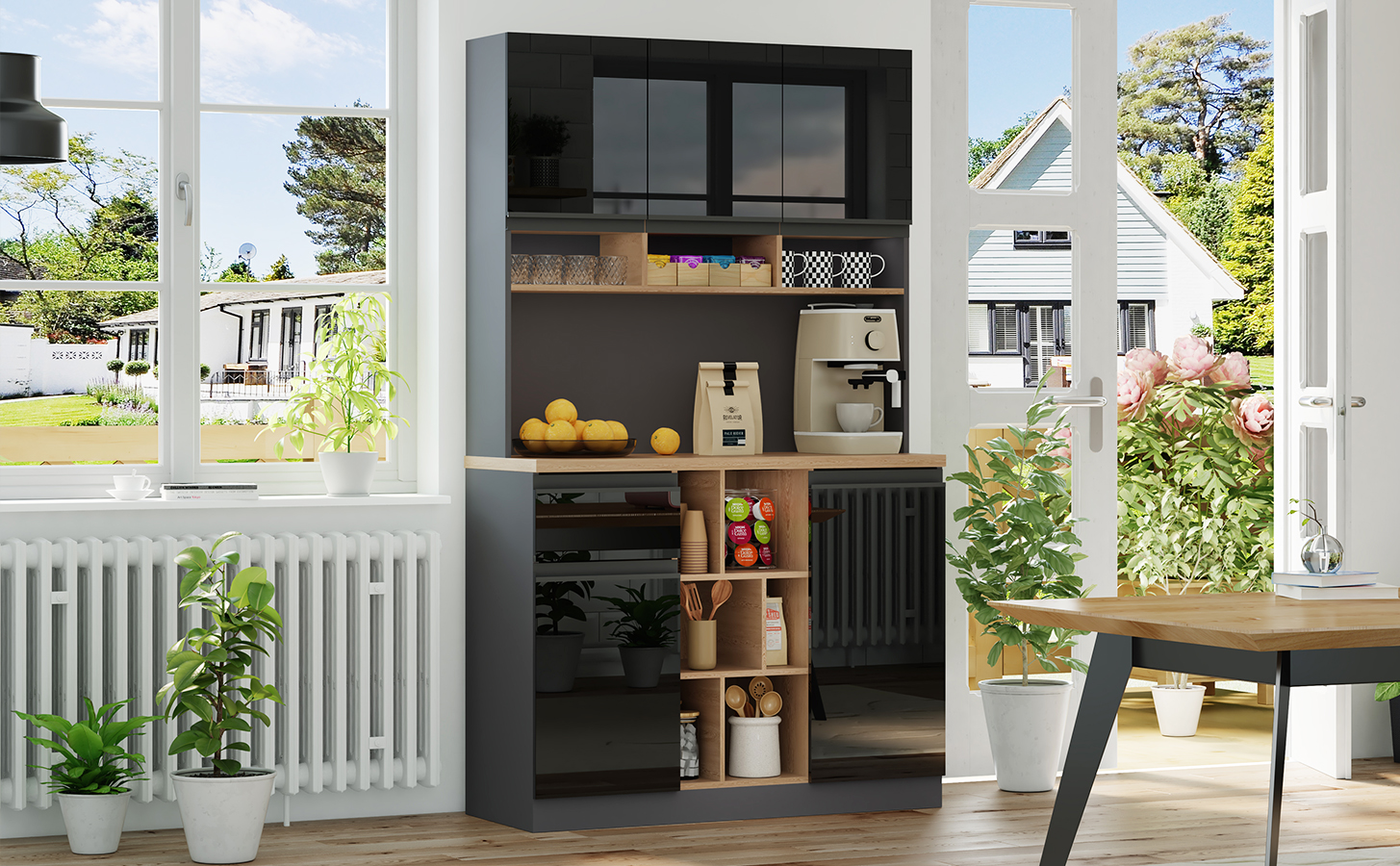 - Sliding doors and 3 drawers: The 120 cm tabletop is perfect for household appliances such as coffee makers and microwaves. The sliding doors and drawers provide plenty of hidden storage for kitchen essentials like cutlery, plates, and cups.