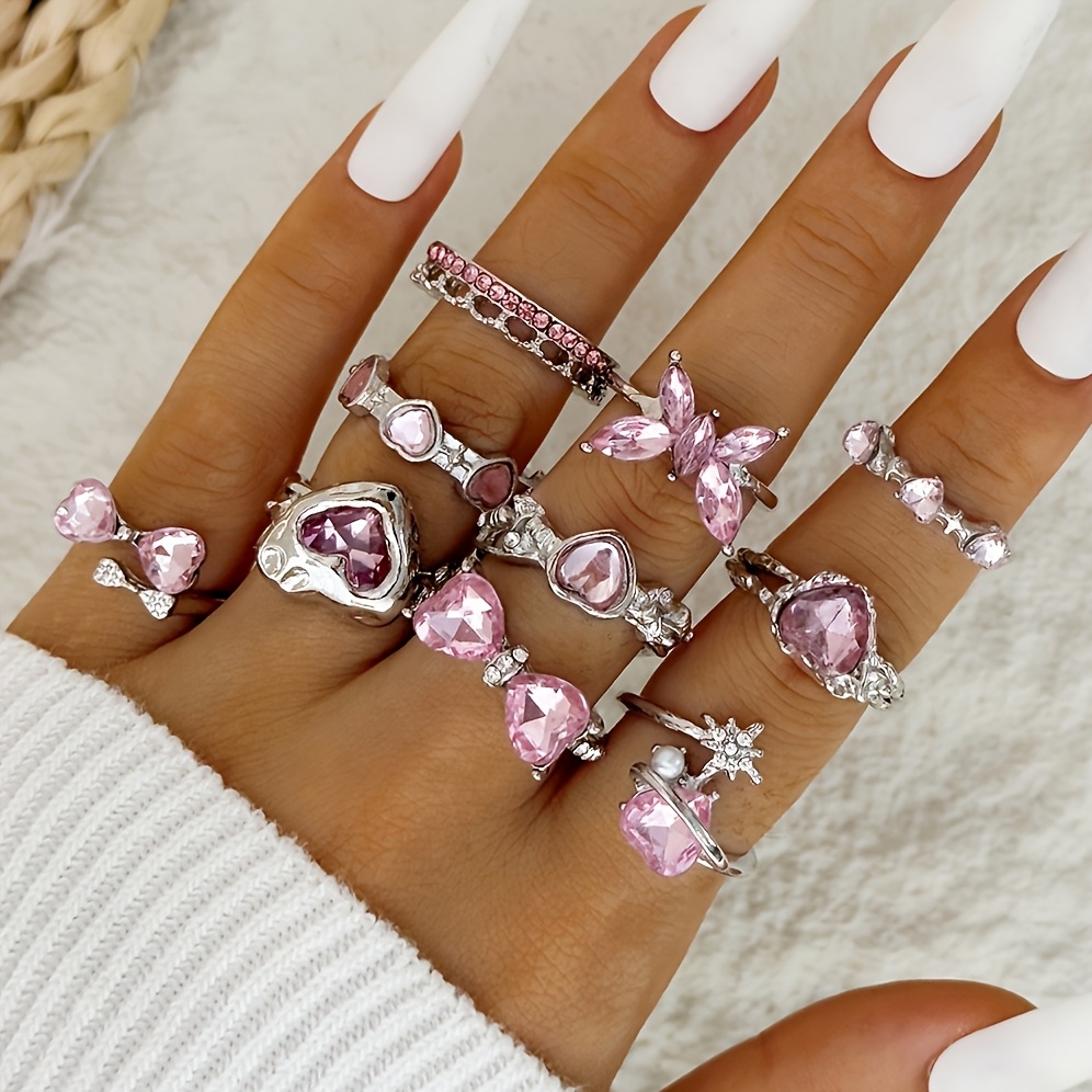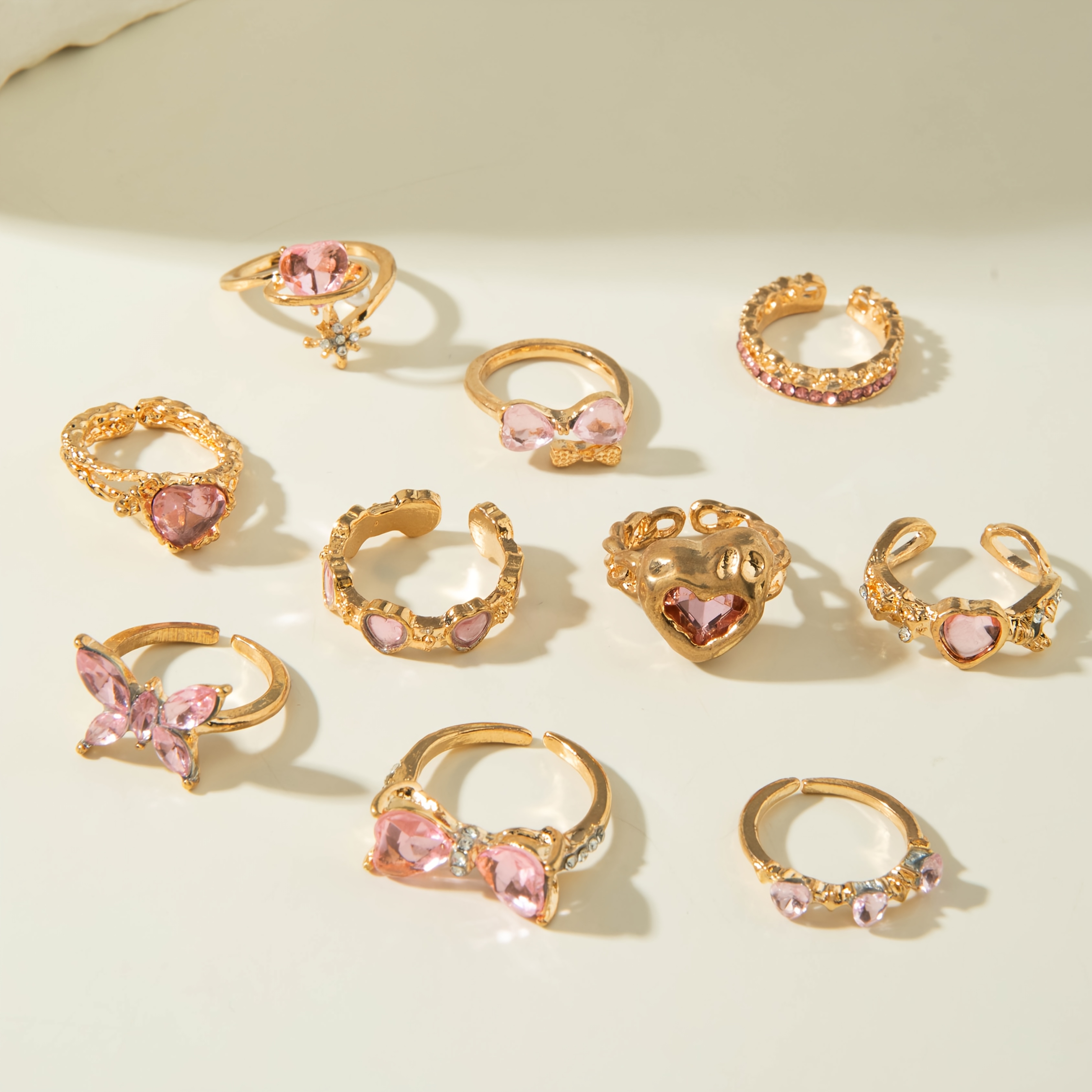 10Pcs Fashion Pink Rhinestone Bow Heart Rings For Women, Exquisite Temperament Finger Jewelry, Perfect Valentine's Day Gift For Party Dance