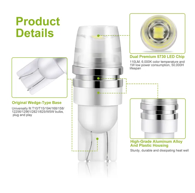 *Wide Application*:Can universally fit T10/T15/194/168/158/12256/12961/2821/825/W5W bulbs,can be used as license plate light,parking light,side positions light,door light,instrument light,reading light,trunk light,etc. of various 12V vehicles.