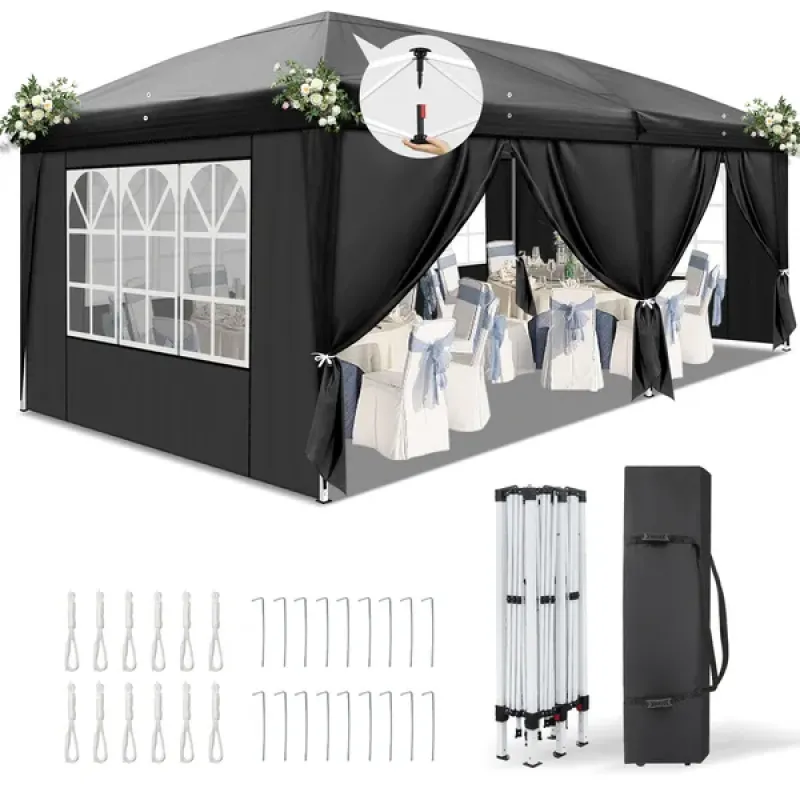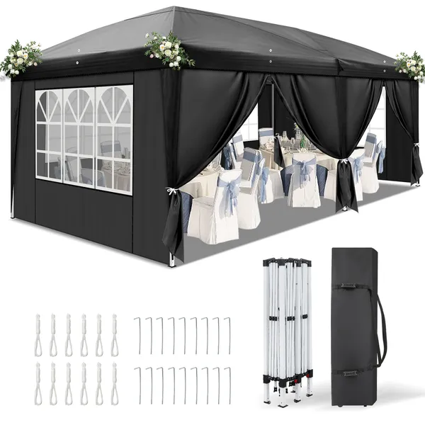 10'x20' Instant Pop Up Canopy Tent Black, 6 Panels 2 Doors 4 Mesh Windows, 28 And 22mm Powder Coated Steel Frame, 10x20mm Crossbar, 210D Oxford Folding Outdoor Tent With Carry Bag No Sandbags