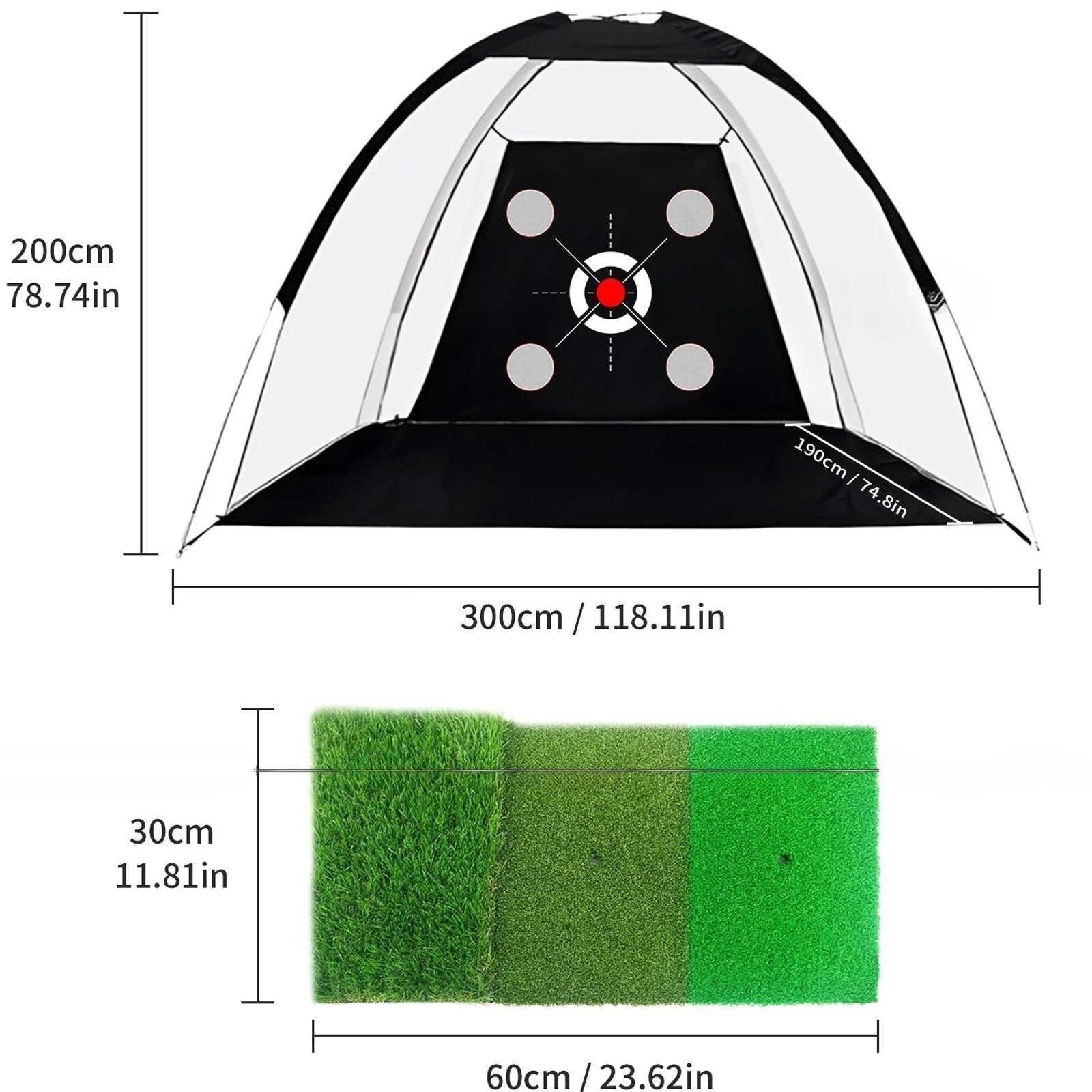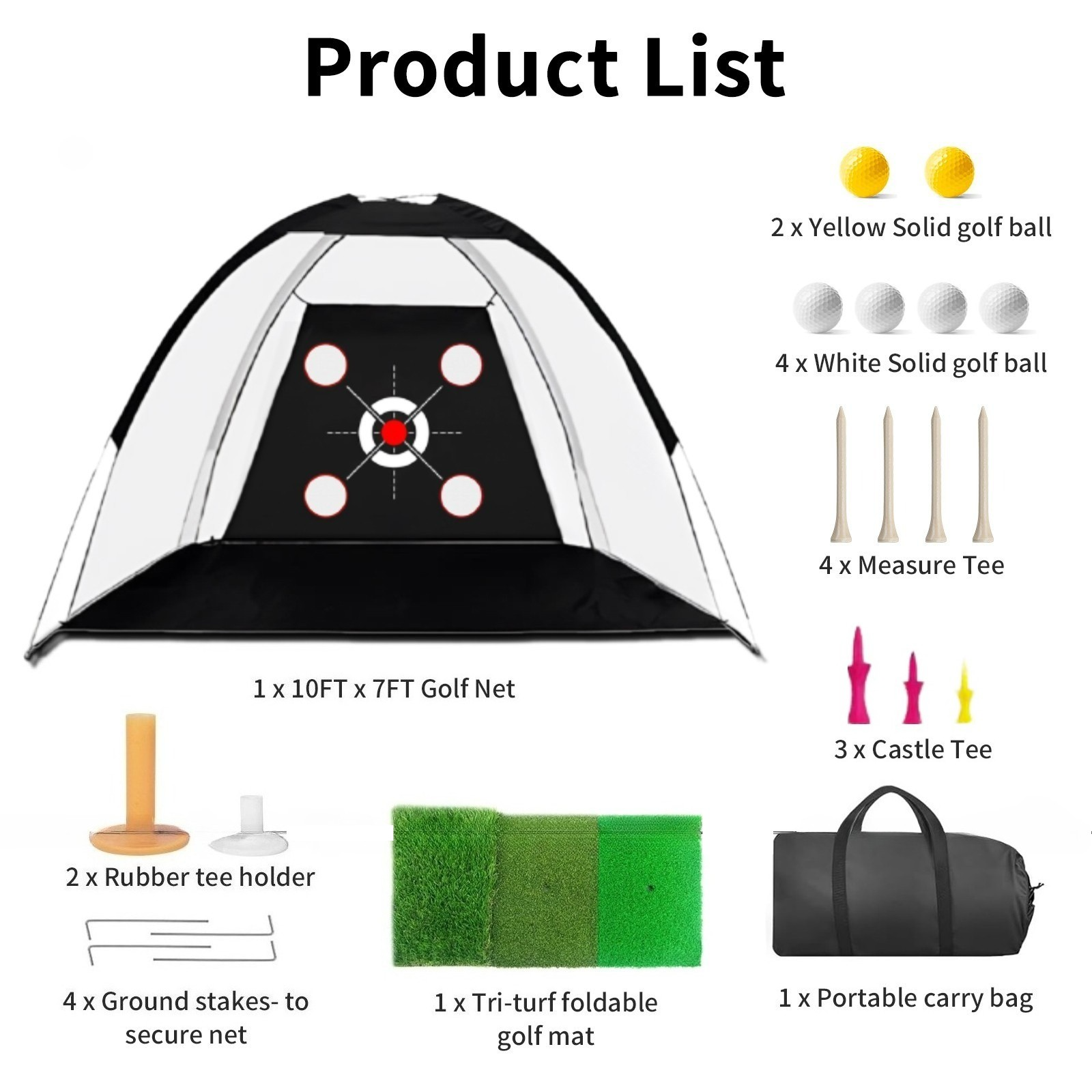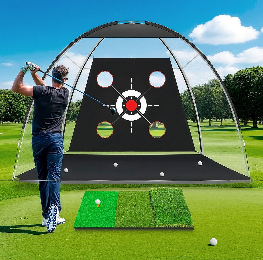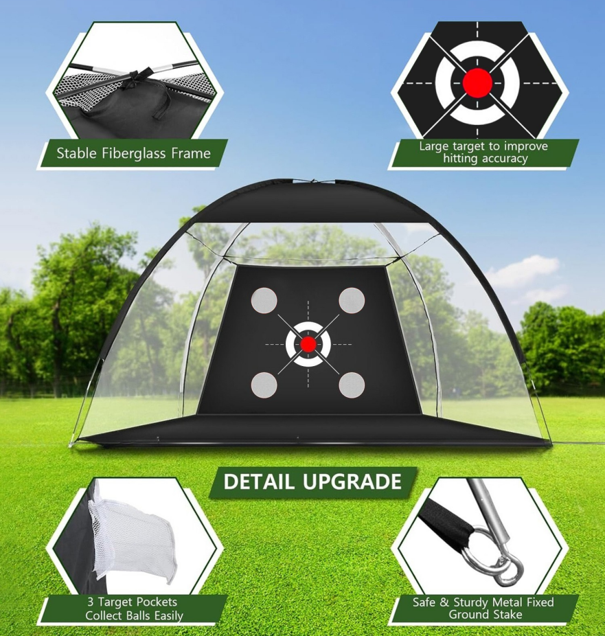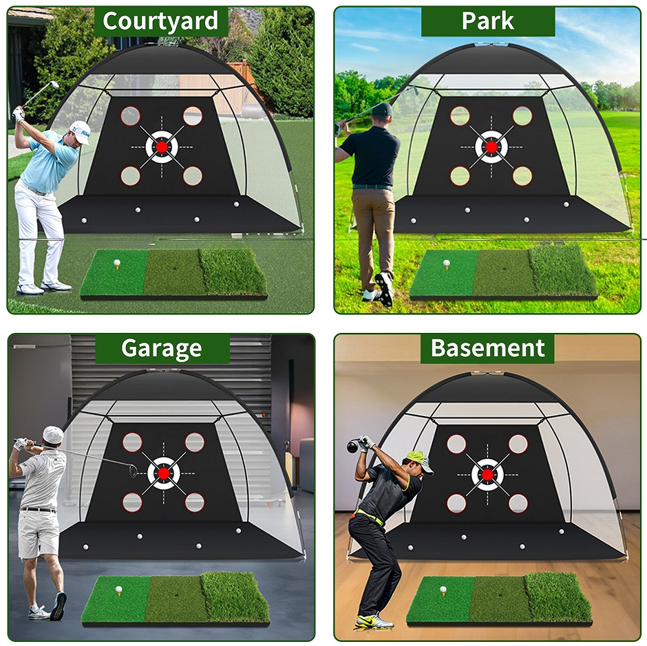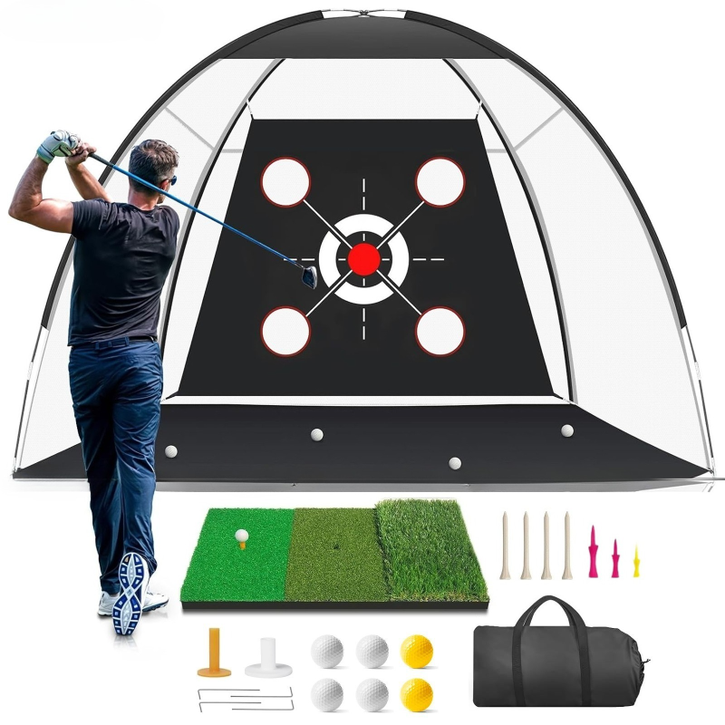 Our golf hitting net set also comes with a 3-in-1 turf golf mat, 5 golf balls, 1 rubber tee, 1 large-capacity carrying bag and 4 ground stakes. A variety of targets help players focus on all aspects of swinging, chipping, hitting and driving.These are ideal golf accessories for men/women.