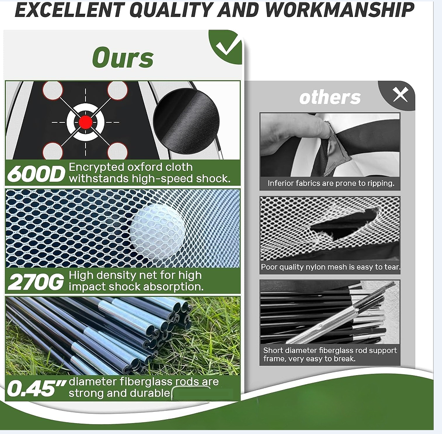 【Strong and Impact-Resistant Materials】Our golf net is made of 600D Oxford cloth, 250g high-density net and 0.45-inch thick reinforced fiberglass structure,