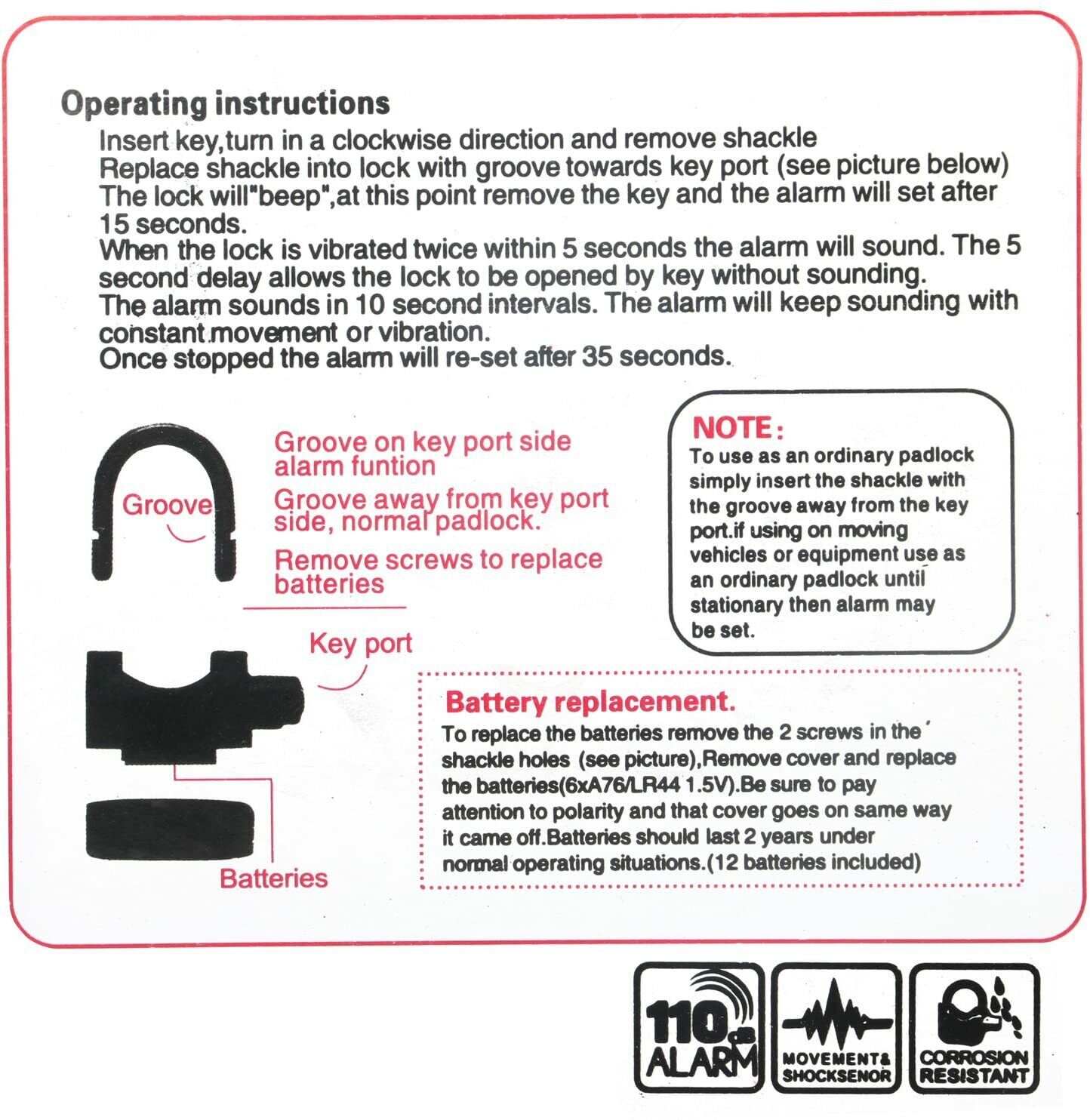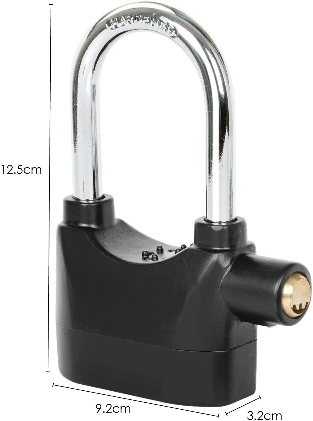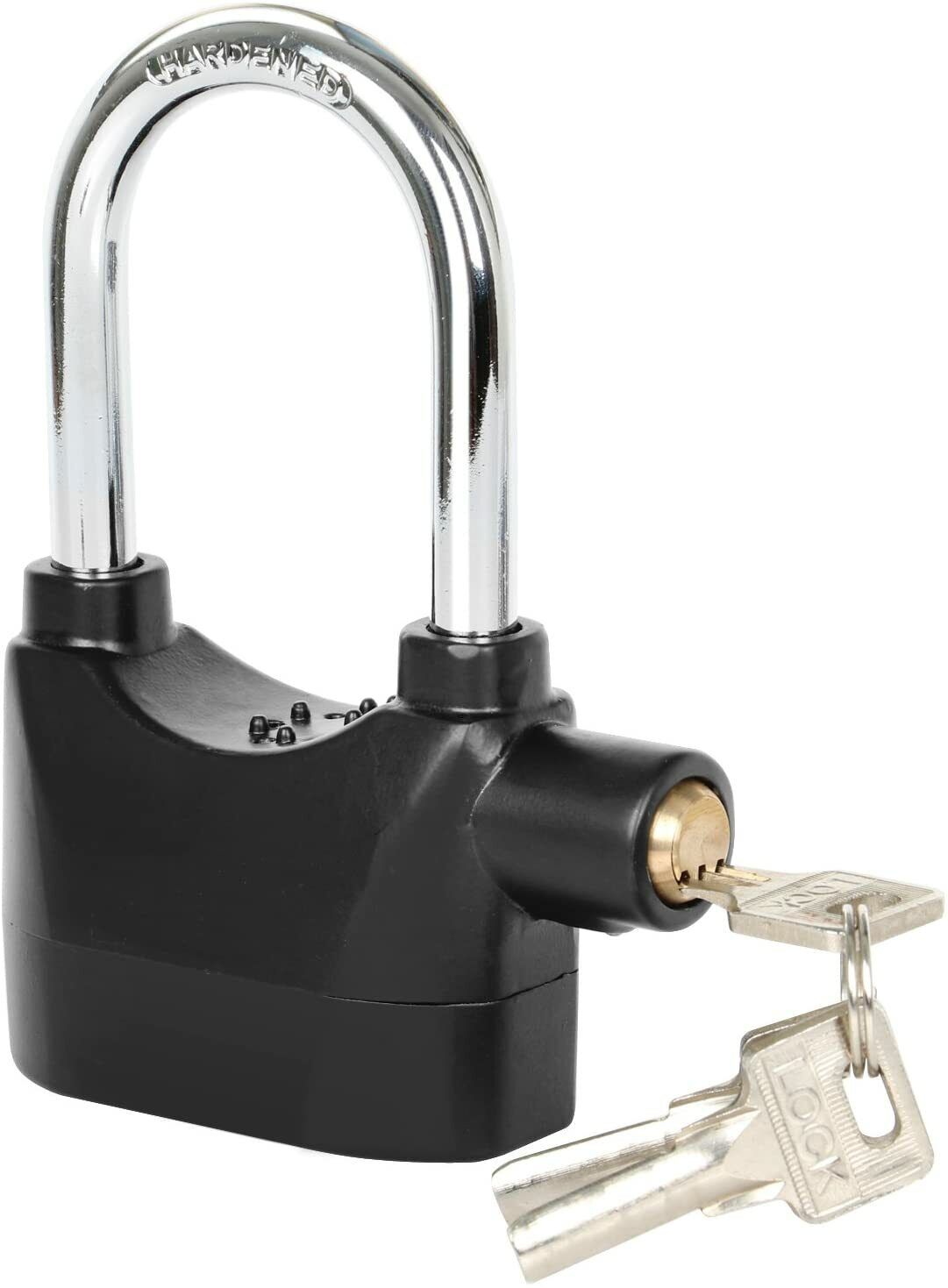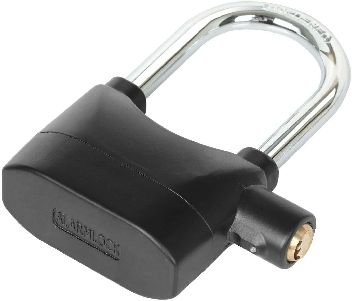 Use this padlock on sheds, garages, gates, bike locks etc, the weatherproof casing means you don't have worry about it rusting outside. It is made of heavy duty steel with a tough exterior coating. The alarm uses 6 x LR44 batteries (included) and is very loud at 110db, as loud as an electric saw or being at a rock concert.