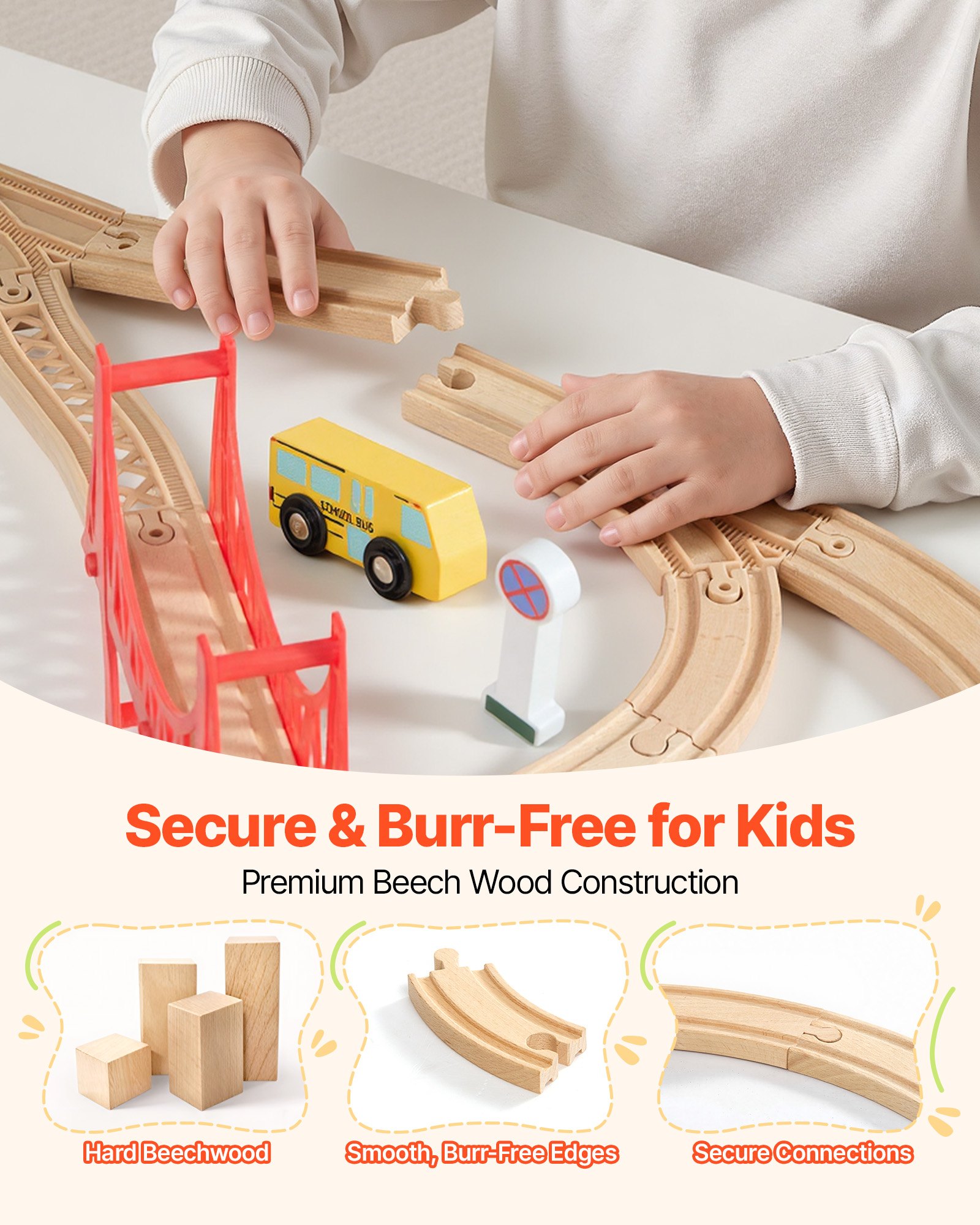 Security Comes First: Crafted from quality beech wood with smooth, burr-free edges. The wood train track set is gentle for little hands, with tight track connections and smooth-running trains built to endure years of play