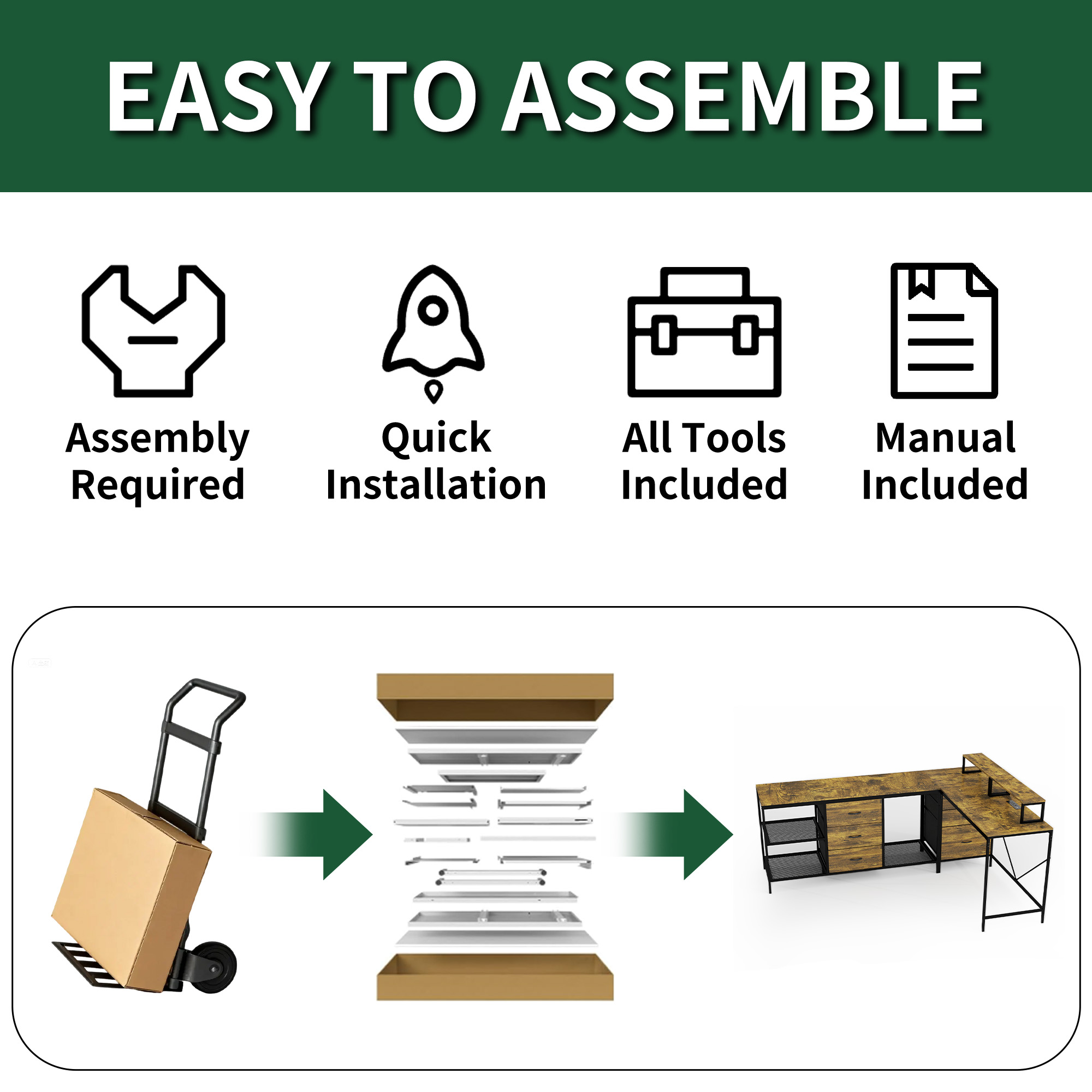 Transform your workspace with our massive 114-inch L-shaped desk! Built with a sturdy cold-rolled steel frame and high-density board, it offers unparalleled stability. Stay organized with 6 spacious fabric drawers and 3 open shelves. The built-in power hub (3 outlets + 2 USB-C) and 2 movable monitor stands supercharge your productivity for work, study, or gaming. Customize your layout freely in an L-shape or a straight line. The rustic brown finish adds a touch of industrial charm to any room.