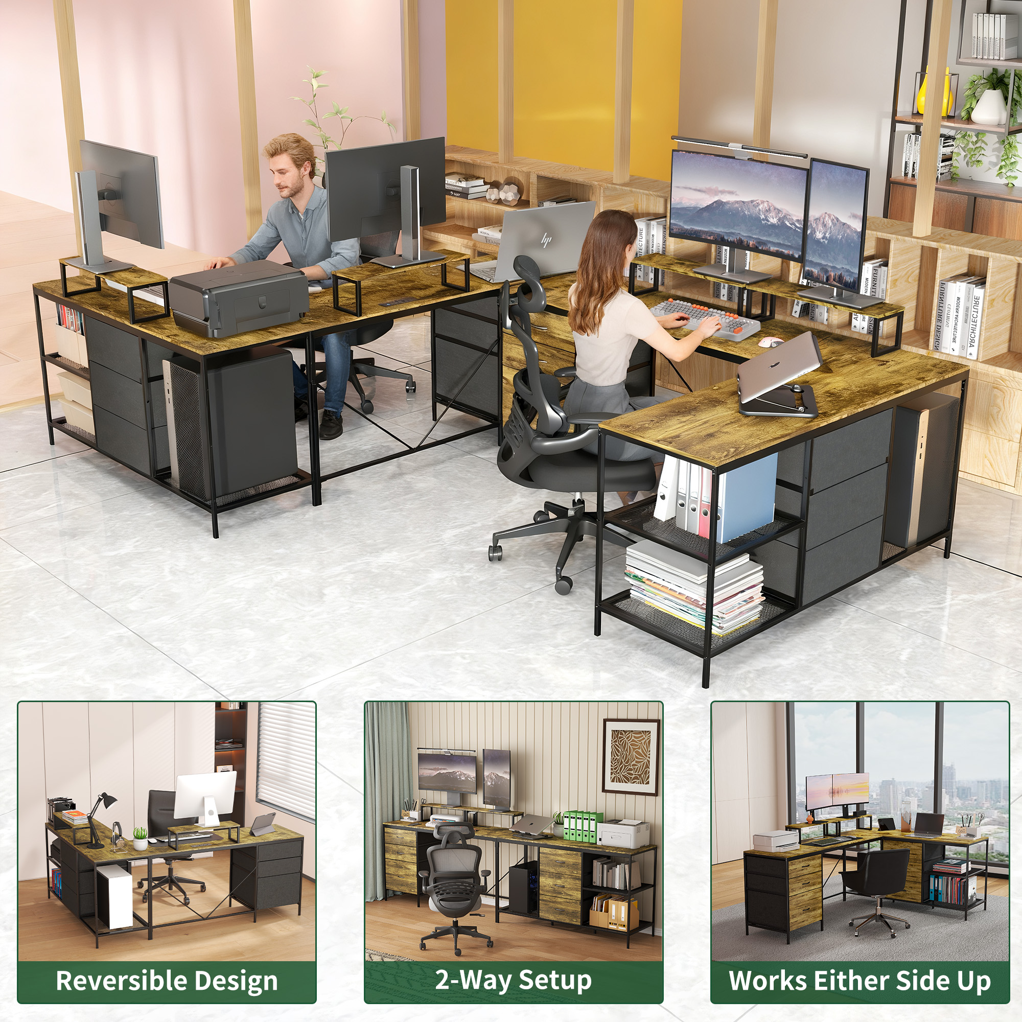 Product Name:114 Inch L-Shaped Desk with Power Outlets & USB-C, Industrial Computer Desk with 6 Fabric Drawers, 3 Open Shelves & Movable Monitor Stands, Large Corner Office Desk for Gaming, Rustic Brown