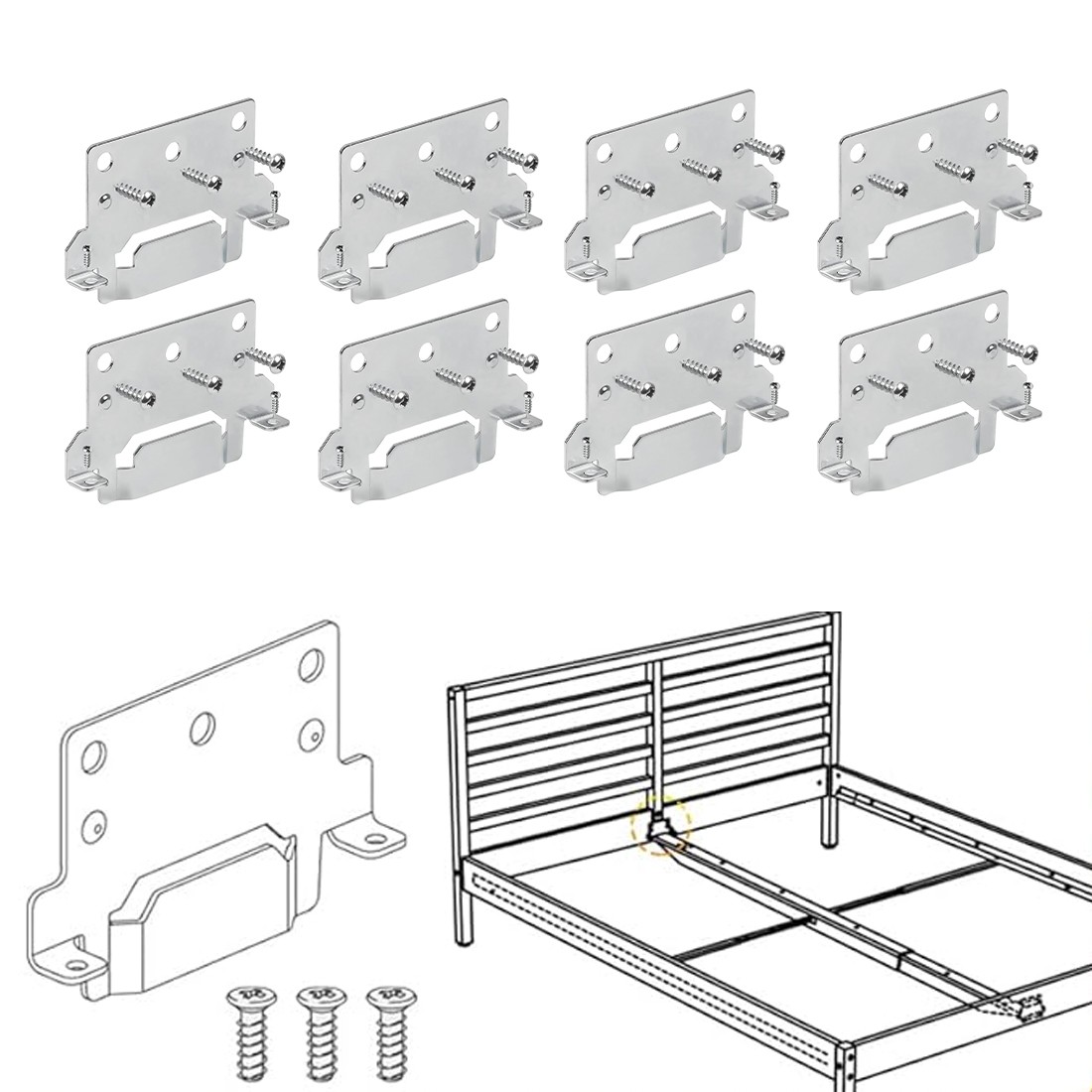 -Screws Included — Unlike other sets of bed replacement parts, this pack doesn't let missing screws slow you down. Each of the packs includes 2 small screws to hold the side wires on the bracket and 3 large screws to screw into the frame itself. Take the guesswork out of reassembling your bed frame