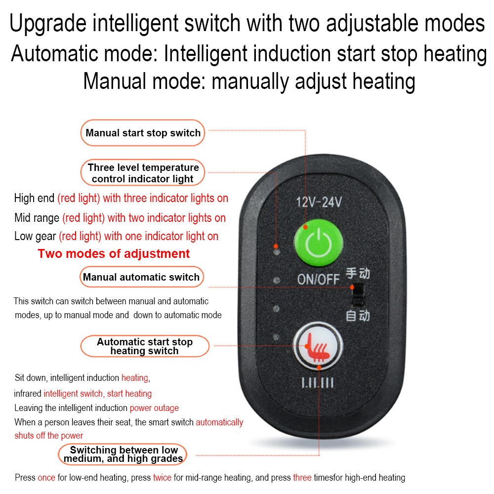 Automatic Start and Stop: Built-in pressure sensor; the heater automatically starts when you sit down and stops when you walk away. Manual mode offers three adjustable settings.