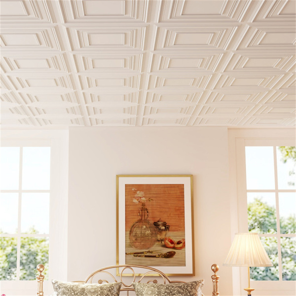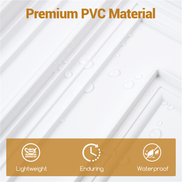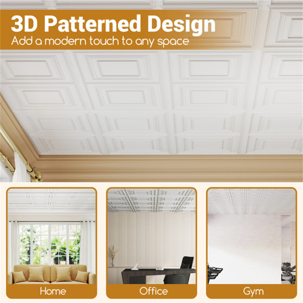 • Built to Last: These drop ceiling tiles are molded from premium PVC, so they stay lightweight and waterproof. Count on these ceiling sheets to keep their like-new finish for years in any busy room. • Modern 3D Texture: The modern raised patterns on each plastic panel turns plain spaces into eye-catching features for homes, offices or gyms. Use these construction tiles as a quick style upgrade that still blends with existing decoration. • 2-Way Install: These square tiles install two ways—fit in 15/16" T-bar drop ceiling grid or glue them up on any flat surface (construction adhesive not included). Whichever method you choose, these drop ceiling tiles make weekend DIY projects fast and tool-friendly. • DIY Friendly: Each plastic panel scores and snaps easily, letting you cut custom shapes around vents or lights without special tools. Because these ceiling sheets arrive paint-ready, you can brush on any color for a fully personalized look. • Complete 12-Pack Kit: The package includes 12 pieces of 24" x 24" construction tiles that covers 48 sq.ft., perfect for both full ceilings and accent walls. Stock up on these square tiles whenev