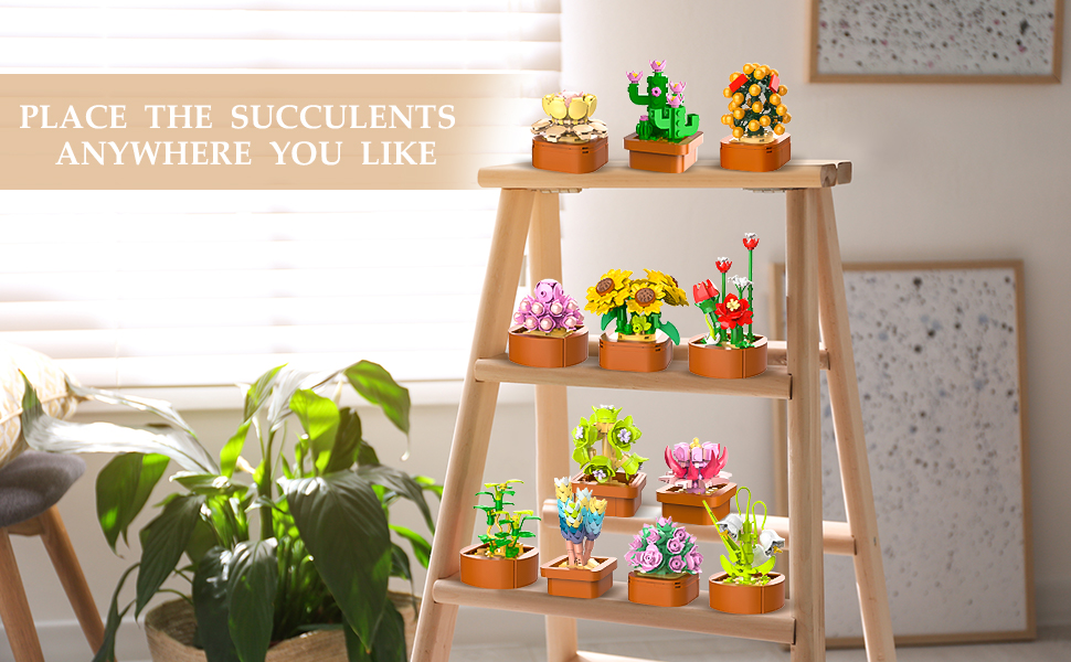 This mini building kit is made of 1403 pieces of bricks and includes 12 unique succulents inspired by real flower. Each delicate flower building block comes with a buildable terracotta pot, allowing you to display them individually or in groups, adding a touch of life to your living space.
