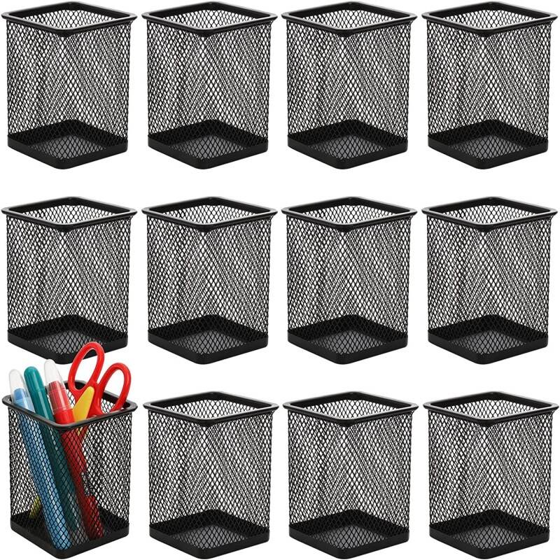 12 Pack Metal Pen Pots & Pencil Pots For Classroom - Square Mesh Pen Holder For Desk Office Organiser, Durable Black Epoxy-Coated Pen Holder With Industrial Design, Ideal Pencil Pot Set For Teachers,