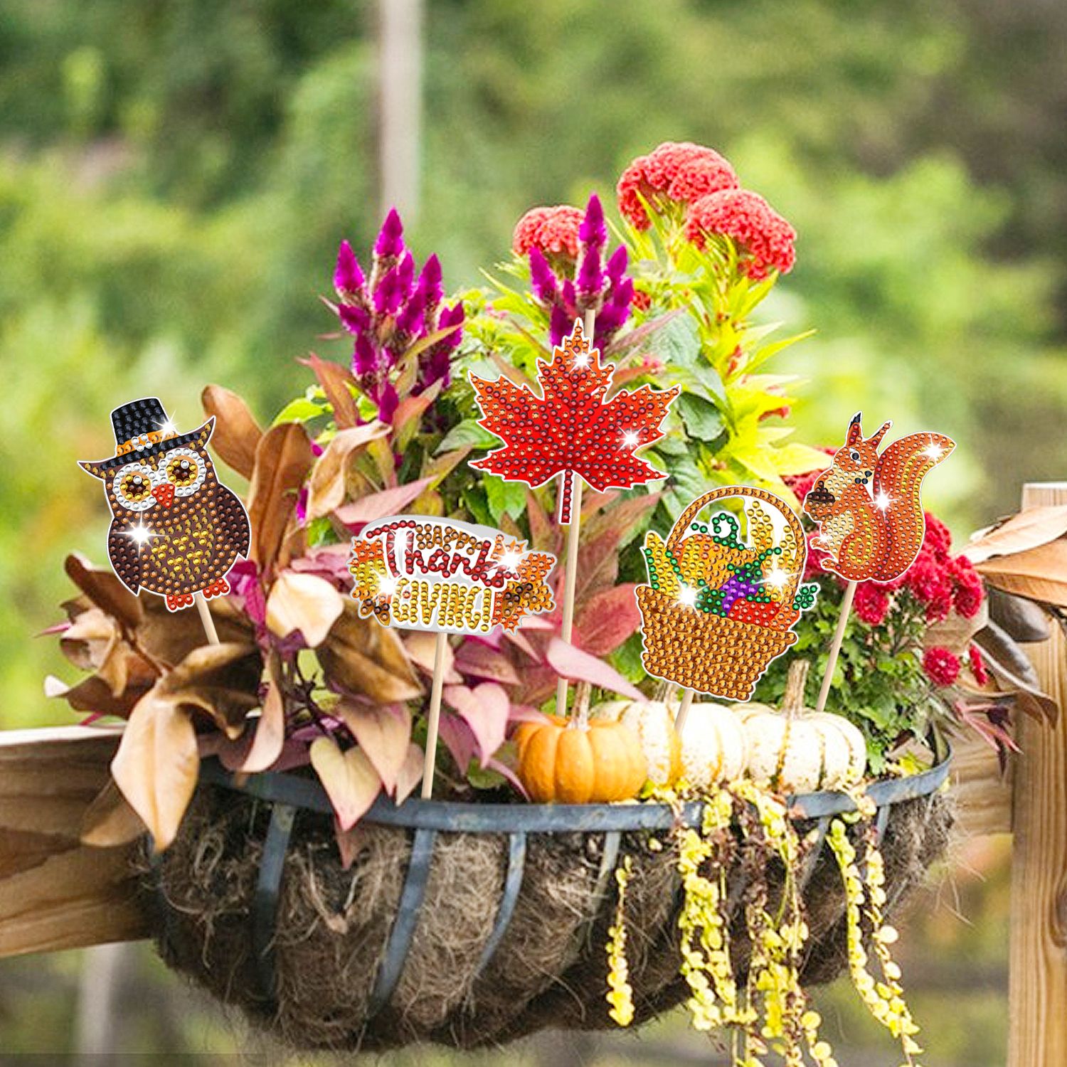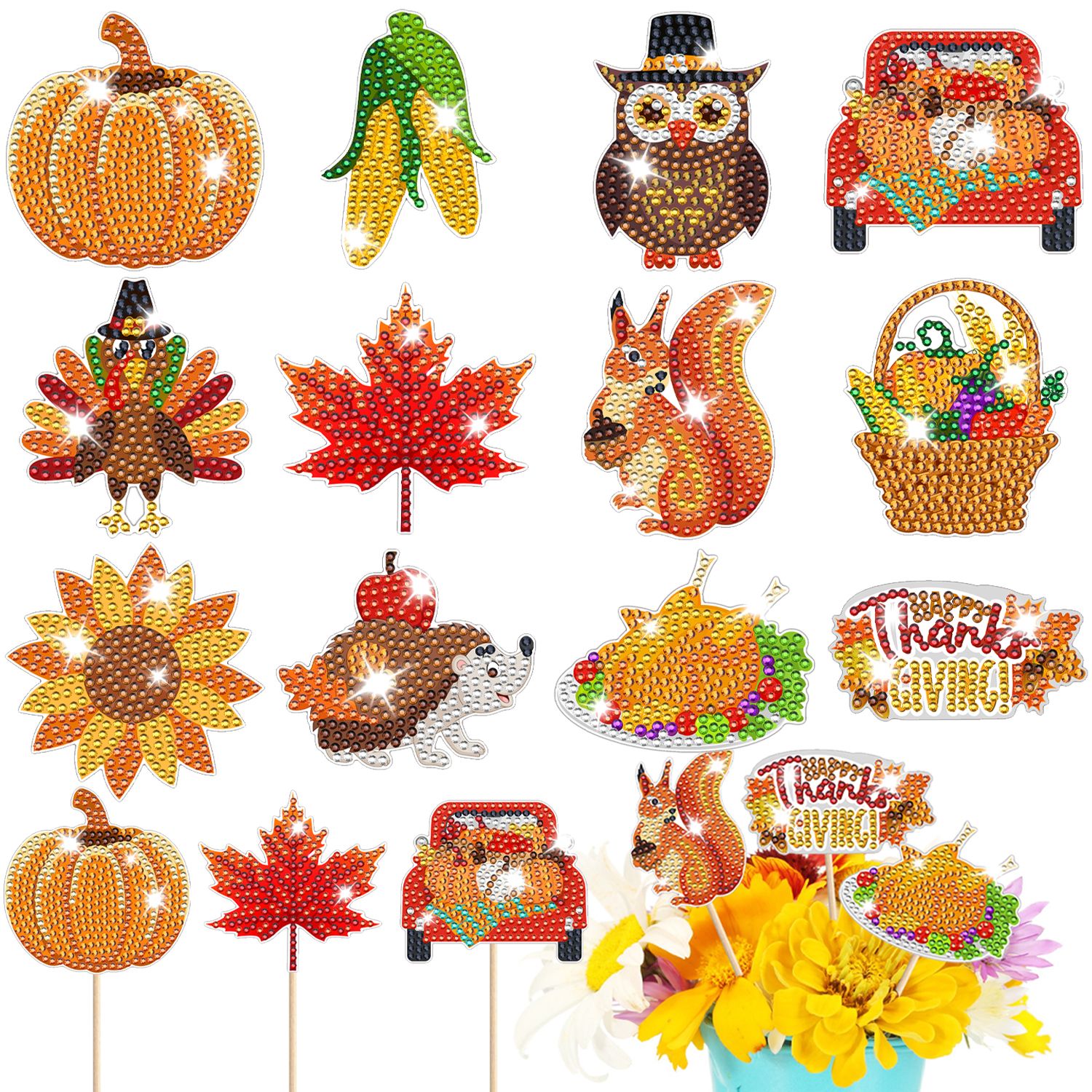 The diamond art kits for Thanksgiving feature many fall elements, such as pumpkin, turkey, maple leaf, corn , hedgehog, sunflower, etc. Diamond art Thanksgiving keychains with various styles are full of vitality, fun, shine, and cuteness, creating a rich fall harvest atmosphere and filling with a festive atmosphere