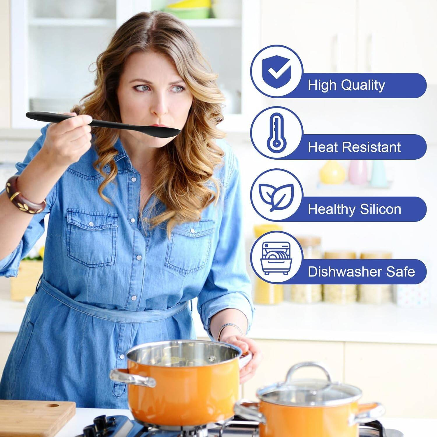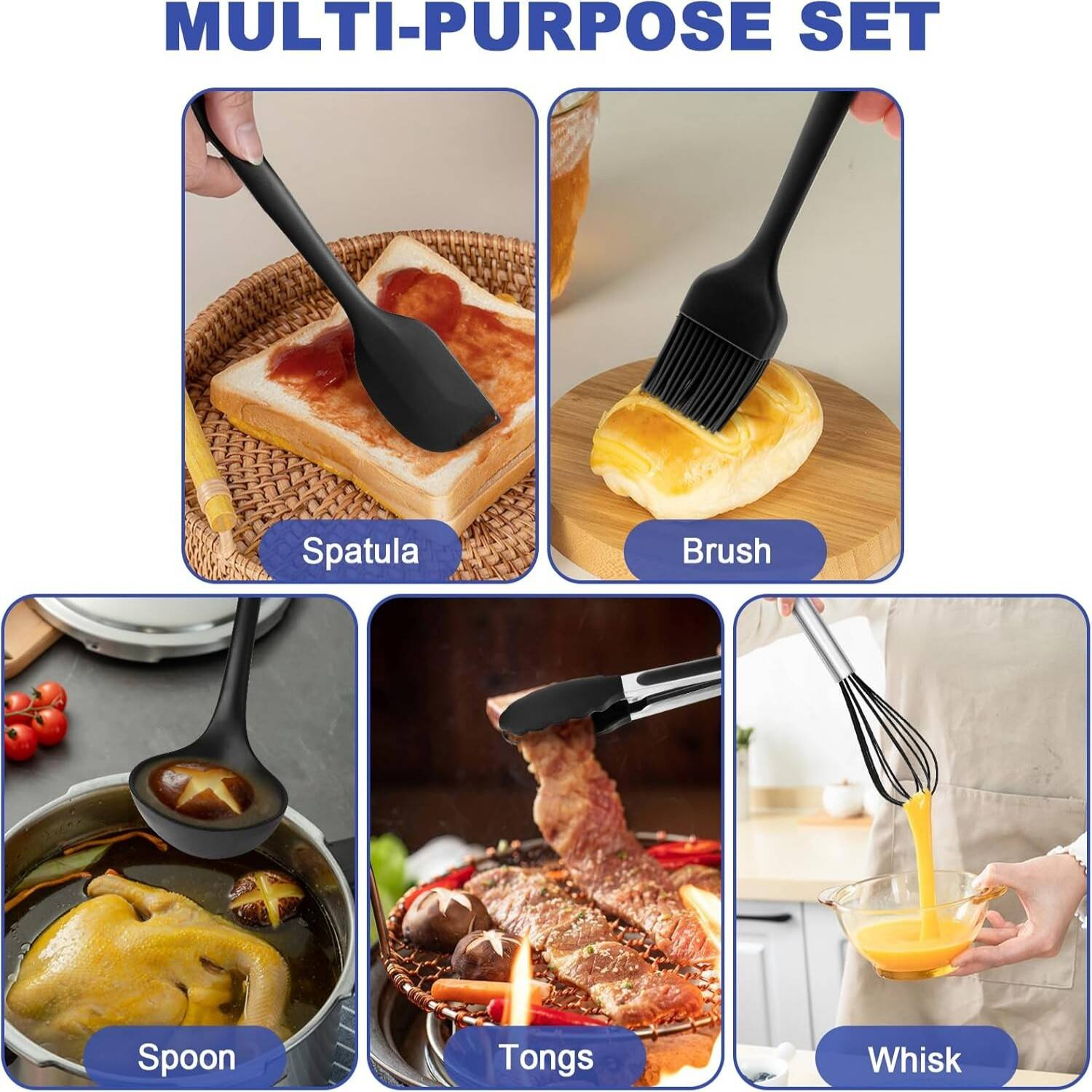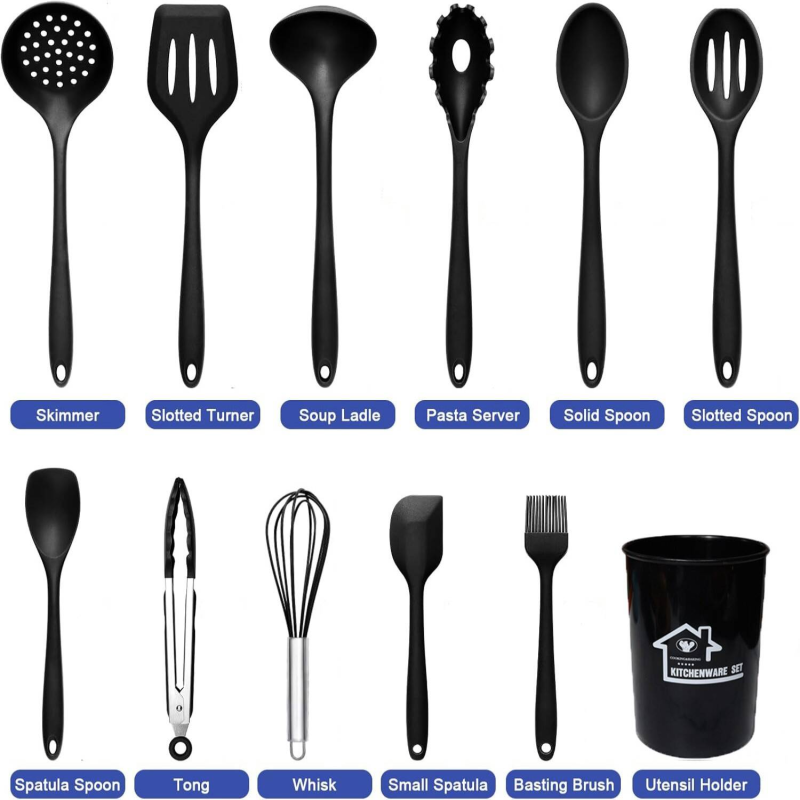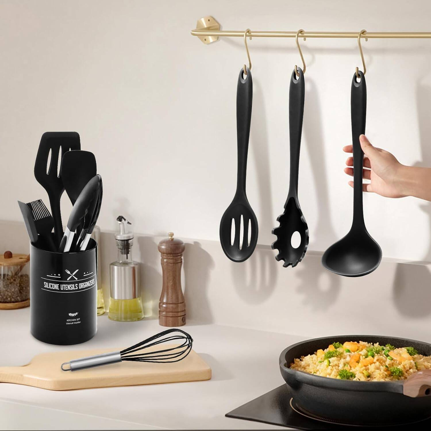 12-Piece Silicone Kitchen Utensil Set - Food Grade, Non-Scratch for Pans, Heat Resistant to 230°C - with Holder - Dishwasher Safe (Black) - Ideal for Homes