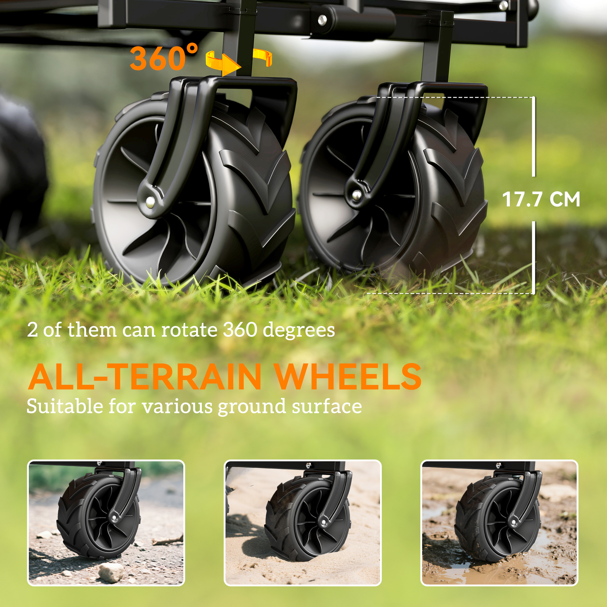 • Four EVA wheels – two which rotate 360°