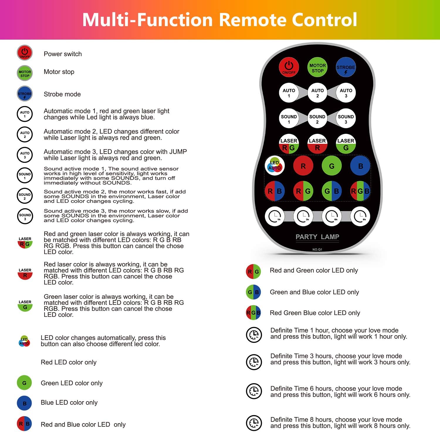 Work Mode: remote Control, sound activated mode, auto operation
