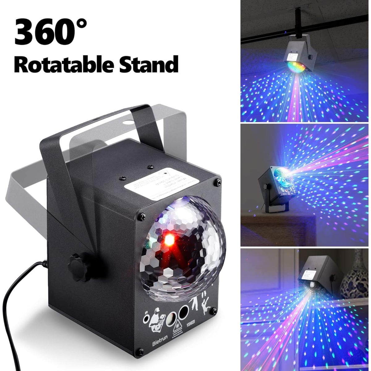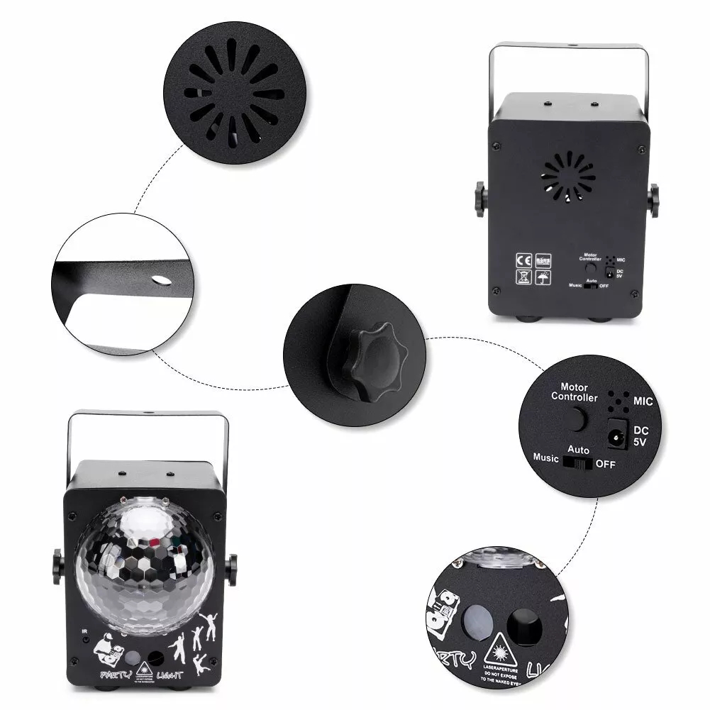 There is a switch (for adjusting work modes: music or auto mode) and a motor controller button (for changing lighting effects) at the back of the party light.