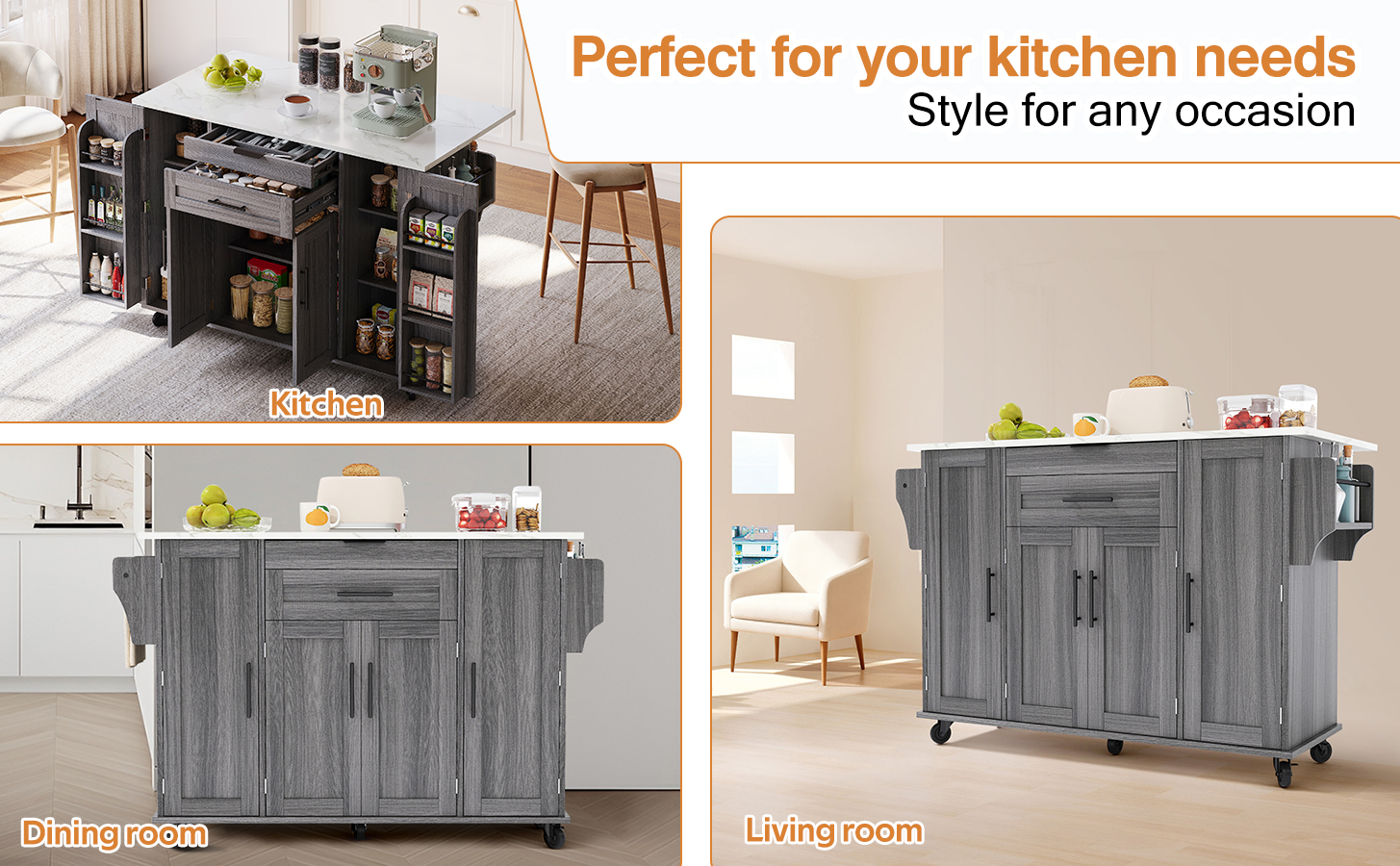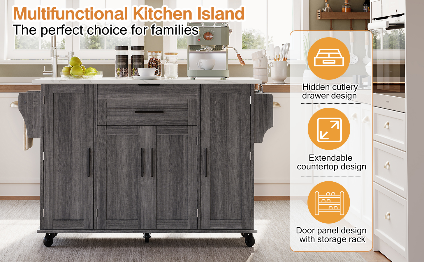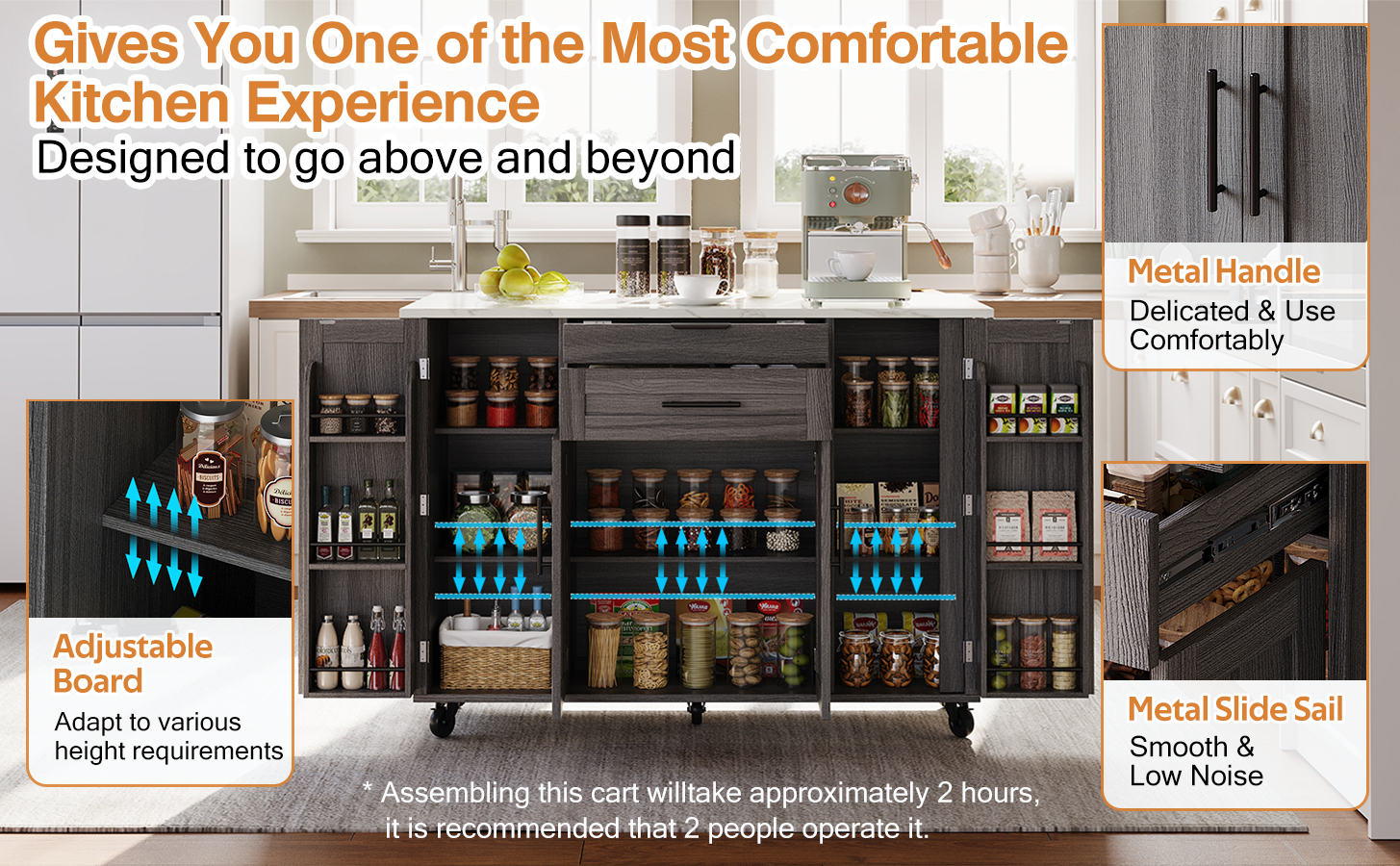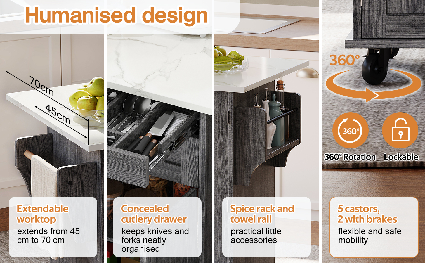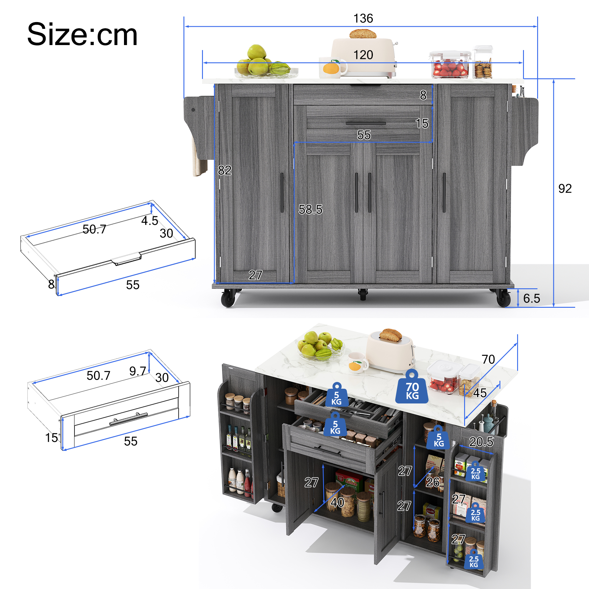 • 【Versatile Worktop】Features a 120 × 45 cm worktop with a 25 cm fold-out extension—expands to 70 cm depth, providing ample space for prep, cooking, or serving.