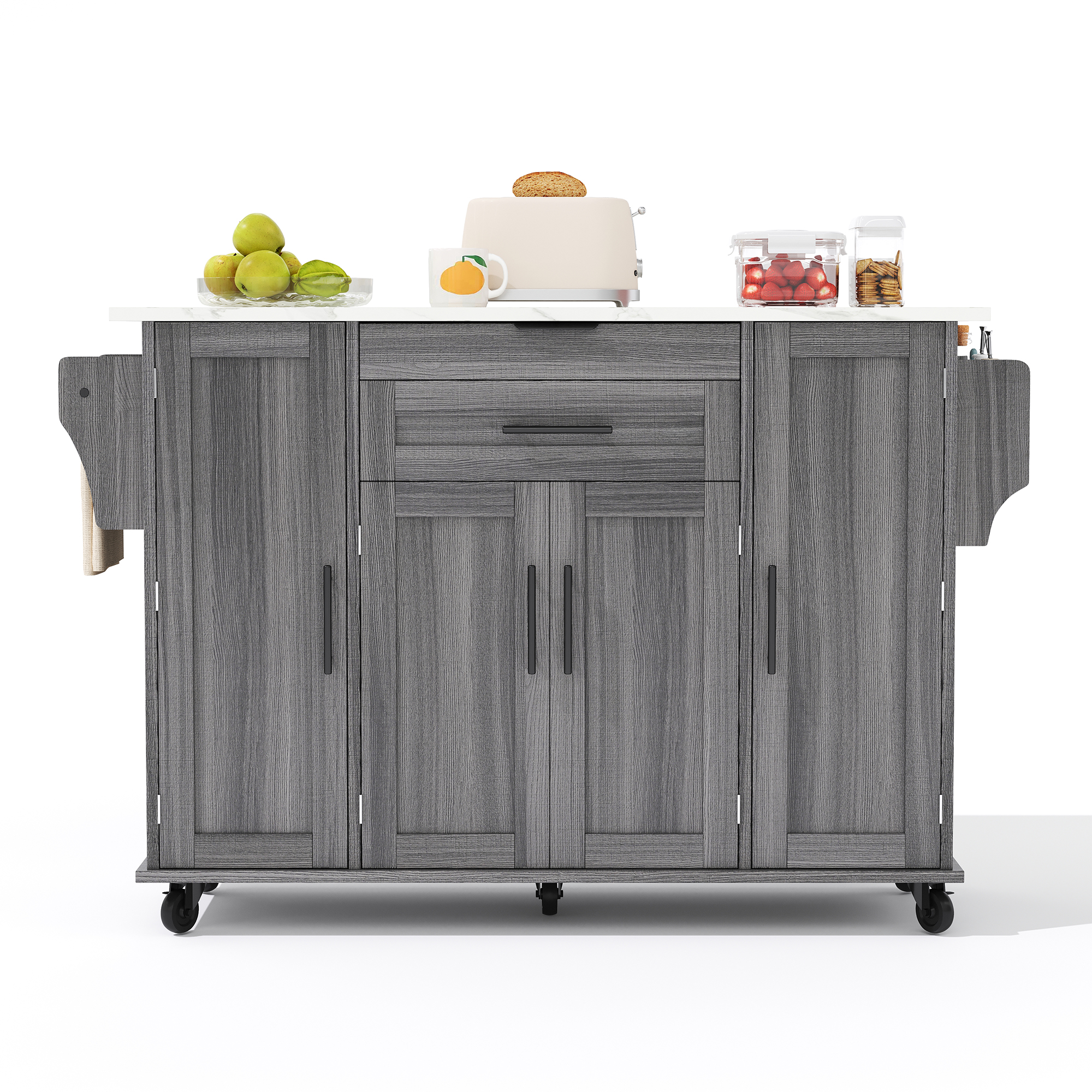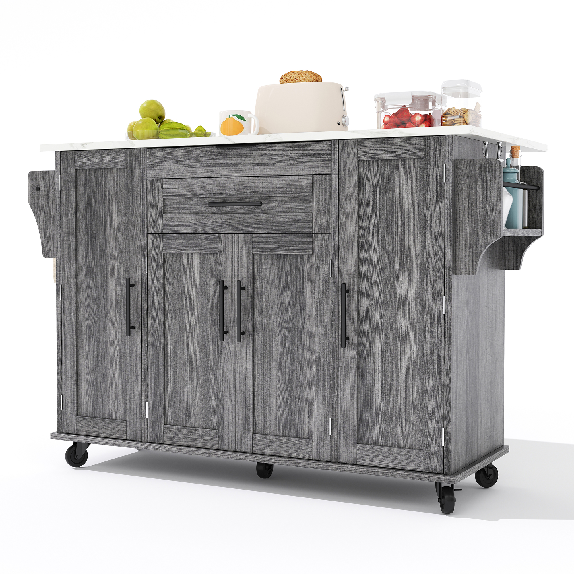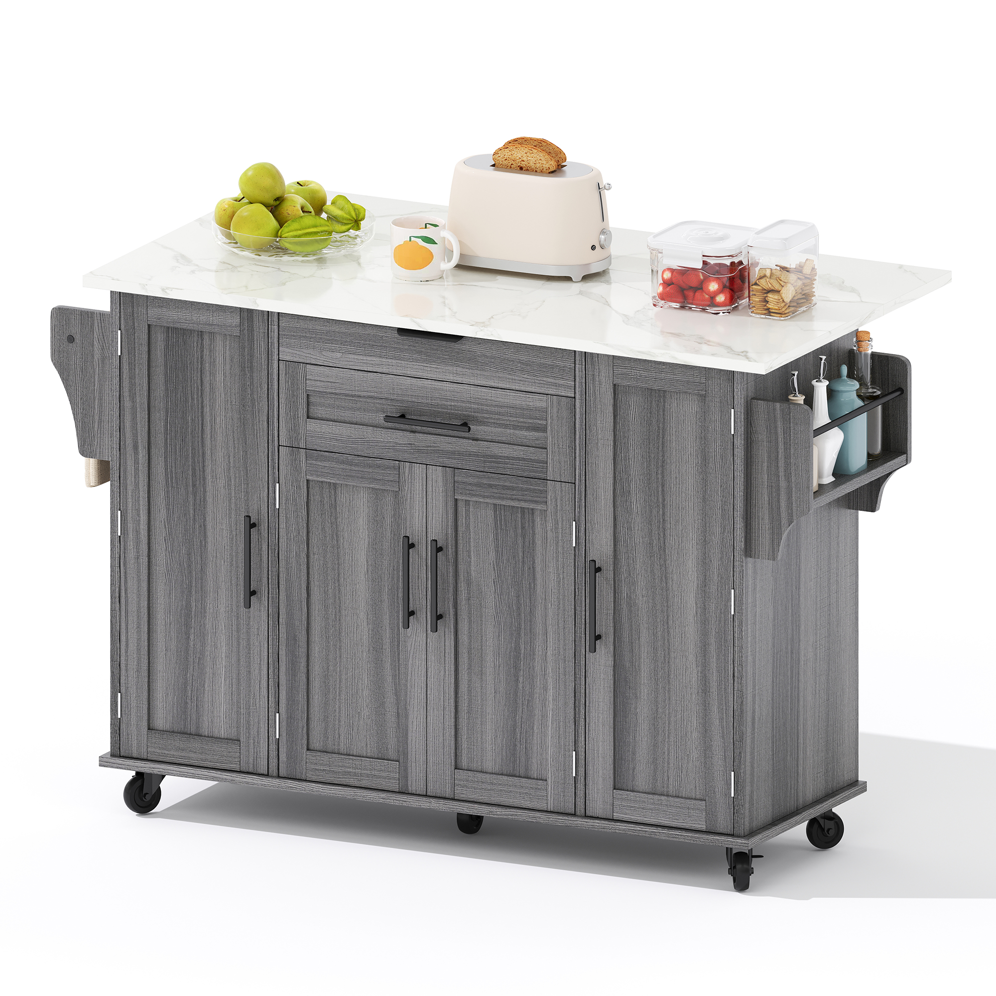 129x46-71x91cm Kitchen Island On Wheels, With Foldable Tabletop, Adjustable Shelves, Rolling Trolley With Storage Cabinets And 2 Drawers, For The Dining Room