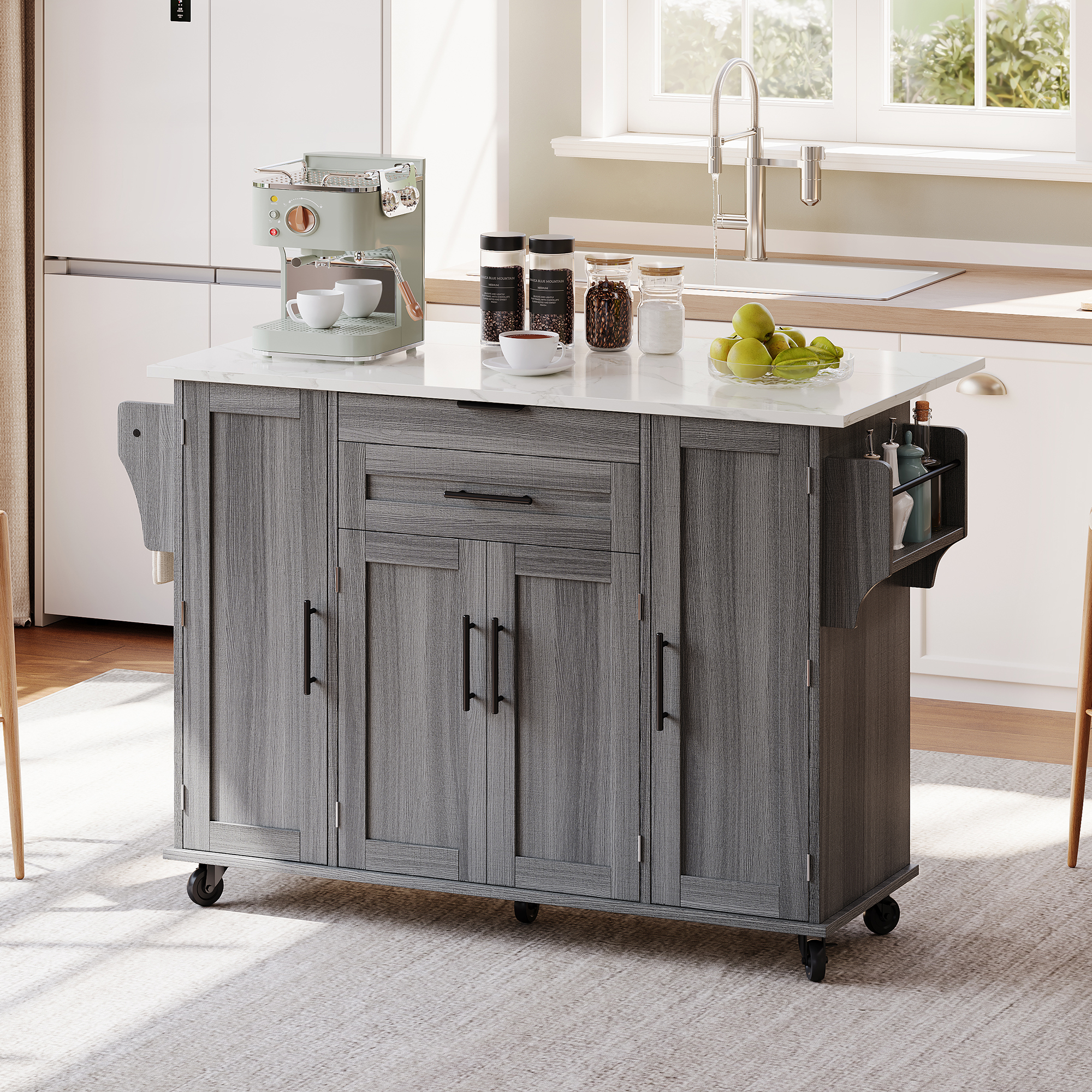 • 【Style and Quality】Made from medium-density fiberboard with a durable, water-resistant melamine surface for easy maintenance. Features metal handles, integrated towel rack, and spice rack—combining contemporary design with practical functionality.