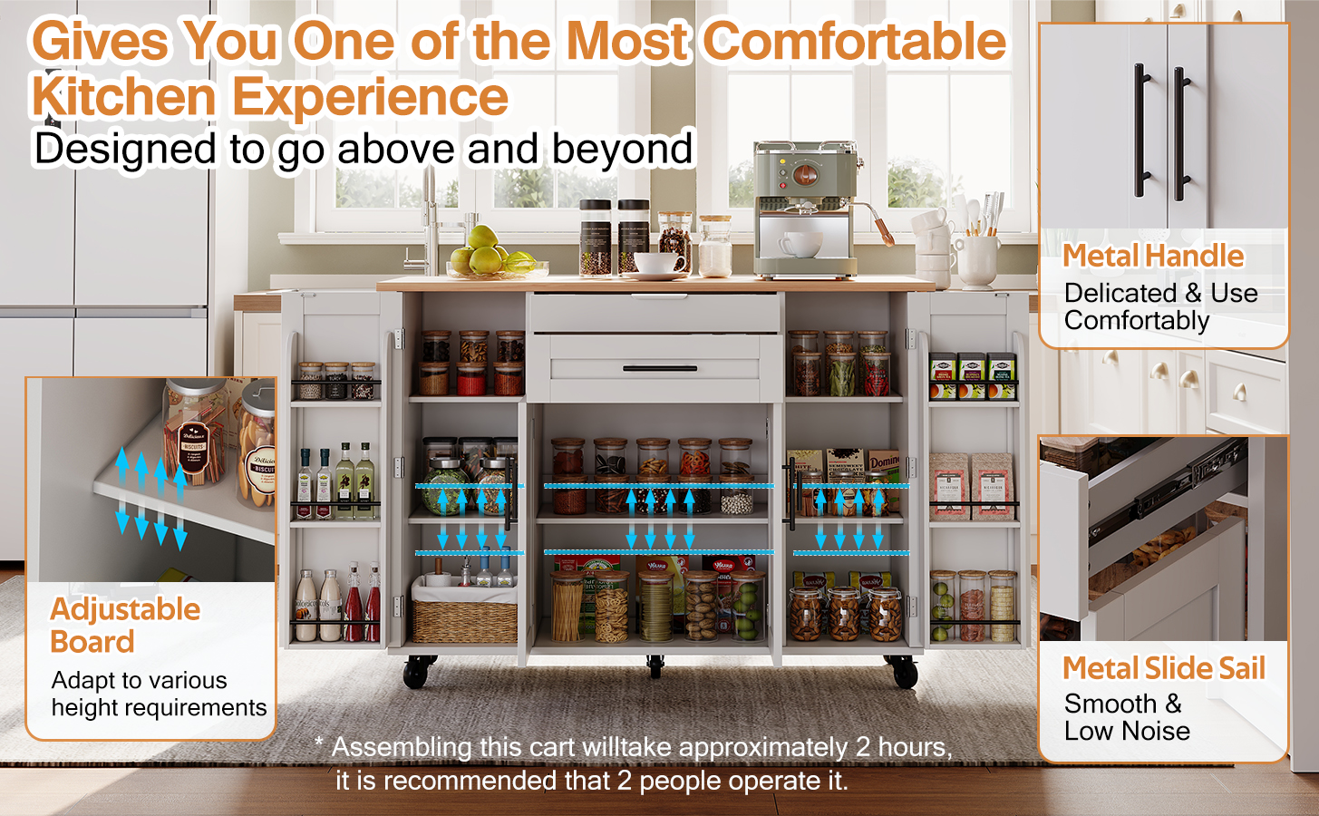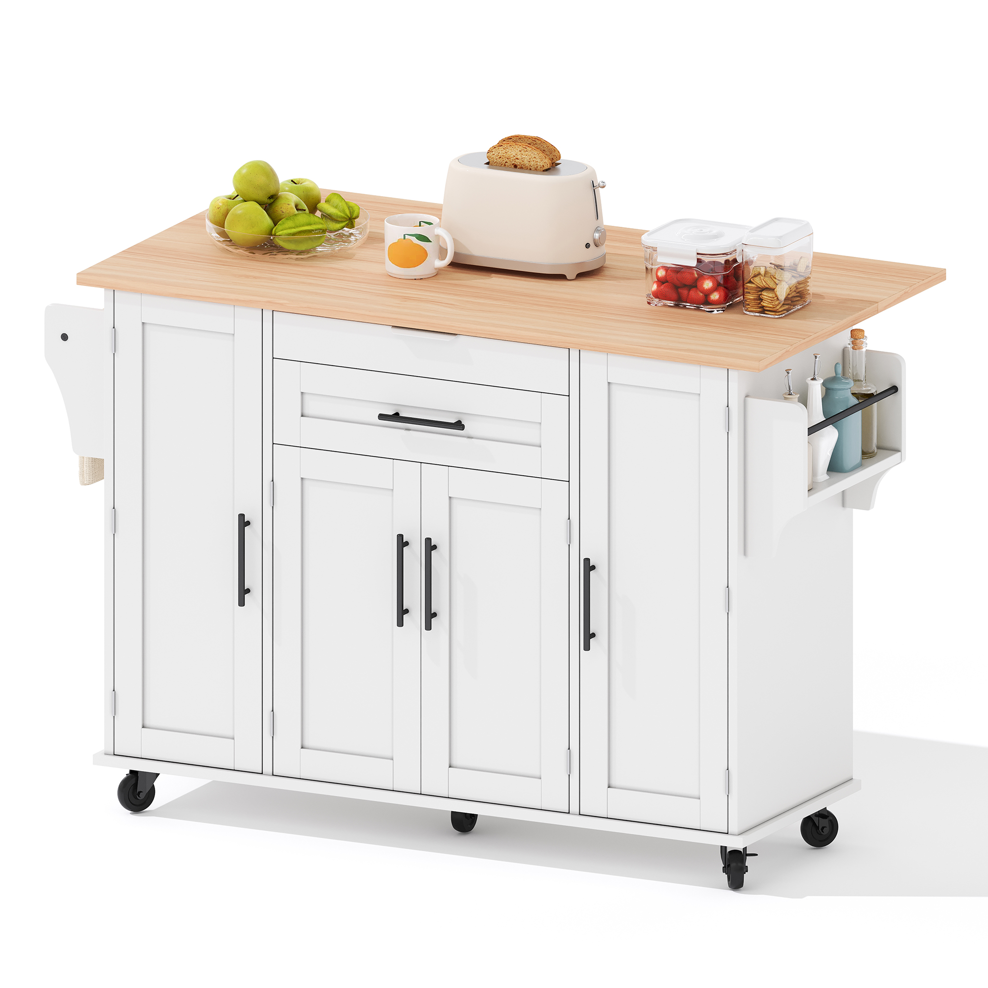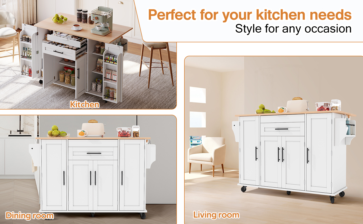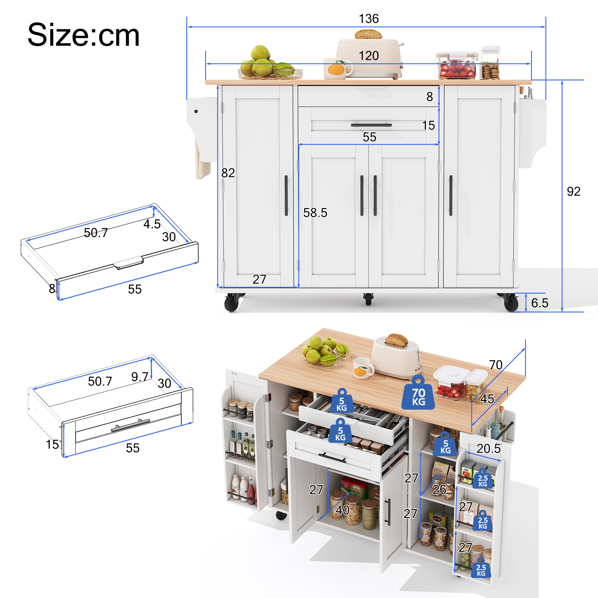 Product Name:129x46(71)x91cm Kitchen island on wheels, with foldable tabletop, adjustable shelves, rolling trolley with storage cabinets and 2 drawers, for the dining room