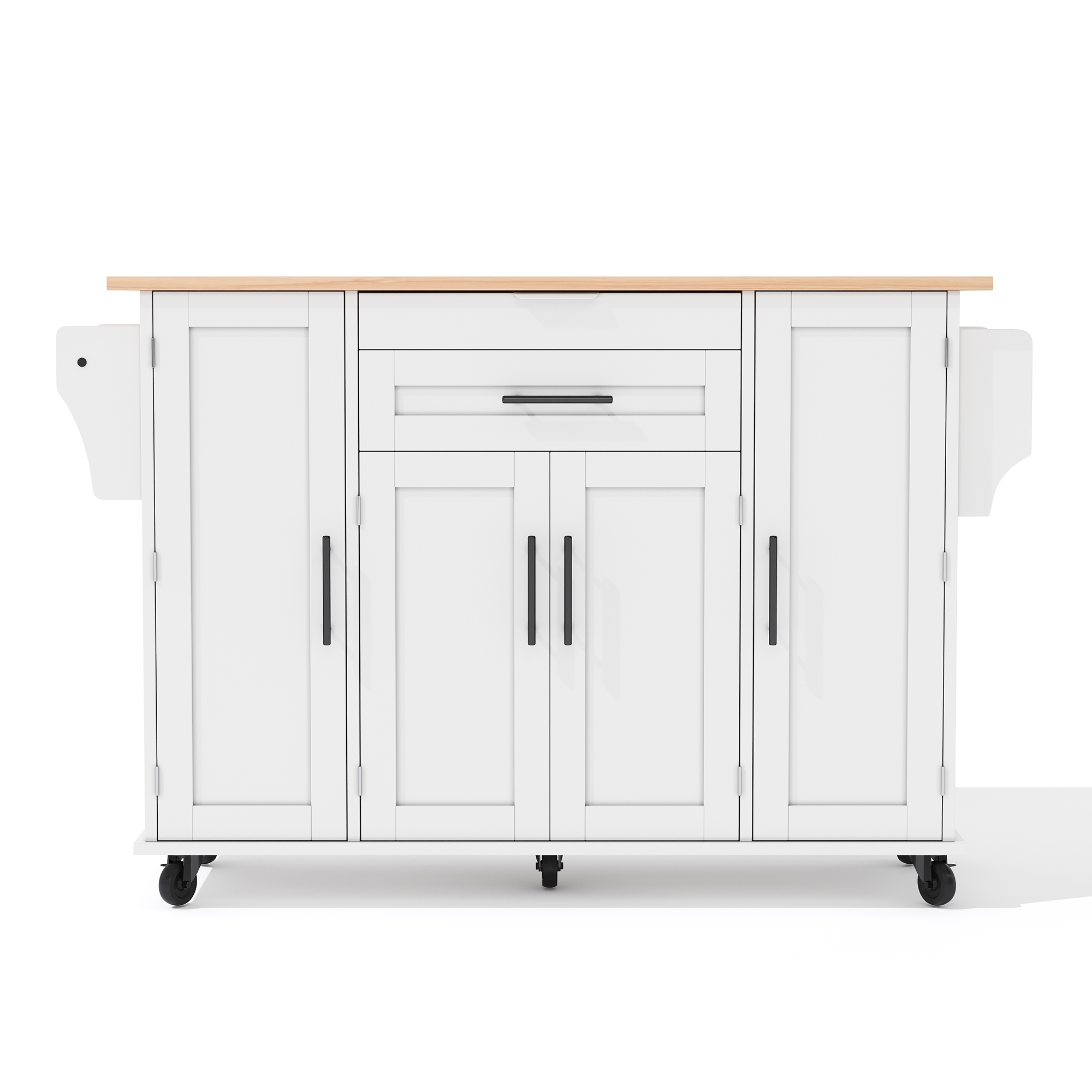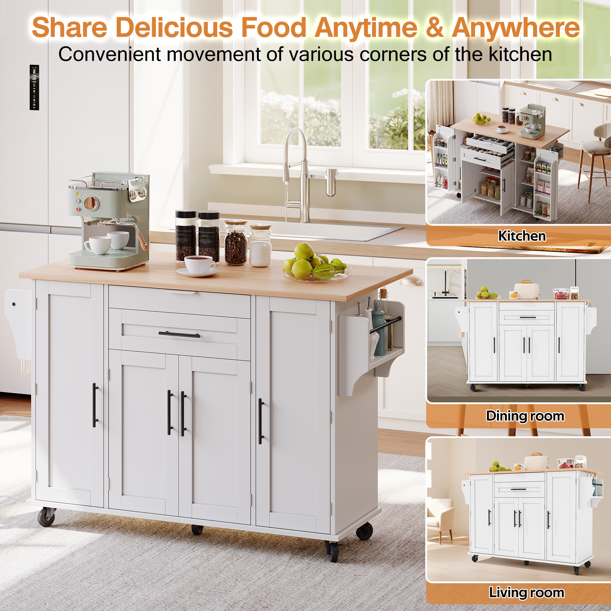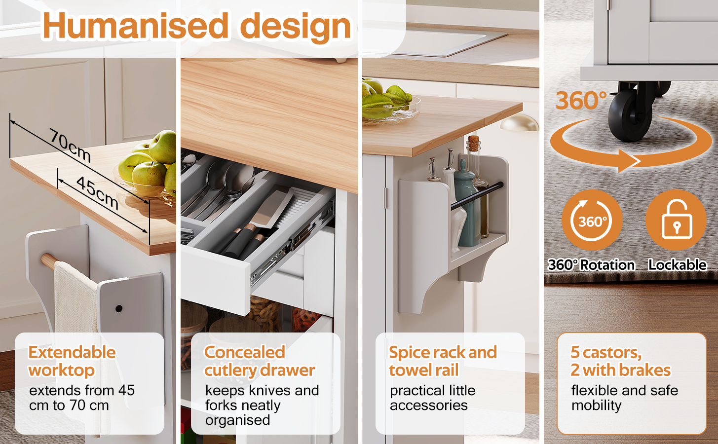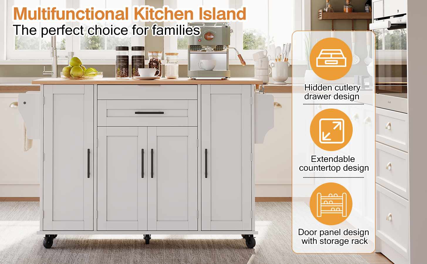 Product Name:129x46(71)x91cm Kitchen island on wheels, with foldable tabletop, adjustable shelves, rolling trolley with storage cabinets and 2 drawers, for the dining room