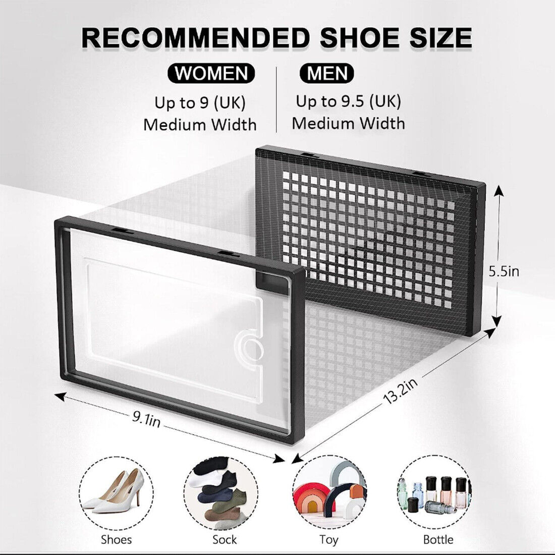 - PRODUCT SPECIFICATIONS: Applicable Size: 13.2” x 9.1” x 5.5” - Suitable for women's shoes up to size 9 and men's shoes up to size 9.5. Please ensure you measure your shoes before purchasing to find the suitable shoe box size.
