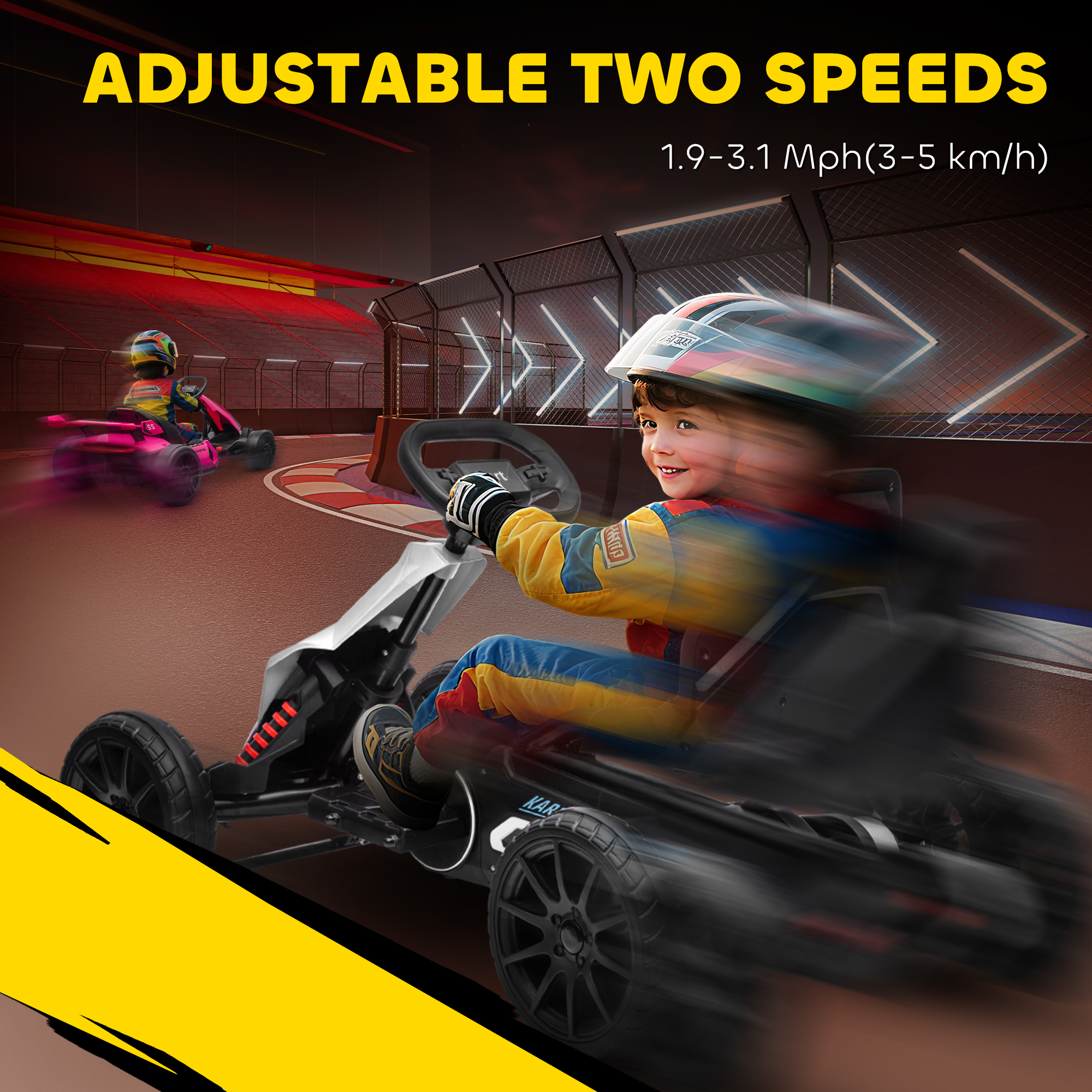 Unleash the fun with our Aosom electric go-kart for kids. Reaching speeds up to 3.1 Mph (about an adult's walking speed), it offers safety and excitement. EVA wheels conquer any terrain for fun indoors and outside. Thanks to a two-point safety belt and supportive backrest, your child will stay secure on the road while making wearing a seat belt a universal rule. It drives forward and backward, opening up a world of play possibilities. Let your child's imagination roam with a thrilling ride.