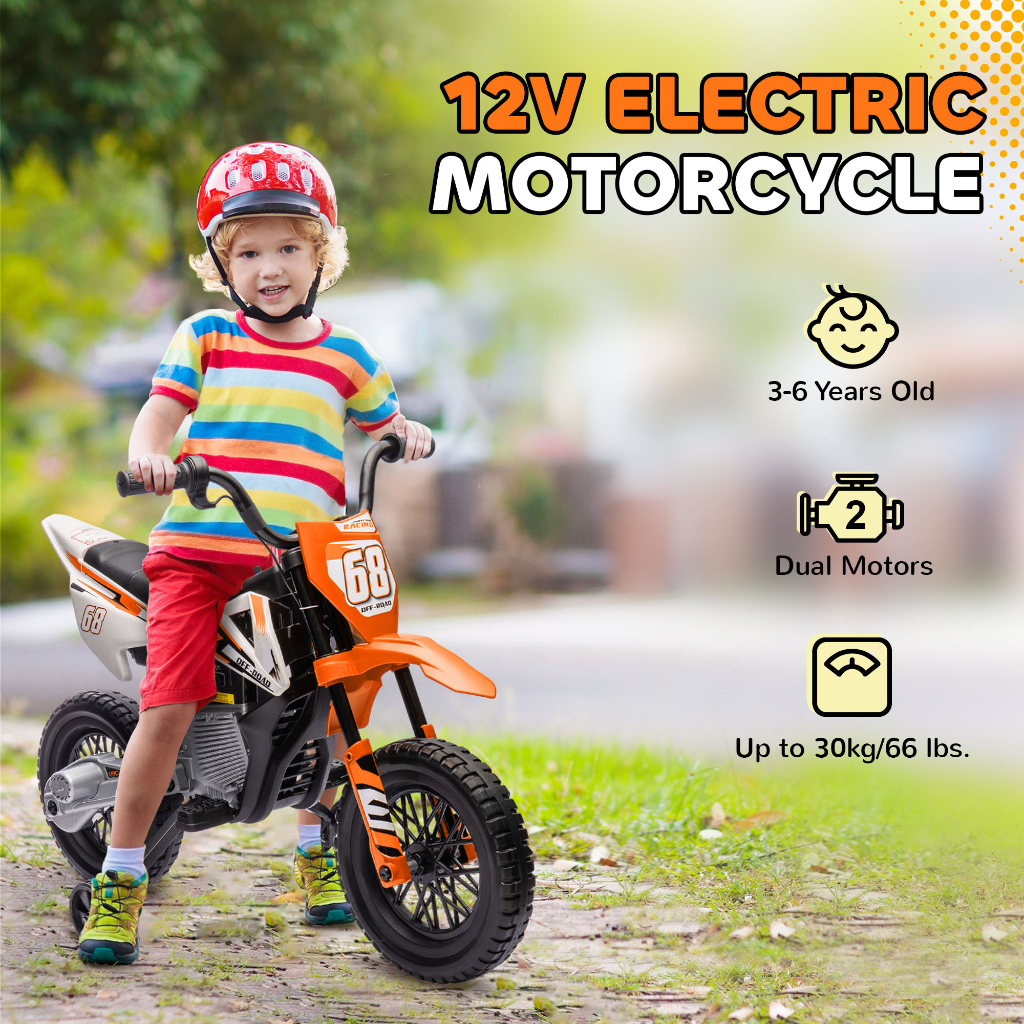 12V Kids Electric Motorbike, Kids Electric Ride On Motorcycle W Twist Grip Throttle, Training Wheels, Orange