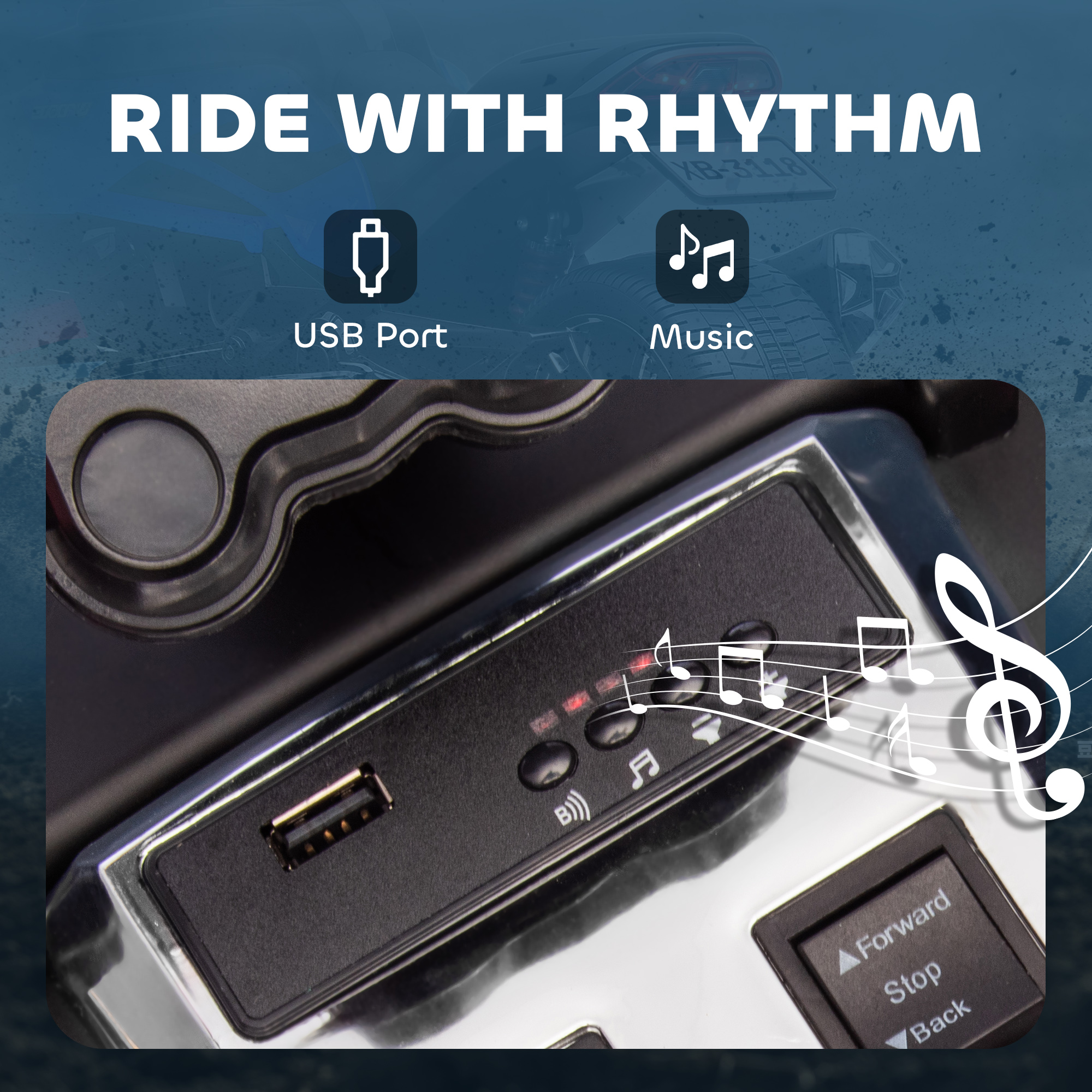 Adventures start with the kids electric ride on ATV – a cool reverse trike design that makes kids feel like real explorers. Two 12V motors and suspension keep rides smooth at 3–5km/h. Built-in USB lets them play their favourite songs, while front and rear LED lights light the way for added fun and realism. It's a ride made for excitement, confidence and imagination.