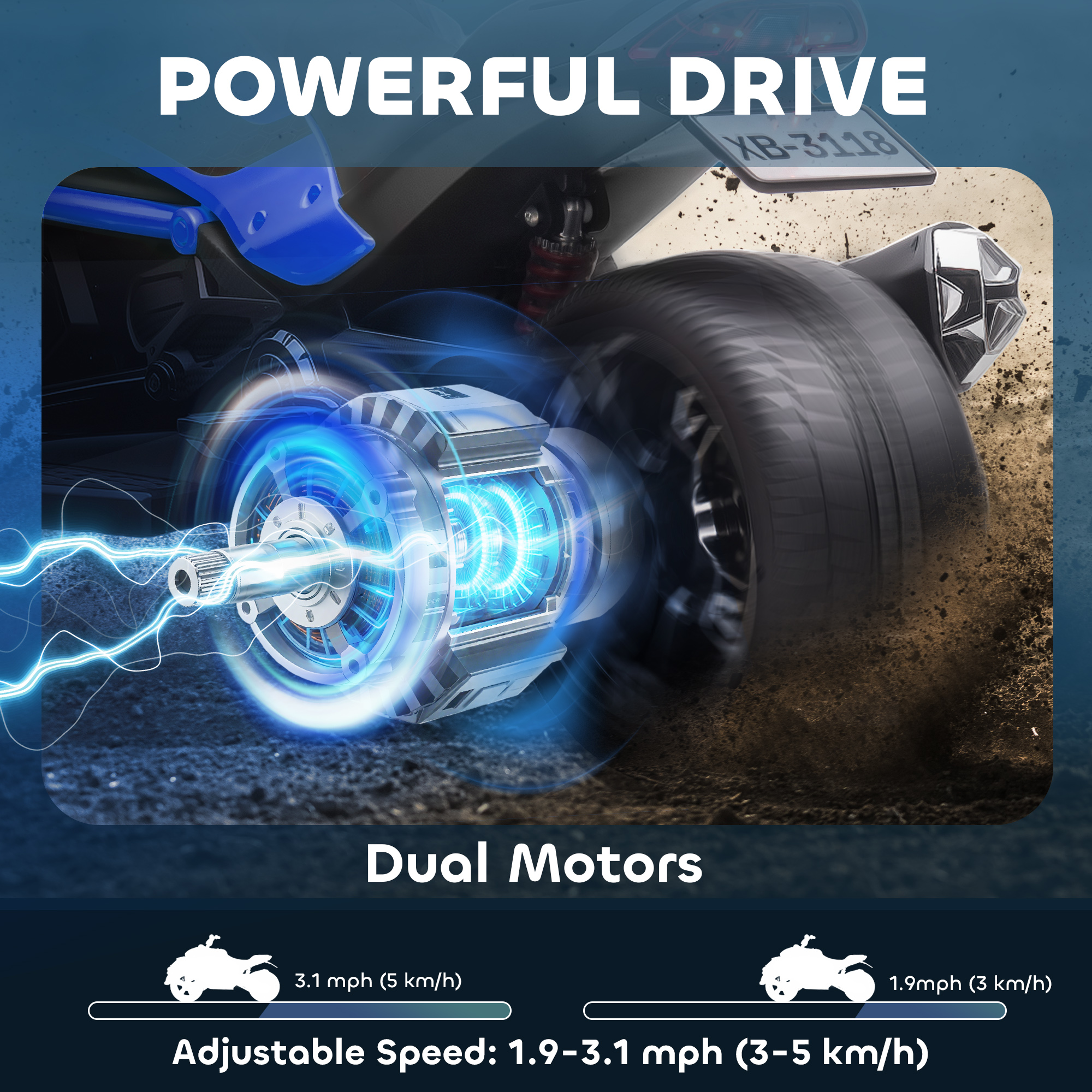 • Two 12V motors and independent suspension rides smoothly on all terrains