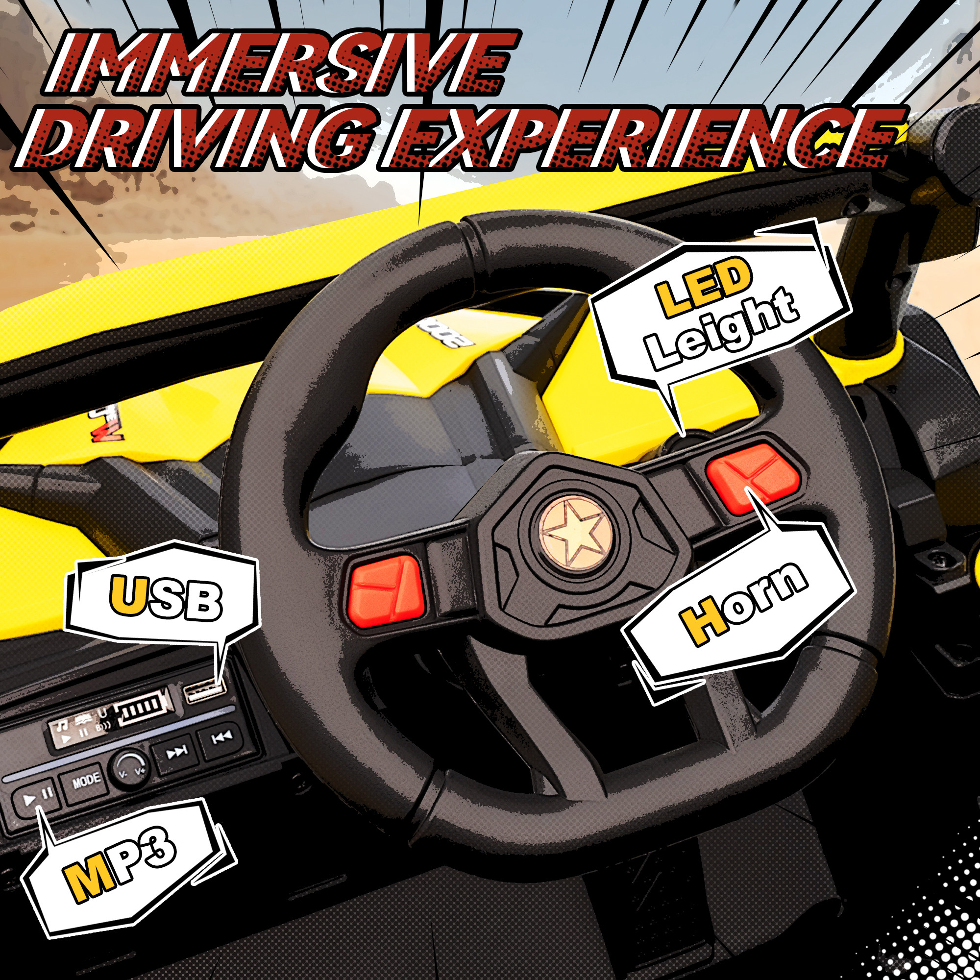 A fantastic ride for children, this exciting kids electric UTV is great for ages 3-5 years. Powered by two 12V motors, it offers 3-7km/h speed and up to 45 minutes of fun per charge. Both kids and adults can control it, with two speeds for kids and three speed for the remote control. Security features include a gentle slow-start and a two-point seatbelt. It has LED lights, a horn, music buttons and a USB port for a memorable ride experience.