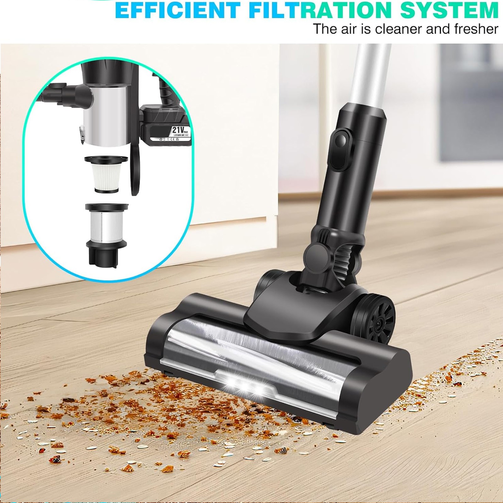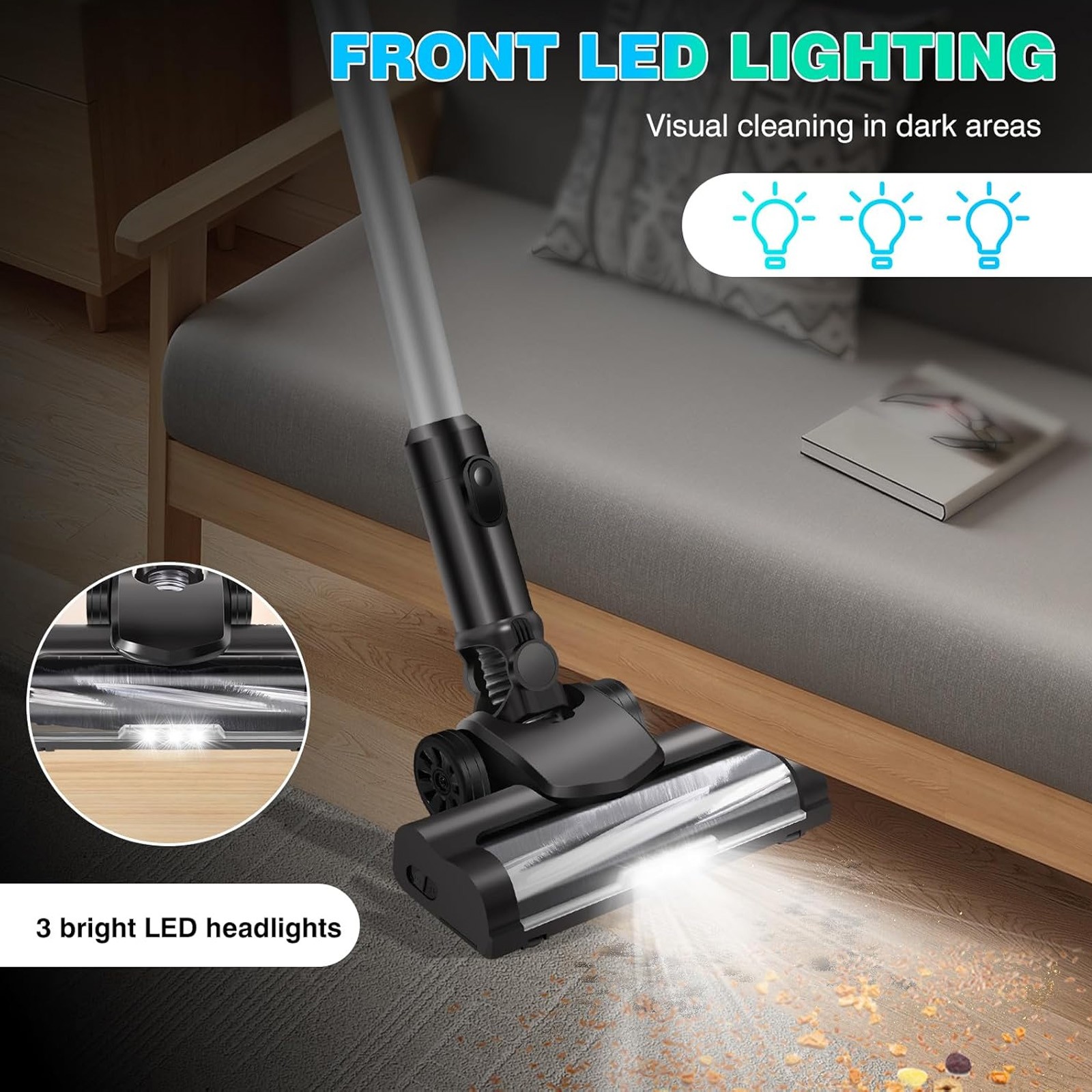 Bright LED lights on the cordless vacuum head make it easy to see dirt and debris in even the darkest corners of your home, so you can clean with precision.