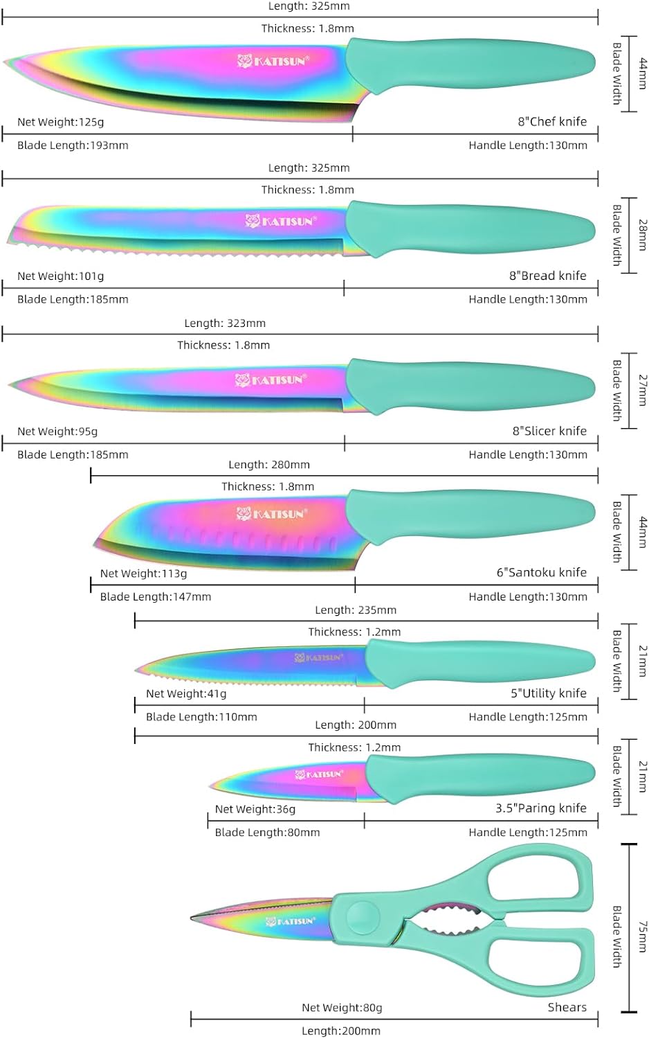 • 【Art of Precision Cutting】13-piece blue knife set includes 7 knives and matching knife covers; knives include 8-inch sheathed chef's knife, 8-inch sheathed bread knife, 8-inch sheathed Slicing Knife, 6-inch sheathed Santoku knife, 5-inch sheathed Utility Knife, 3.5-inch sheathed fruit knife, and scissors