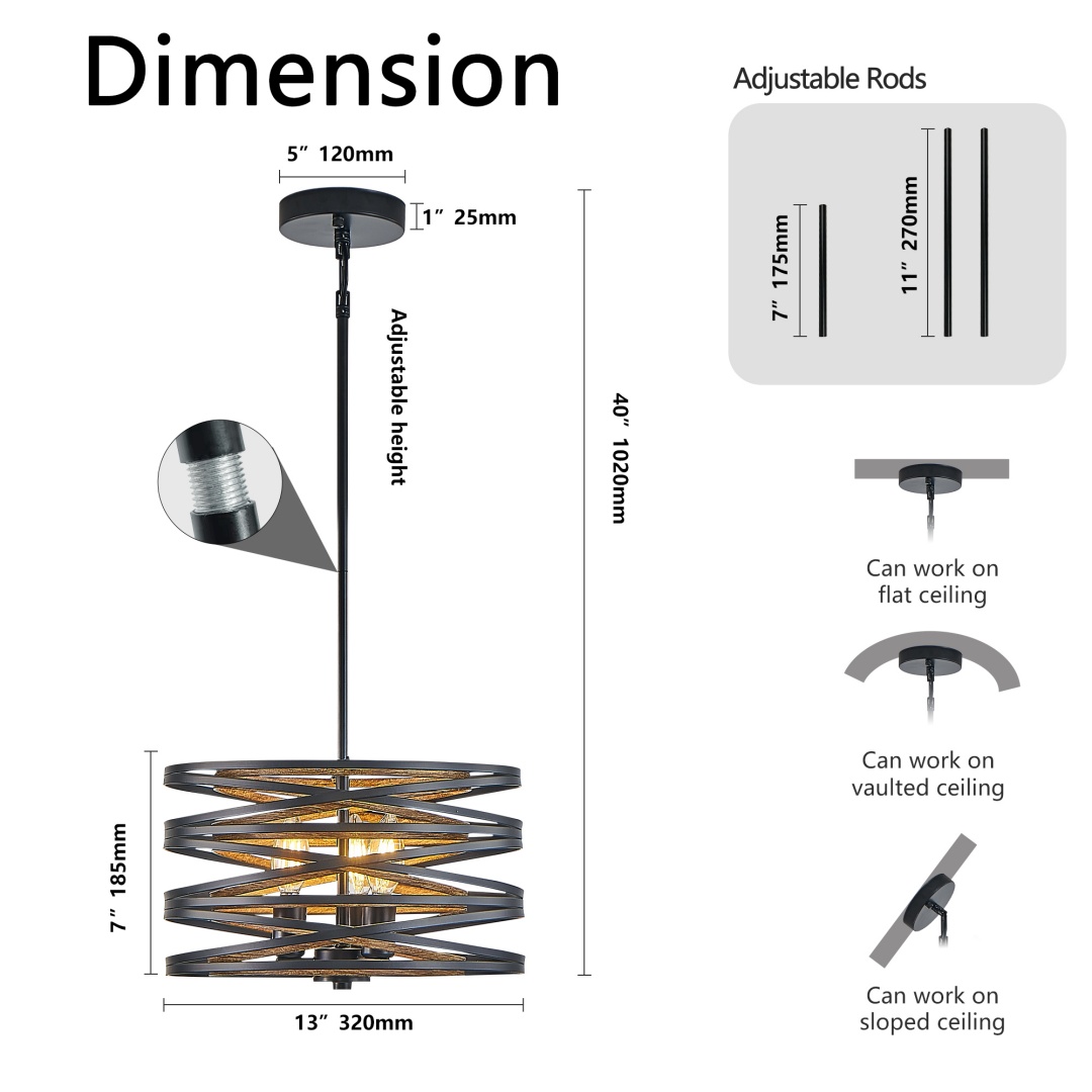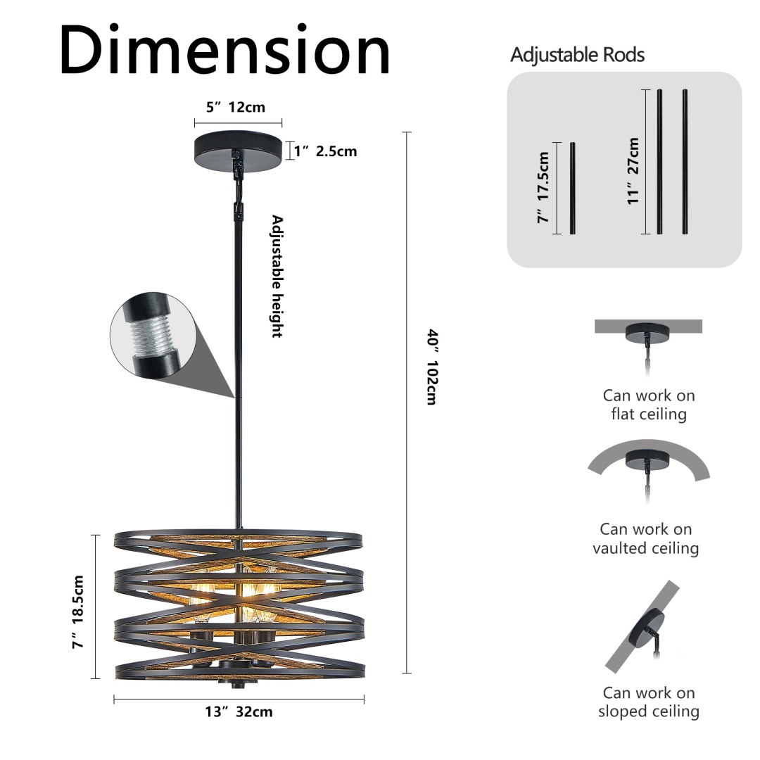 Unique design: The combination of black metal and wooden elements creates a rural industrial style, combining modern and retro aesthetics, adding unique decorative elements to the home.Multi lamp head design: 3 lamp heads provide sufficient lighting, soft light, and create a warm atmosphere, suitable for dining areas, kitchen island tables, or living rooms.Height adjustable: Comes with adjustable suspension rods to adapt to different ceiling heights and meet various home needs.Compatible with multiple light bulbs: Supports E12 lamp sockets, compatible with LED, incandescent, and energy-saving lamps (bulbs need to be purchased separately), users can choose different light sources according to their needs.Easy to install: With simple installation steps and complete installation accessories, installation can be easily completed without professional skills.