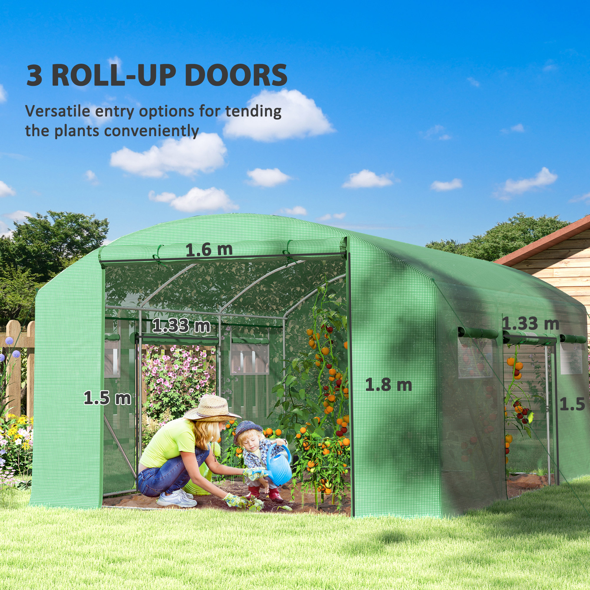 Year-round gardening with plenty of space and protection, with this polytunnel greenhouse. Three roll-up doors and multiple mesh windows allow easy access and plenty of fresh air. Fitted with a 140gsm plastic cover for a protective shell - shields inside fromlight weather and allows sunlight to pass through for beautiful growth. Complete with four ground stakes and four guy ropes in the package to pin greenhouse to the ground.
