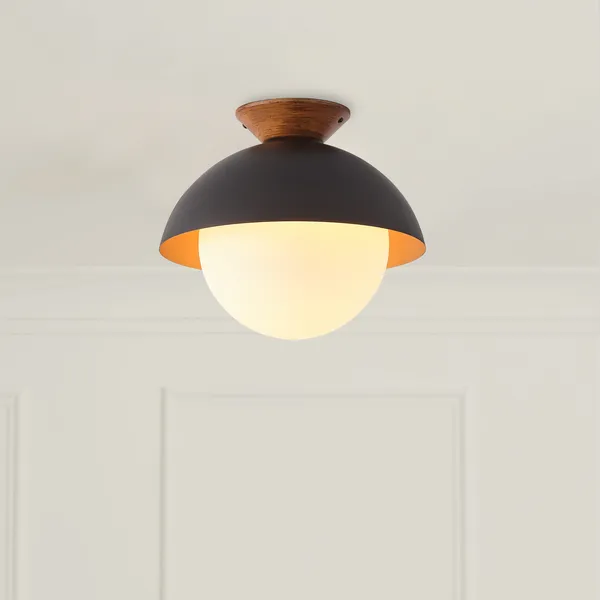 13.5 In. 1-Light Wood Gold Leaf Dome Semi-Flush Mount Light With Opal Glass Globe - 13.5 In. W X 11.4 In. H - Gold Leaf/White