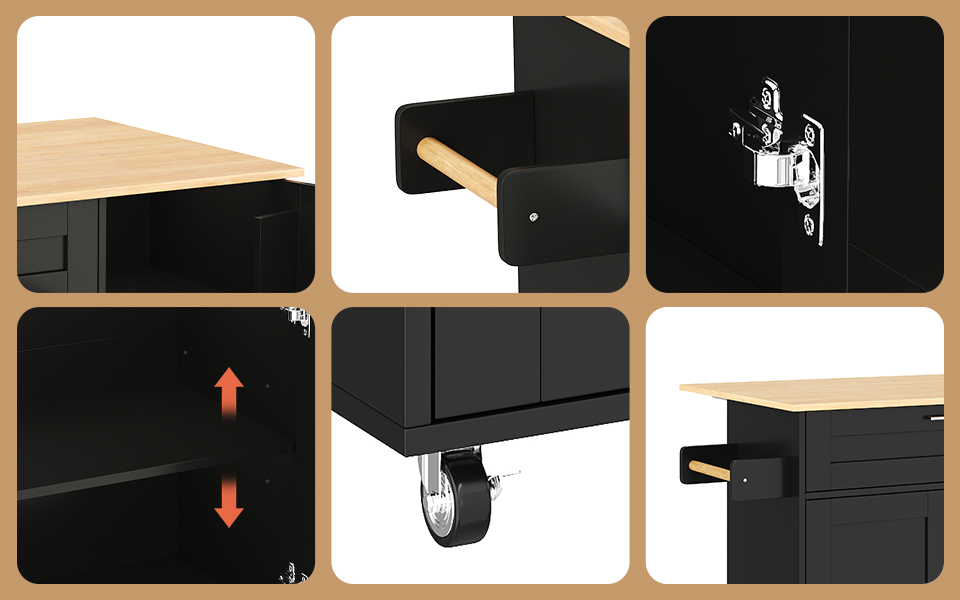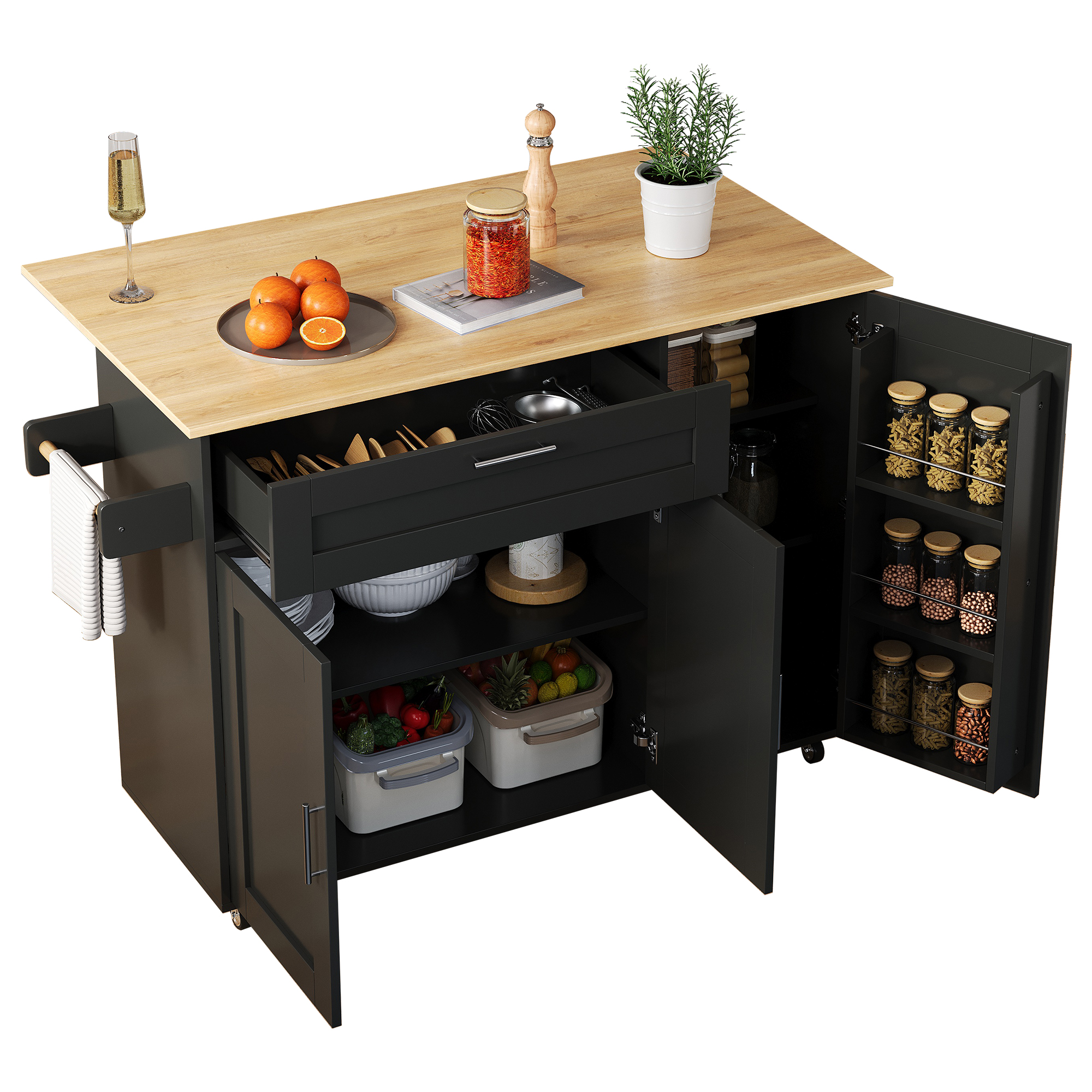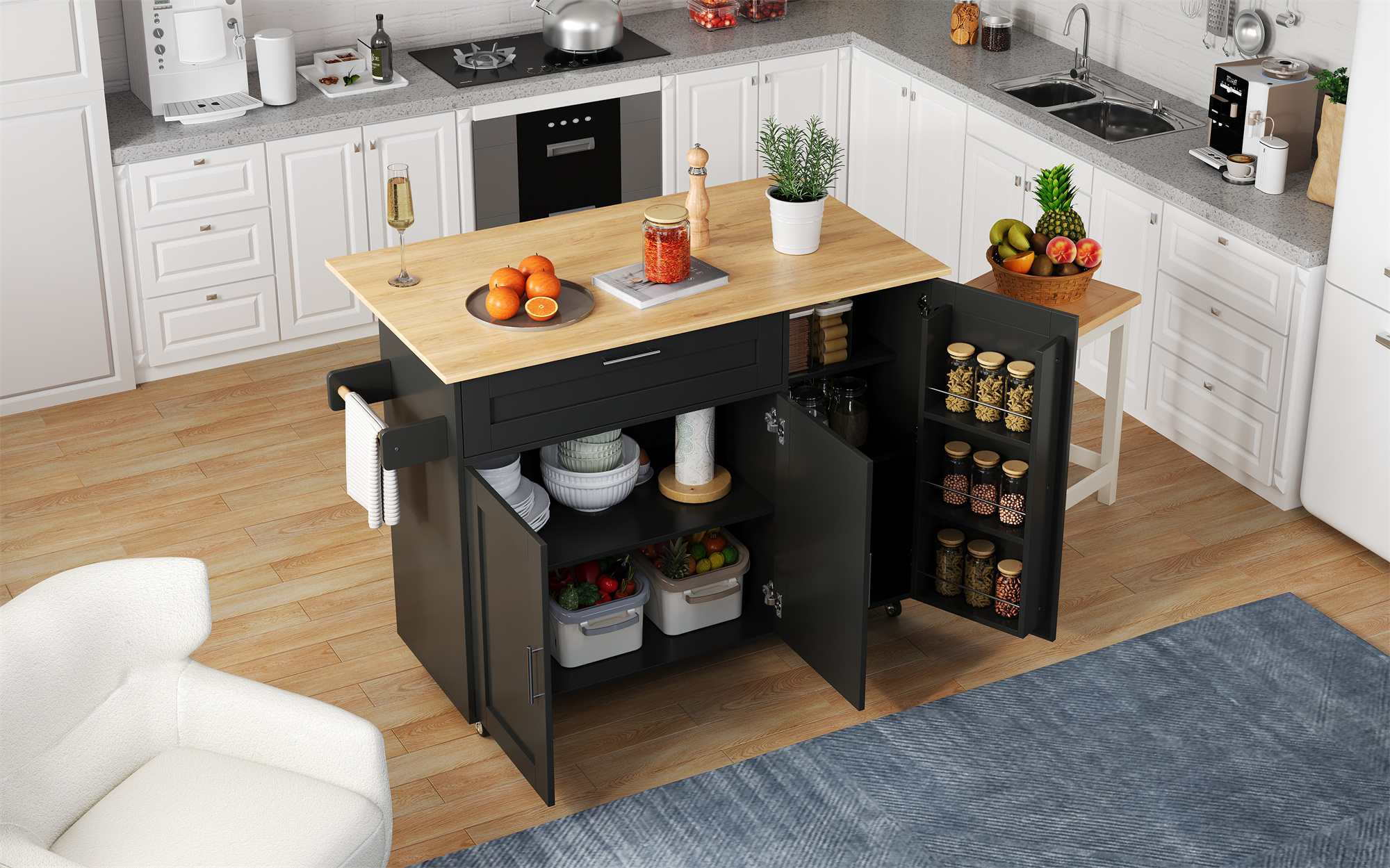 Product Name:132.5*44(70)*90cm Kitchen Island on Wheels, Rolling Storage Trolley with Foldable Tabletop, multifunctional cabinet, spice rack, towel holder, 5 wheels, suitable for kitchen/dining/house