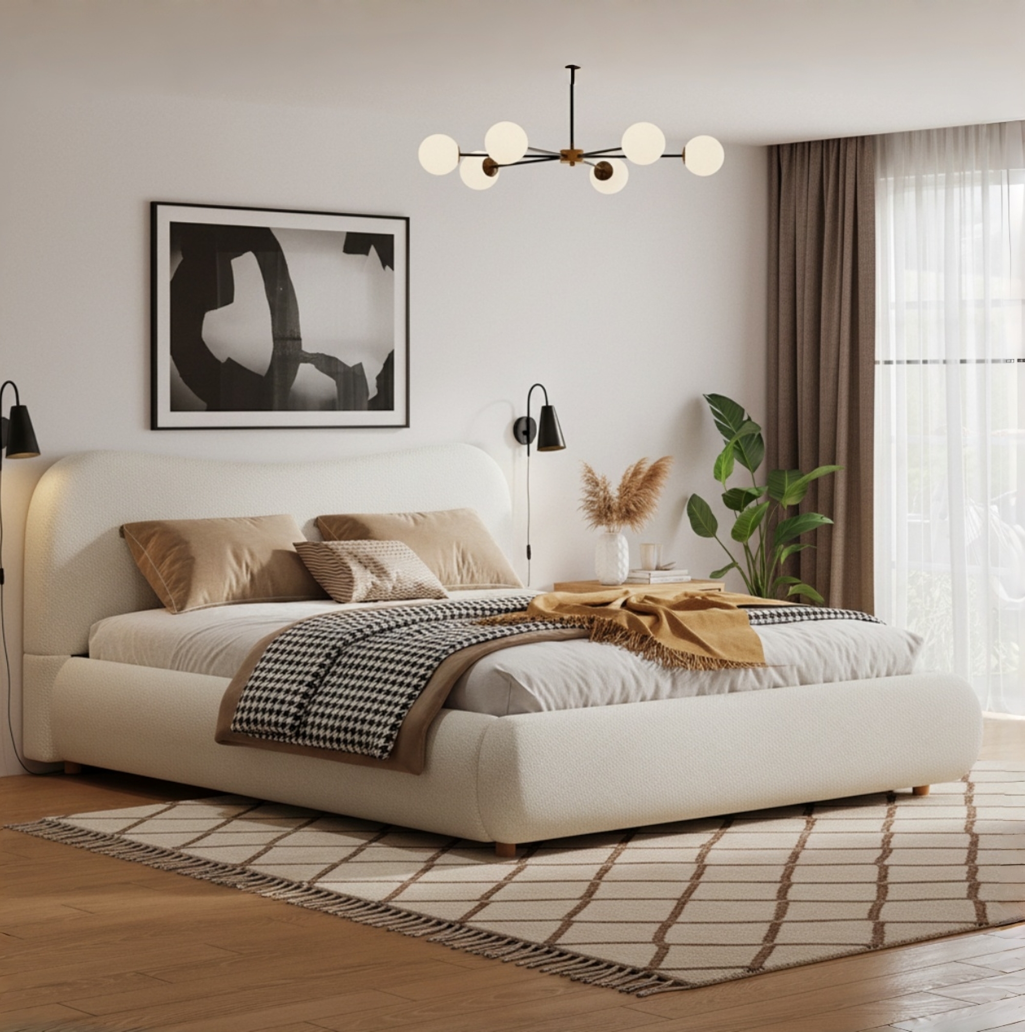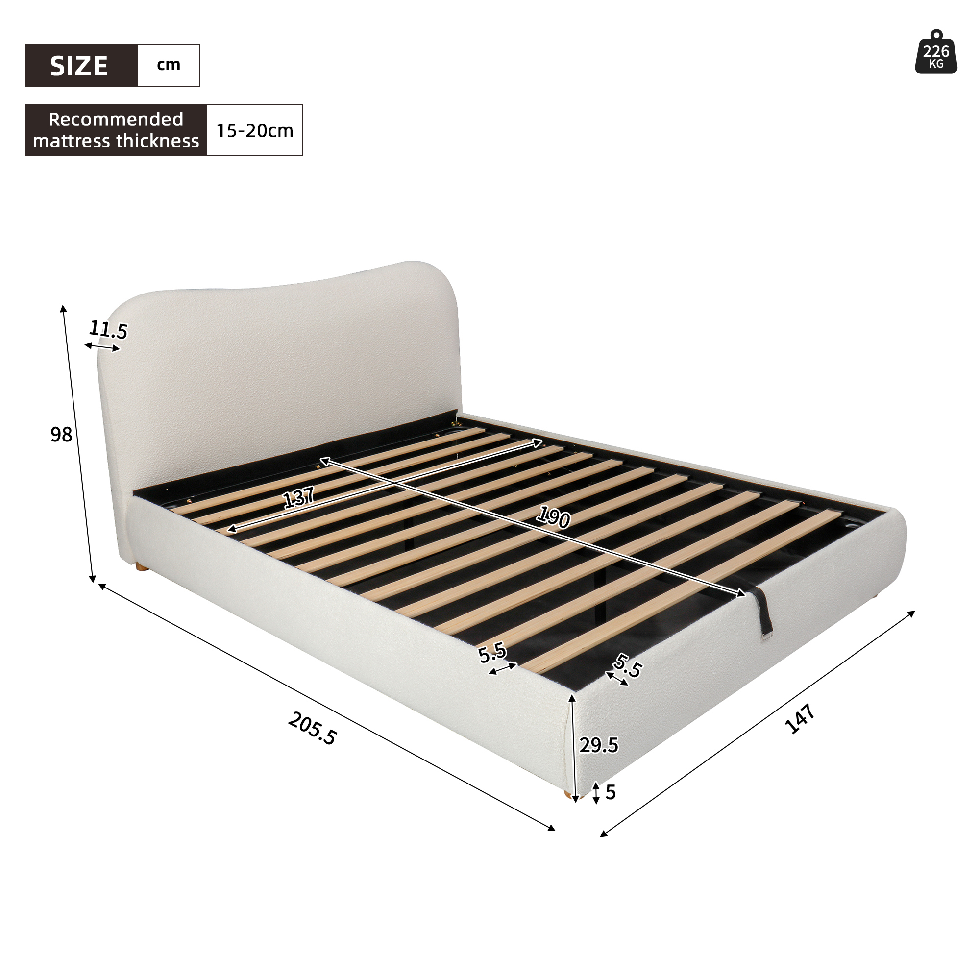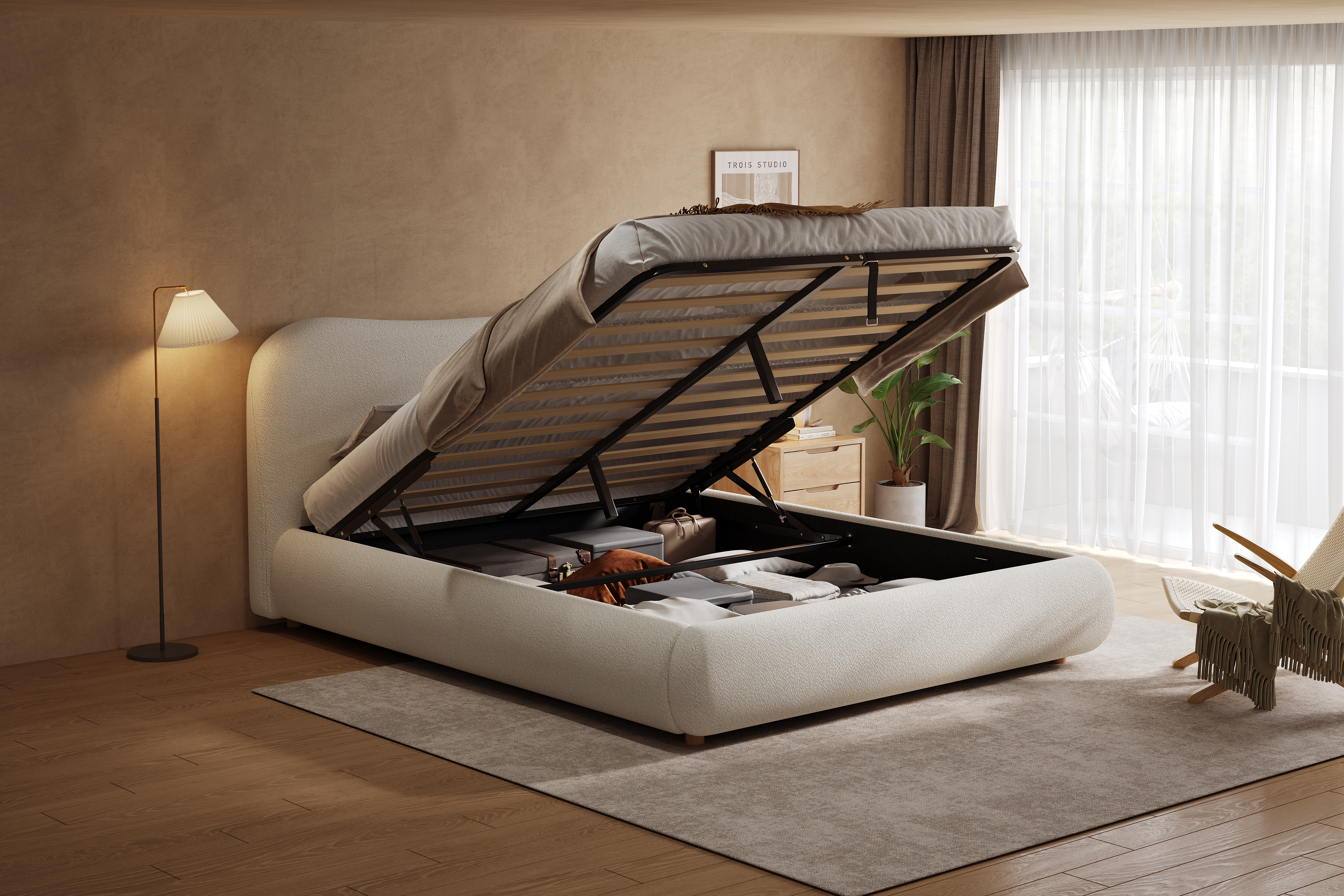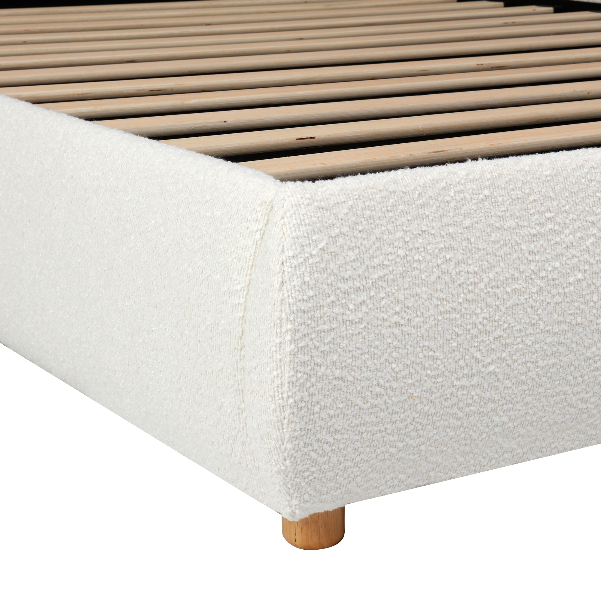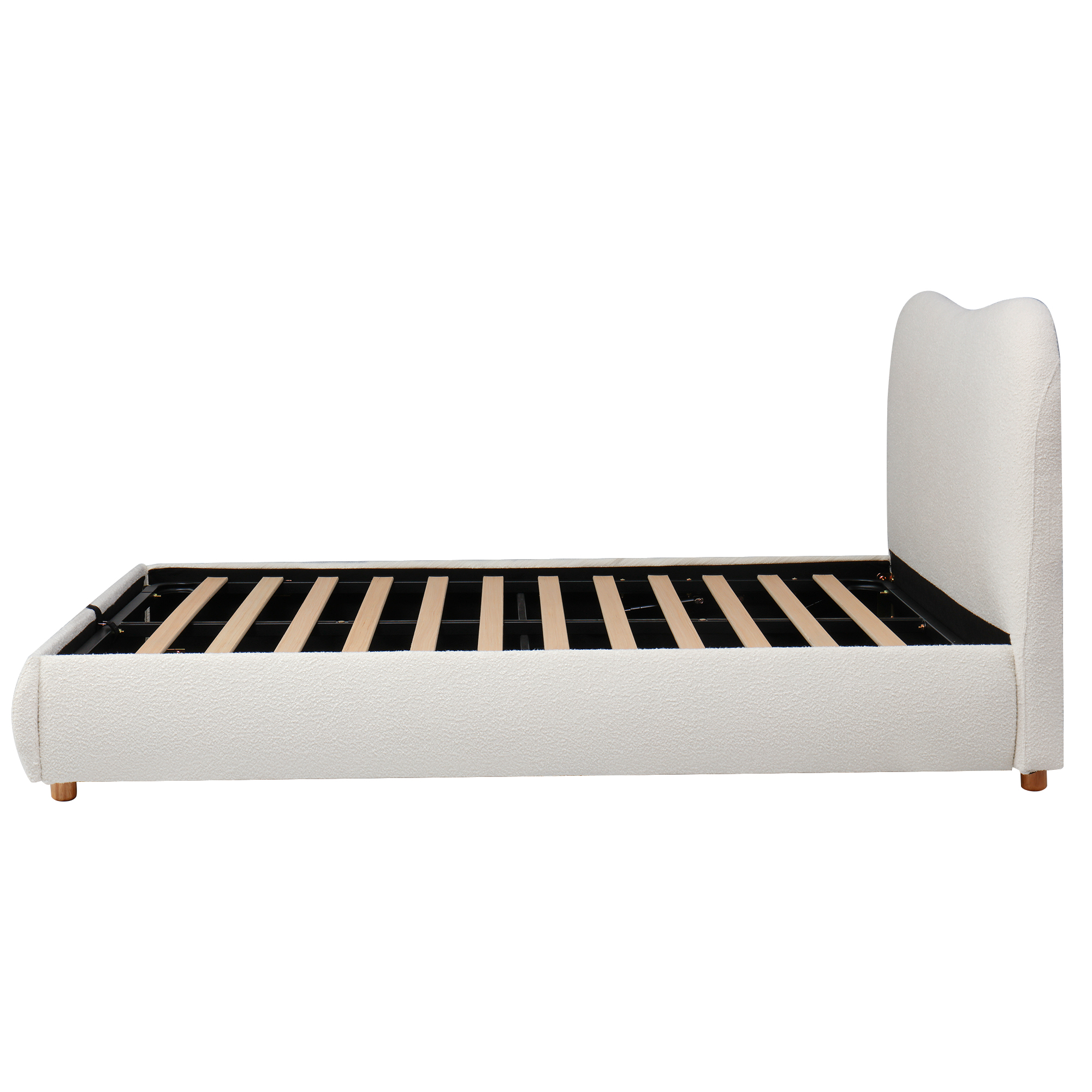 Product Name:135x190cm 4ft6 Ottoman Storage Bed Frame with Curved Shaped Headboard, Soft Rounded Corners, Double Upholstered Bed Frame with Boucle Fabric, Warm White