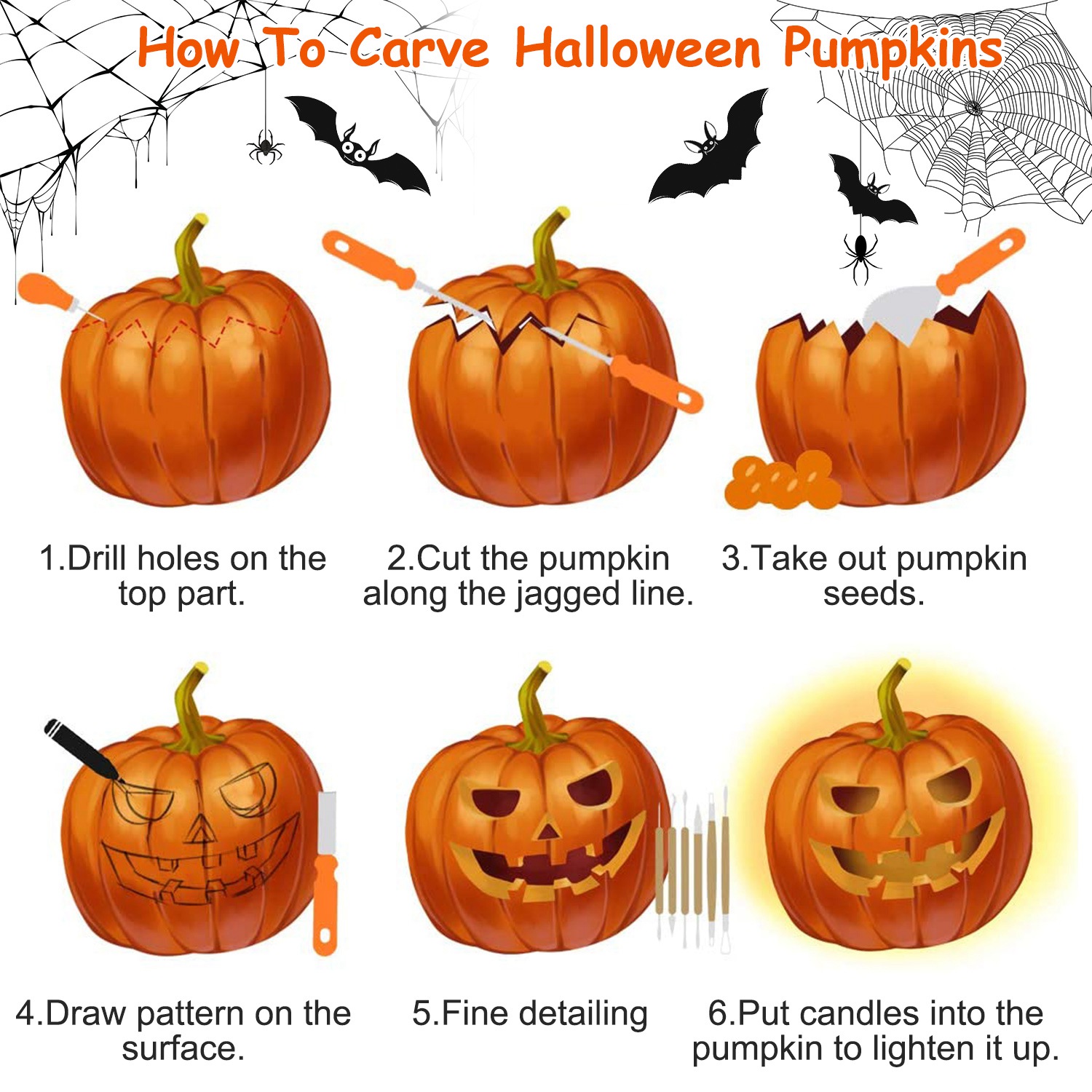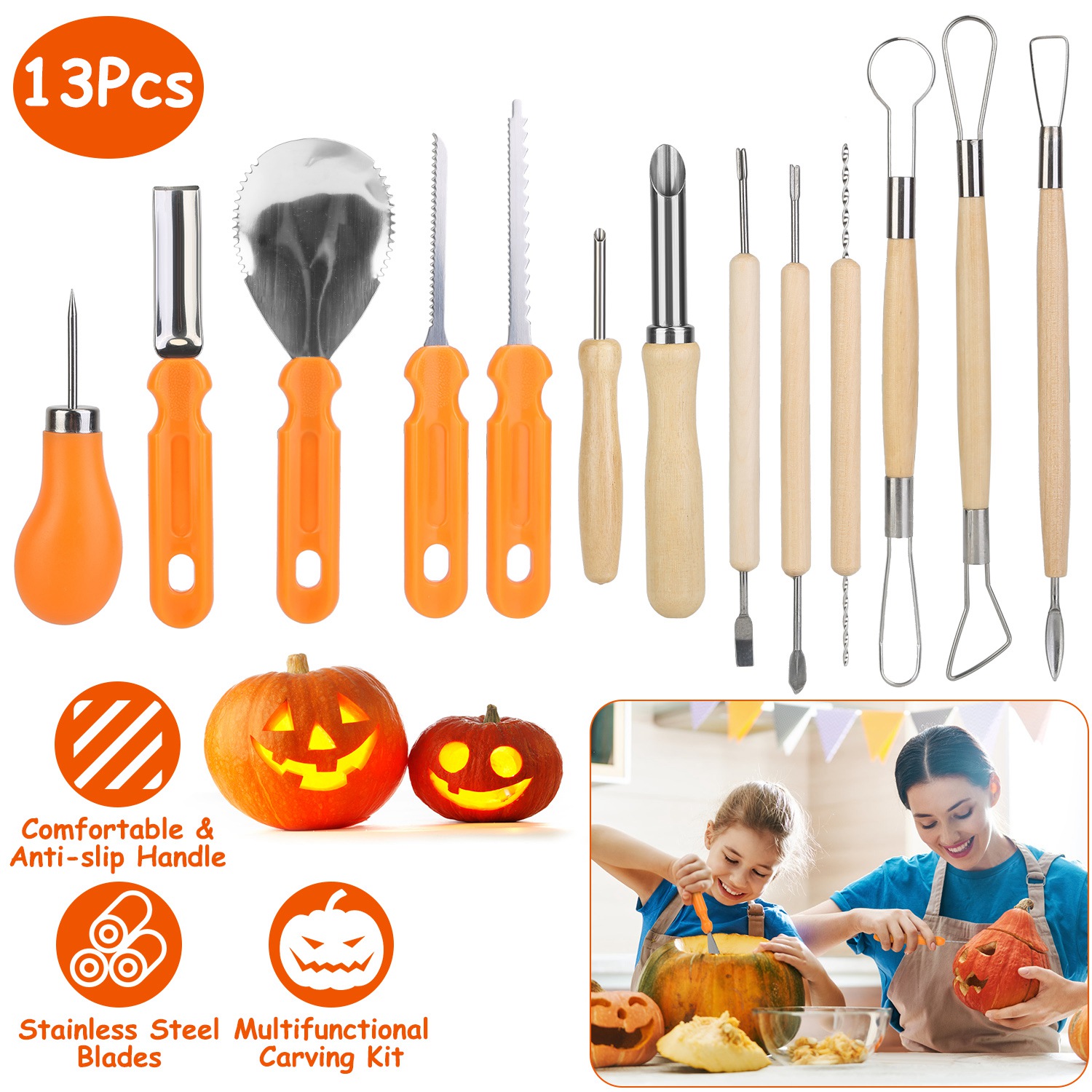 • *All-In-One Carving Kit*:This 13pcs pumpkin carving kit features a scooper,a drill,etching tools,double-sided and fine-toothed saws,double-sided sculpting tools. You get everything you need for cutting,slicing,sawing,scooping,etching the perfect pumpkin to display in or outside your home.