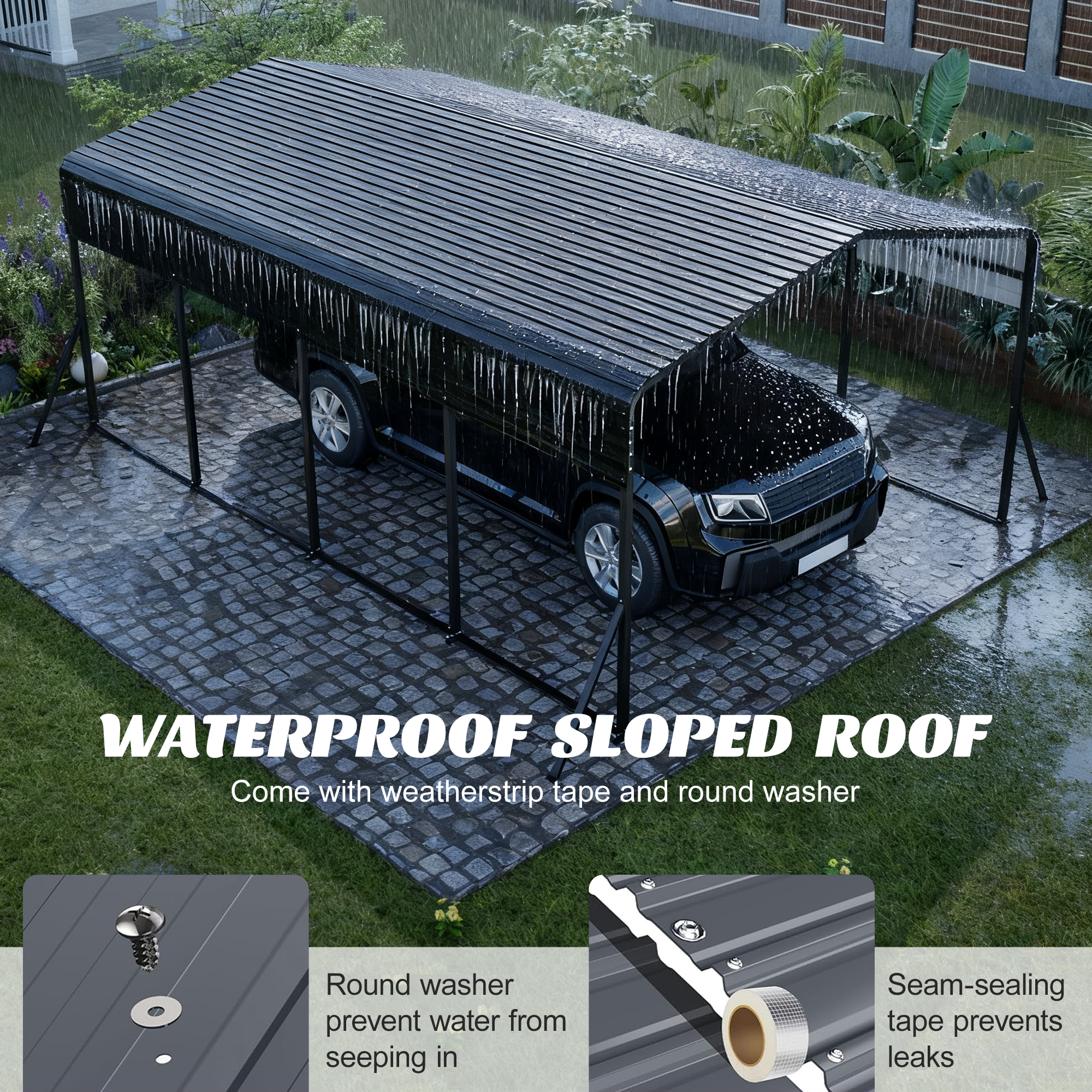• **【Spacious and Sturdy, Professional Protection】**This heavy-duty 13x20 ft carport features a metal frame with a sloped roof for quick drainage. Its reinforced triangular structure and four support pillars provide stable shelter against wind, rain, and snow, reliably protecting your vehicles and equipment.