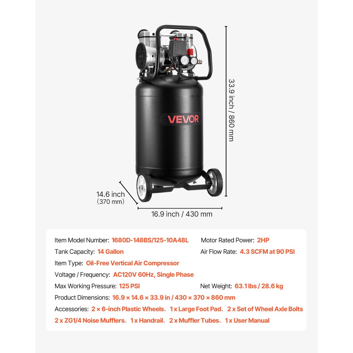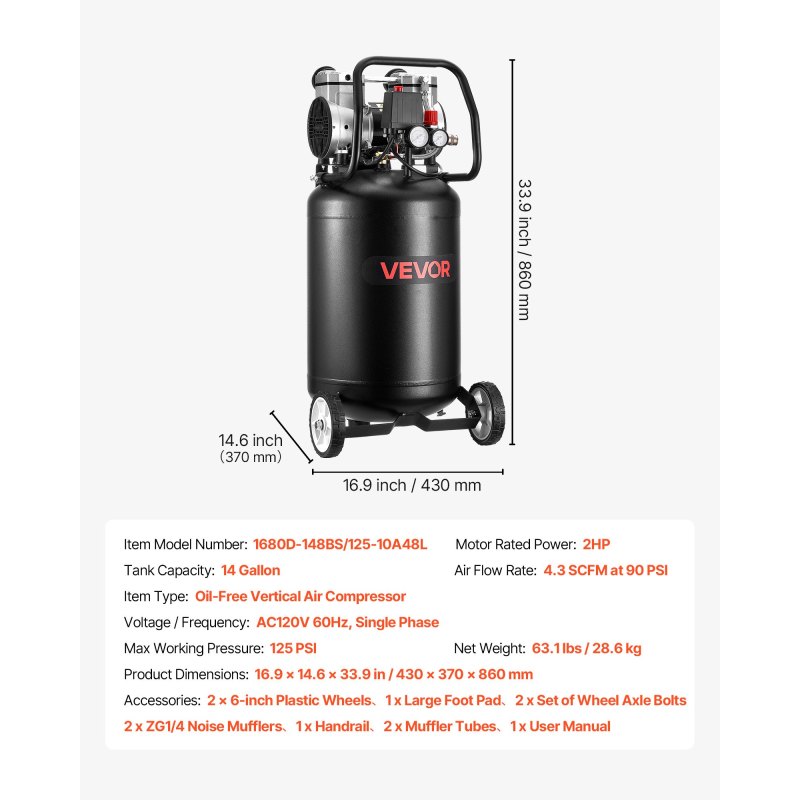 Powerful Performance: VEVOR 14-gallon air compressor features a 2 HP motor, delivers a 4.3 SCFM at 90 PSI flow rate, and reaches 125 PSI max pressure in as fast as 2.97 minutes — ensuring quick, steady, and efficient air delivery for pneumatic tasks
