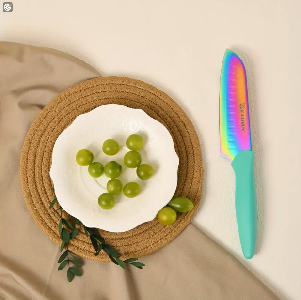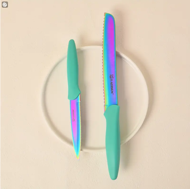 14-Piece Rainbow Colored High Carbon Stainless Steel Kitchen Knife Set, Titanium Coated Blade, Rust-Free & Super Sharp, Flatware Set With Wooden Stand & Kitchen Scissors, For Family & Restaurateurs
